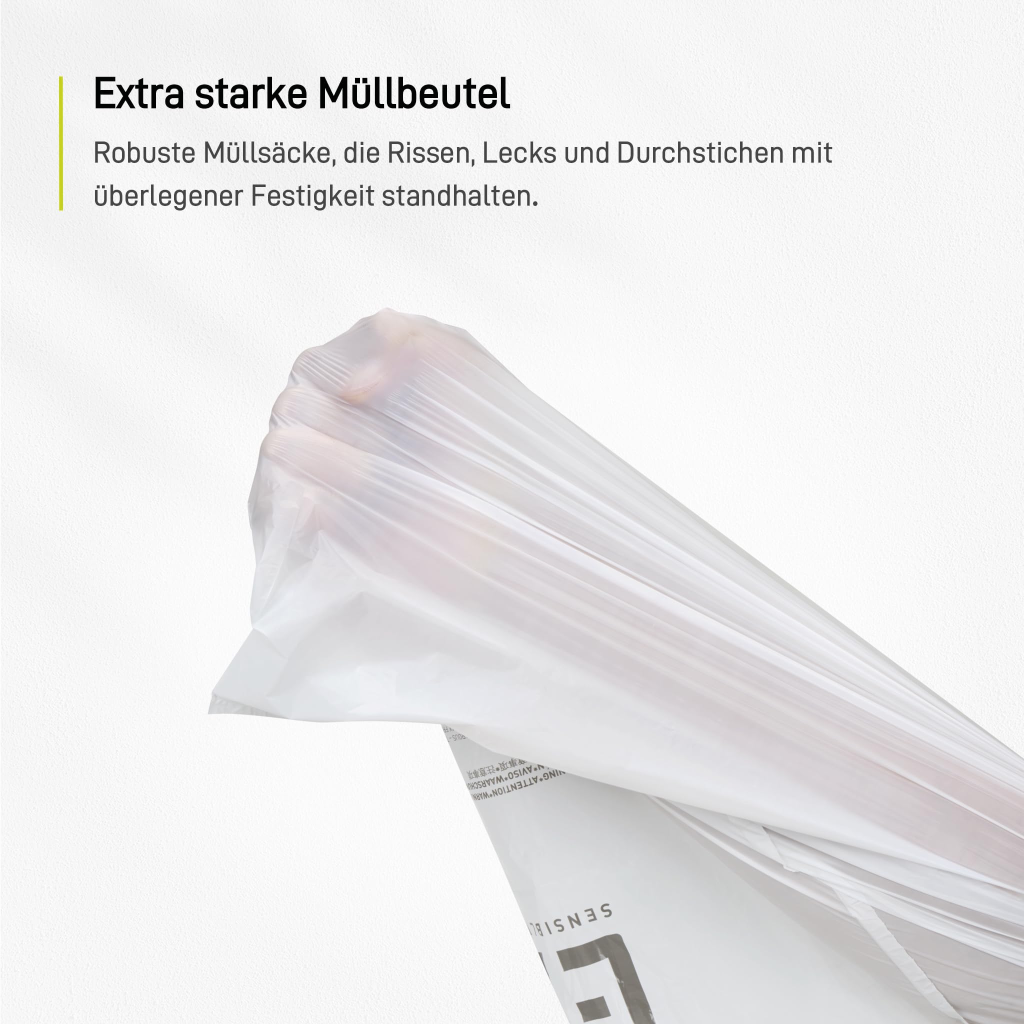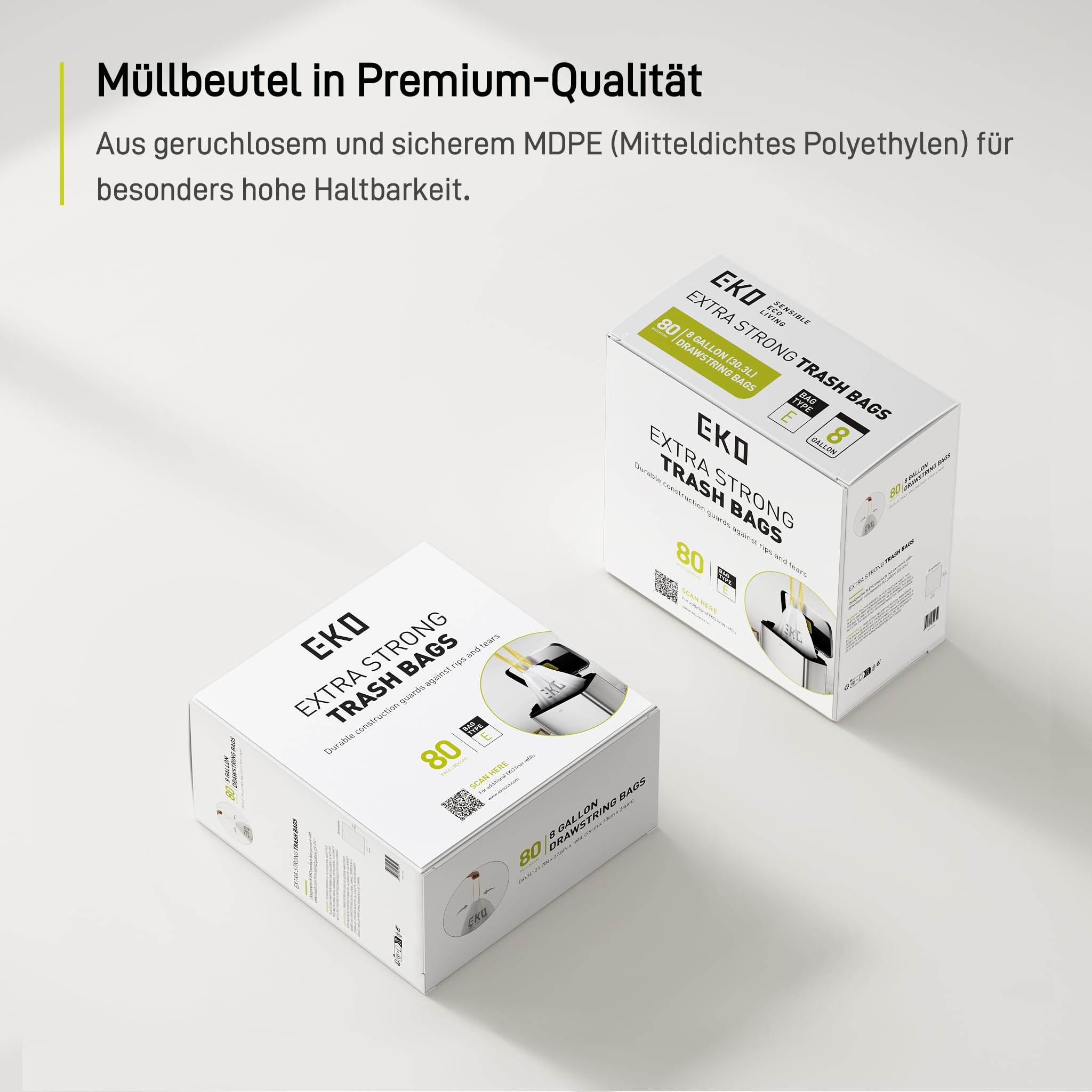 EKO reissfest Müllbeutel mit Zugband, 25-35 Liter Müllsäcke, 80 Beuteln, extra starken, Schnellzugriffsbox, Auslaufsicher Mülltüten für sicheren Halt am Mülleimer, weiss, Grösse E