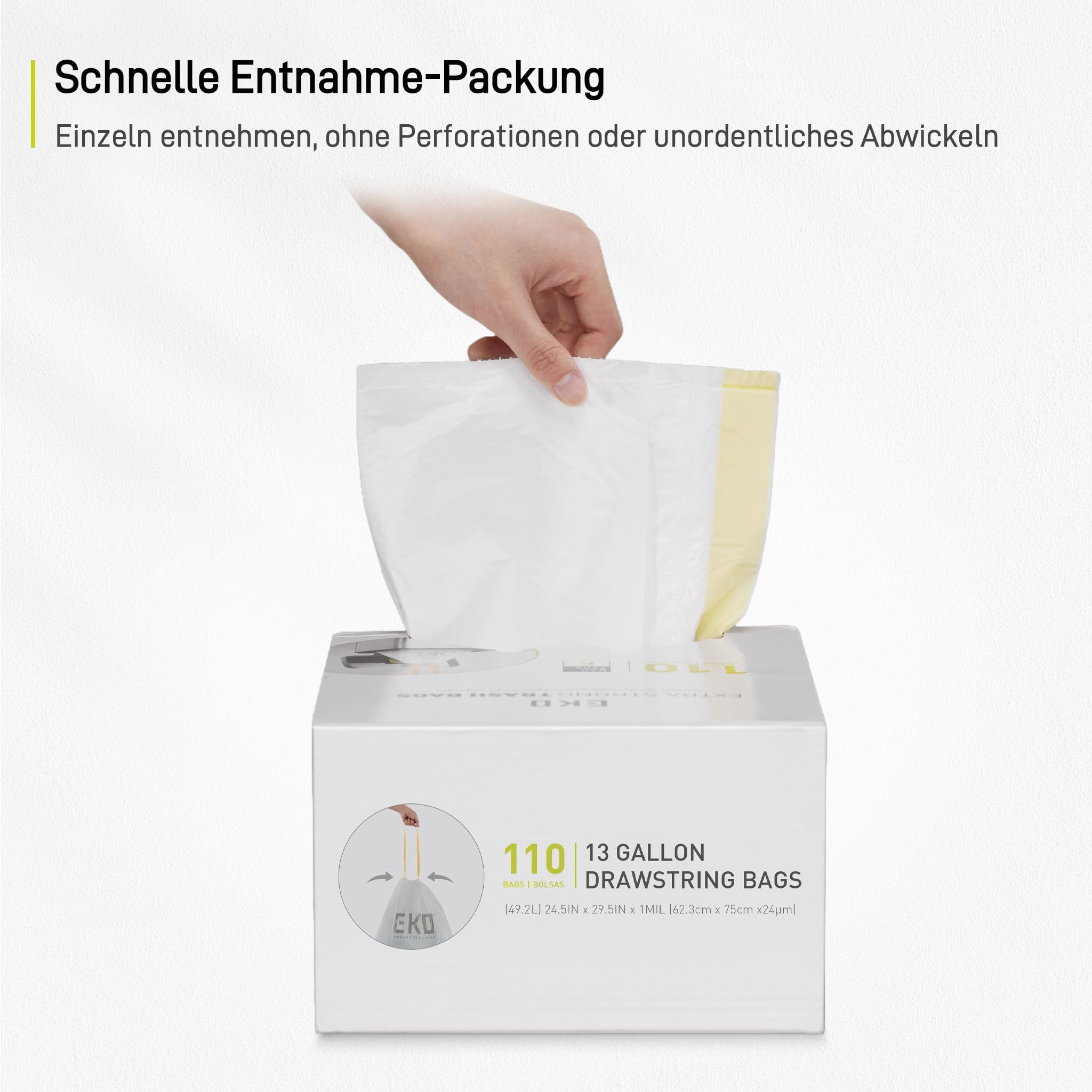 Diese 30.3L mülltüten sind 25 % haltbarer mit einer äusseren Auslaufschutzschicht und einer inneren Schicht, die sich dehnt, um Risse und Löcher zu verhindern. Der Zugbandverschluss sorgt dafür, dass der Beutel an seinem Platz bleibt. Diese grossen Küchenmüllbeutel mit doppelt genähten Seitennaht und einem verstärkten Boden passen in mittelgrosse Mülleimer und eignen sich ideal für Badezimmer, Schlafzimmer, Büros, Kinderzimmer und Waschräume. Das Zugbanddesign erleichtert das Anheben, Binden und Tragen. Diese Müllbeutel kommen auf einer praktischen 100er-Rollverpackung, sodass keine mühsame Suche nach einem Ersatzbeutel nötig ist. Diese extra starken Abfallsäcken sind speziell für EKO-Mülltonnen konzipiert, eignen sich jedoch auch besonders gut für Recyclingtonnen mit mehreren Fächern. Verwenden Sie diese praktischen,Tragegriff-Müllbeutel zu Hause für Aufbewahrung, Reinigungszwecke sowie zur Mülltrennung und Organisation.
