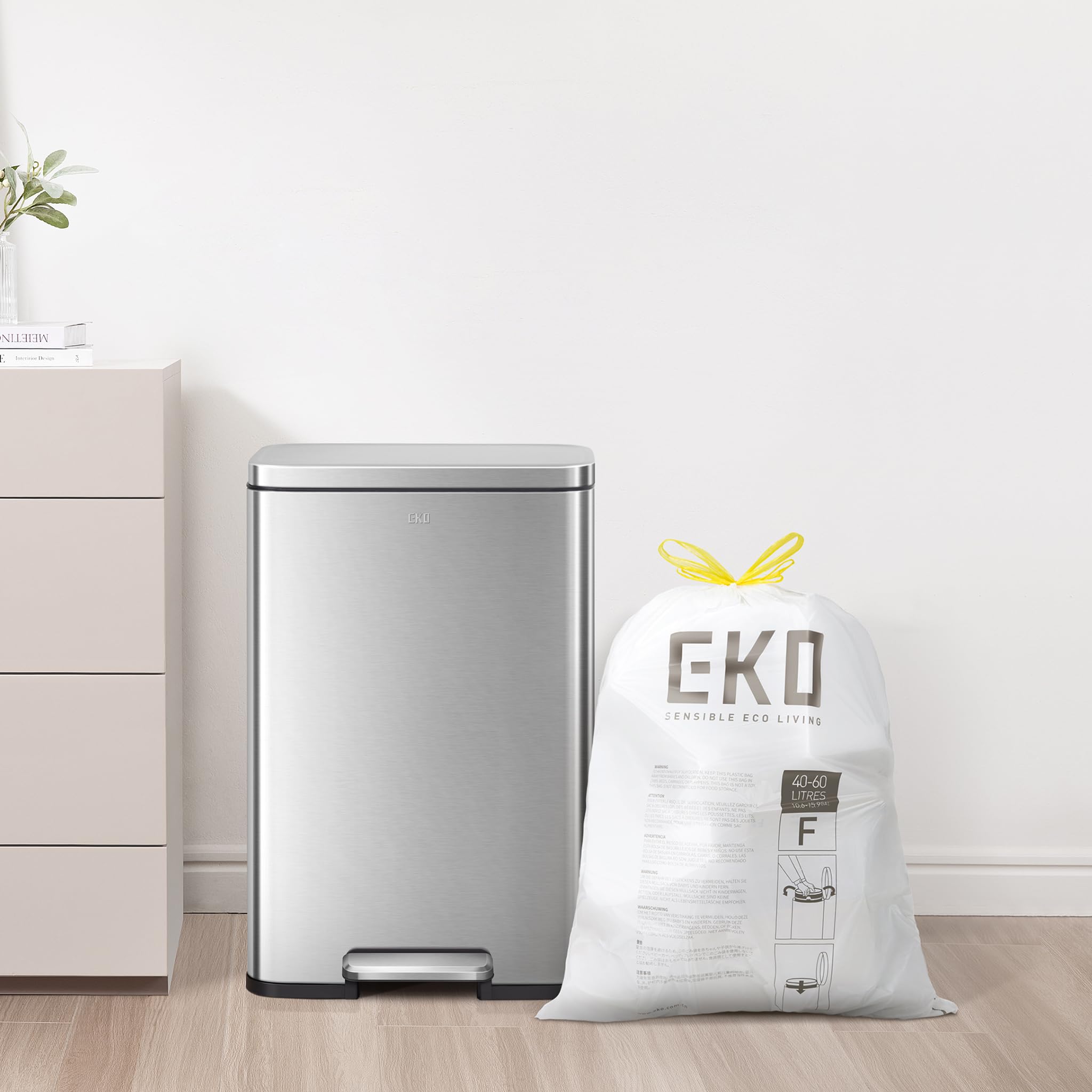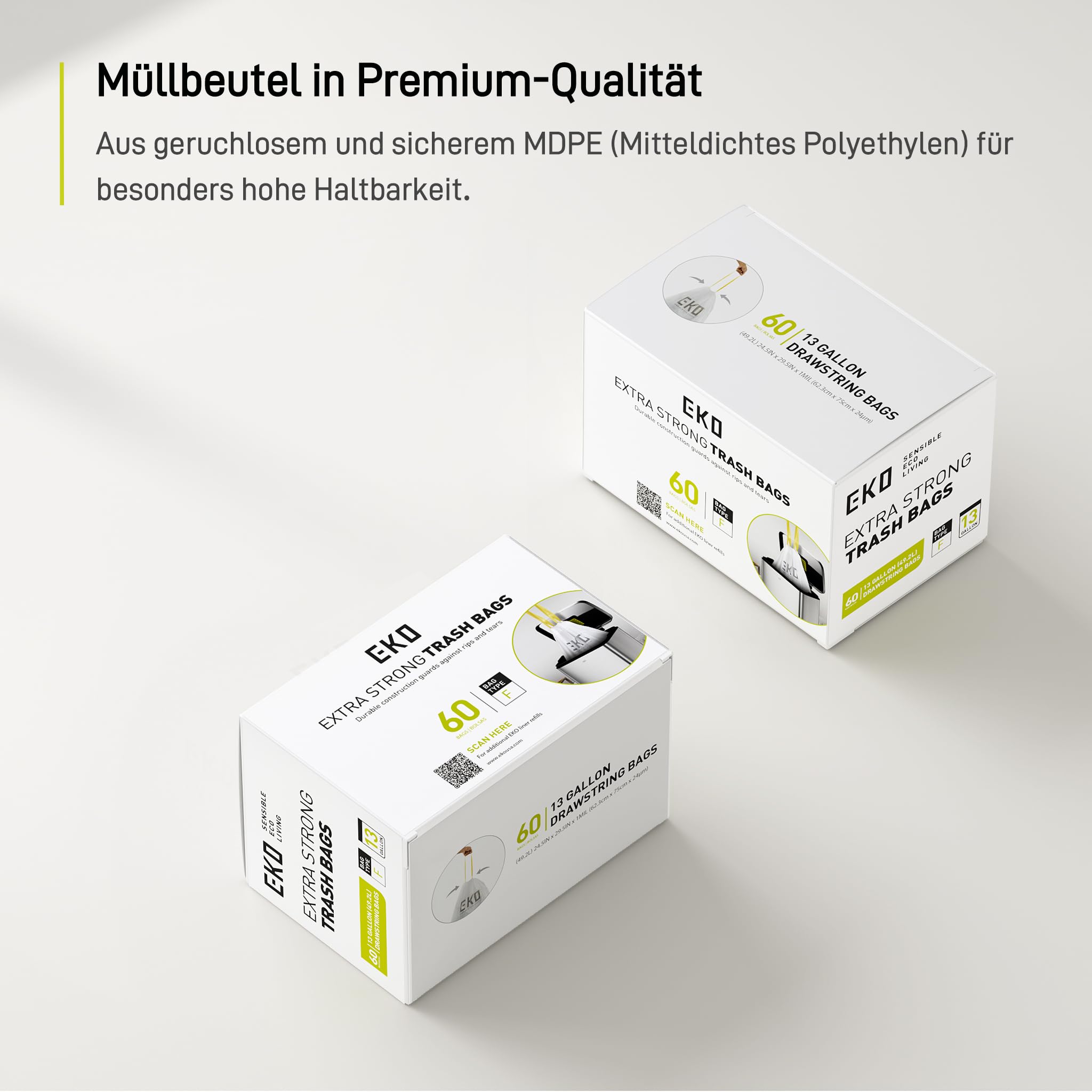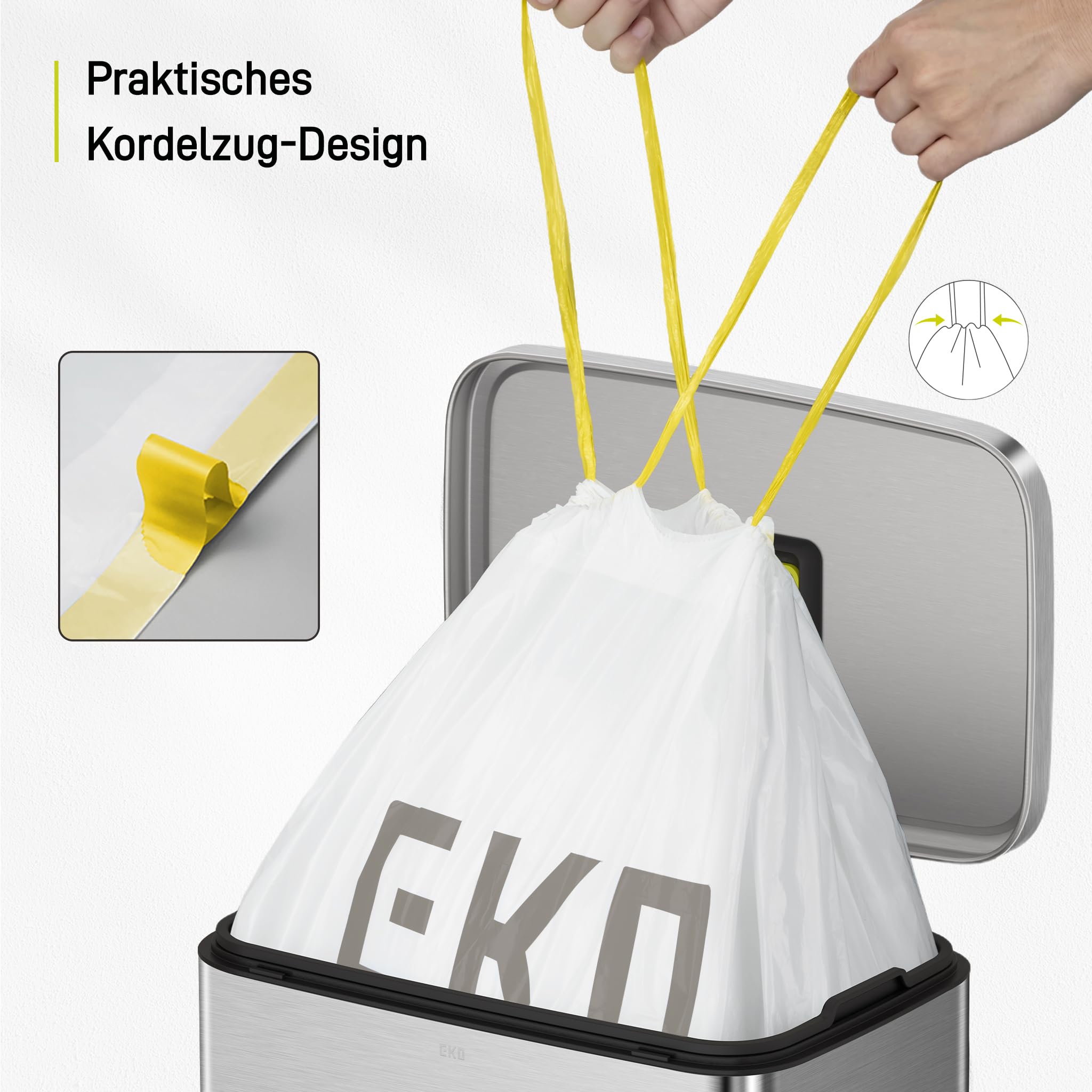 EKO reissfest Müllbeutel mit Zugband, 60 Liter Müllsäcke, 60 Beuteln, extra starken, Schnellzugriffsbox, Auslaufsicher Mülltüten für sicheren Halt am Mülleimer, weiss, Grösse F