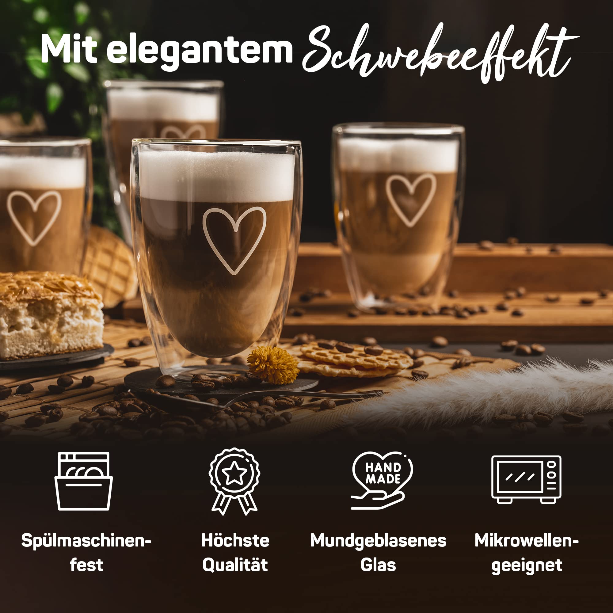 ElbFuchs® Latte Macchiato Gläser doppelwandig [4x 350ml] GESCHENKIDEE mit HERZ | Kristallklare Thermogläser doppelwandig | Ideal als Cappuccino Gläser | Kaffeegläser | Teegläser