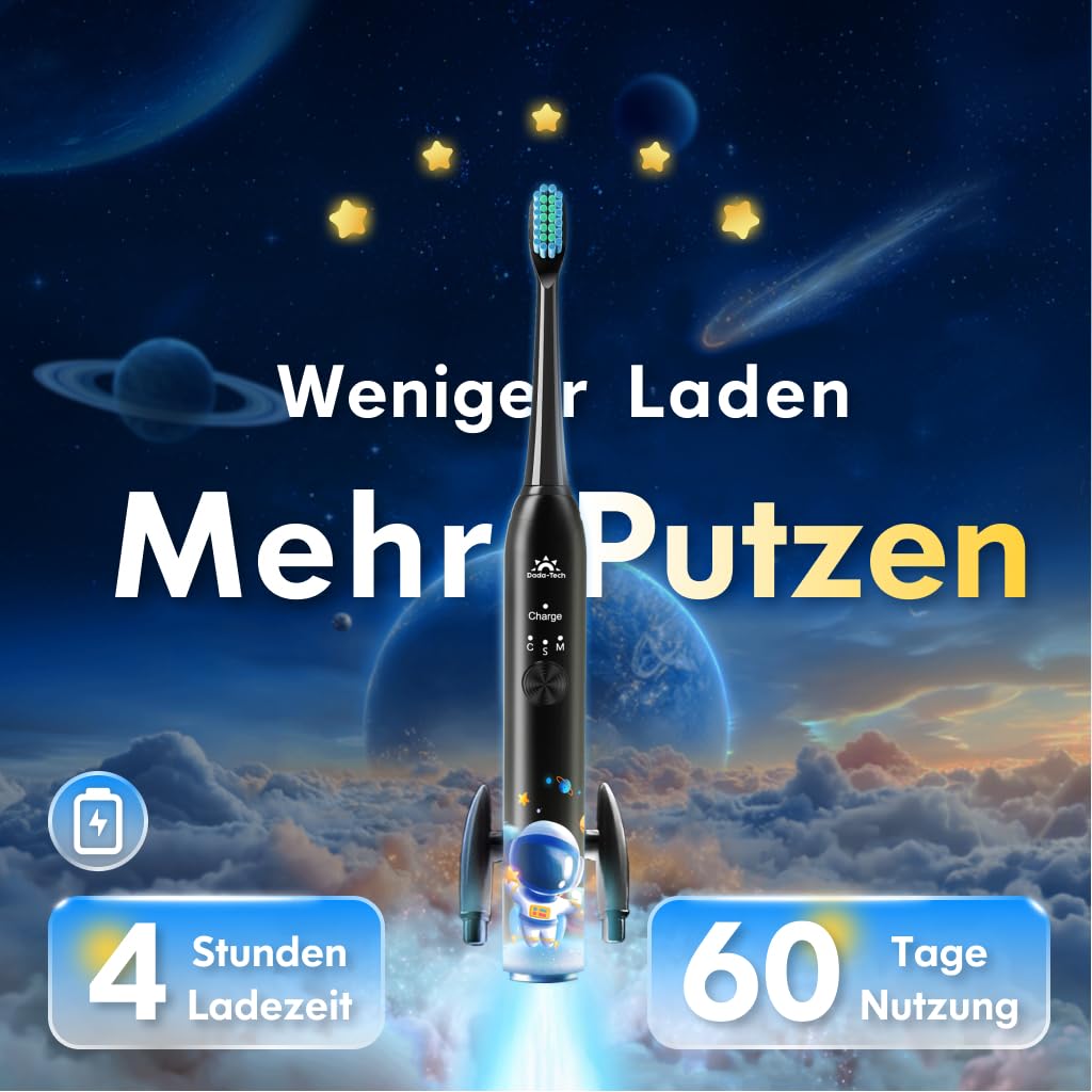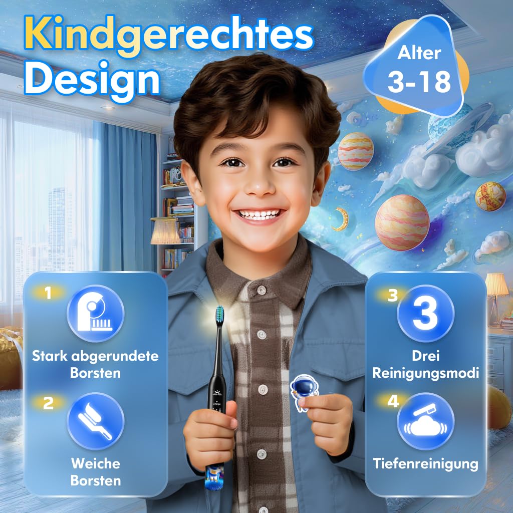Elektrische Zahnbürste Kinder ab 3-6-10-12 Jahre, Kinderzahnbürste Elektrisch mit Timer Gewohnheitsbildende Sticker 3 Modi Schallzahnbürste Kinder Jungen Wiederaufladbar (Astronaut Schwarz)