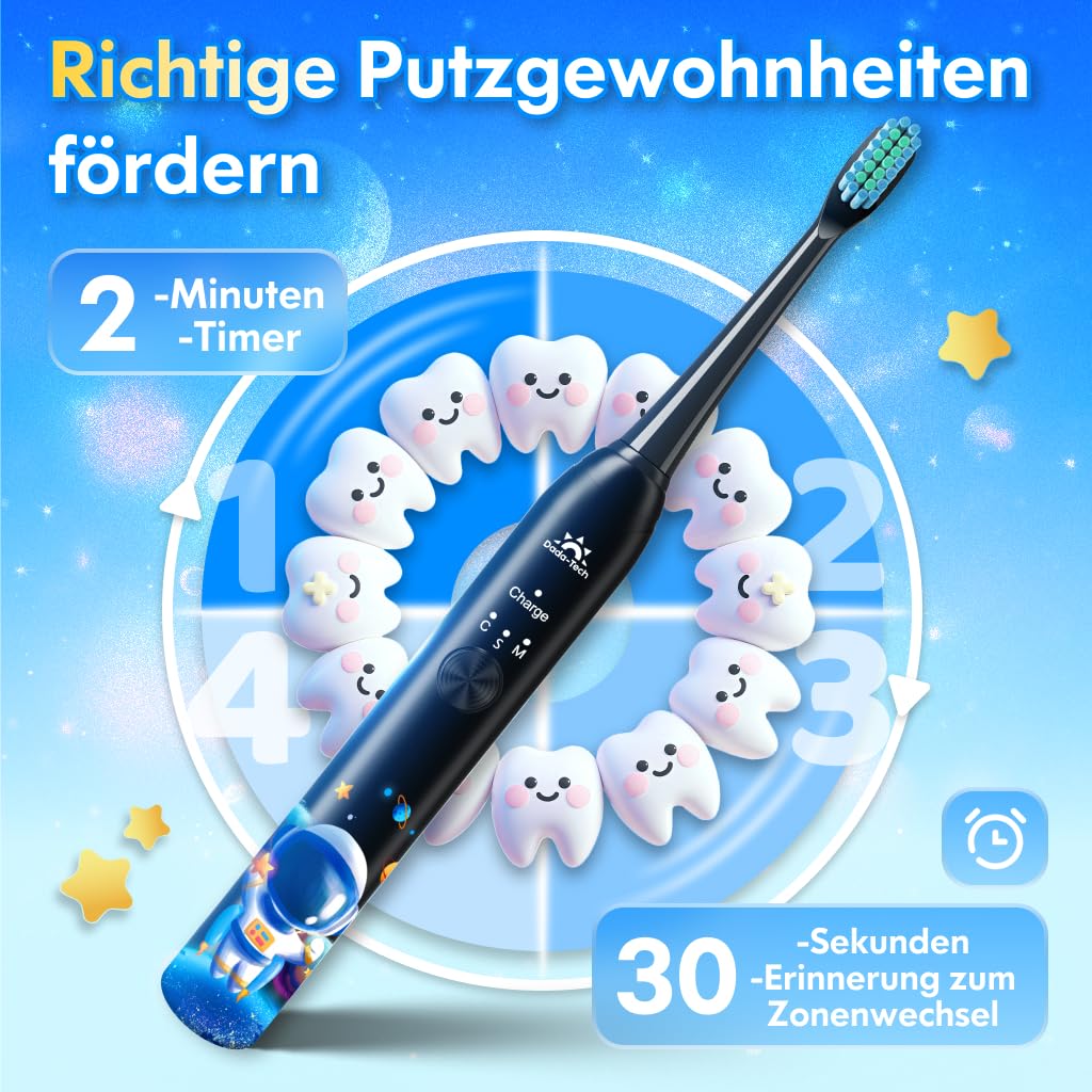 NEUSTE AKTUALISIERTE VERSION: Sonic Technologie speziell für Kinder entwickelt; der intelligente Timer bringt den Kindern bei, wie sie Zähne putzen, genau wie ein Zahnarzt; Weiche Nylon-Borsten und Bürstenköpfe in Lebensmittelqualität werden nach strengen Kriterien ausgewählt. SPEZIELL FÜR KINDER ENTWORFEN: Die Sonic-Technologie wurde entsprechend den oralen und dentalen Eigenschaften der Kinder entwickelt. 7 Tage für sauberere und gesündere Zähne und 14 Tage für verbesserte Zahn- und Mundgesundheit. ZEIGEN SIE IHREN KINDERN WIE MAN RICHTIG ZÄHNE PUTZT: 2 Minuten intelligenter Timer mit Intervallpause, die alle 30 Sekunden erinnert, um die vom Zahnarzt empfohlene Putzgewohnheit zu fördern. SO MACHT ZÄHNEPUTZEN SPAss: Niedlicher Zahnbürstengriff sind perfekt dafür entworfen, um das Bürsten einfach zu machen und für Spass bei Kindern ab 3 Jahren zu sorgen. Weiche Borsten und hochwertiger Silikonbürstenkopf sorgen für ein besseres Putzerlebnis. Lange Akkulaufzeit: Diese wiederaufladbare Schallzahnbürste ist ein hochsicheres Produkt und die Akkulaufzeit nach vollständiger Aufladung 60 Tage beträgt. Er ist wasserdicht und kann in der Badewanne oder Dusche verwendet werden. BPA-FREI.
