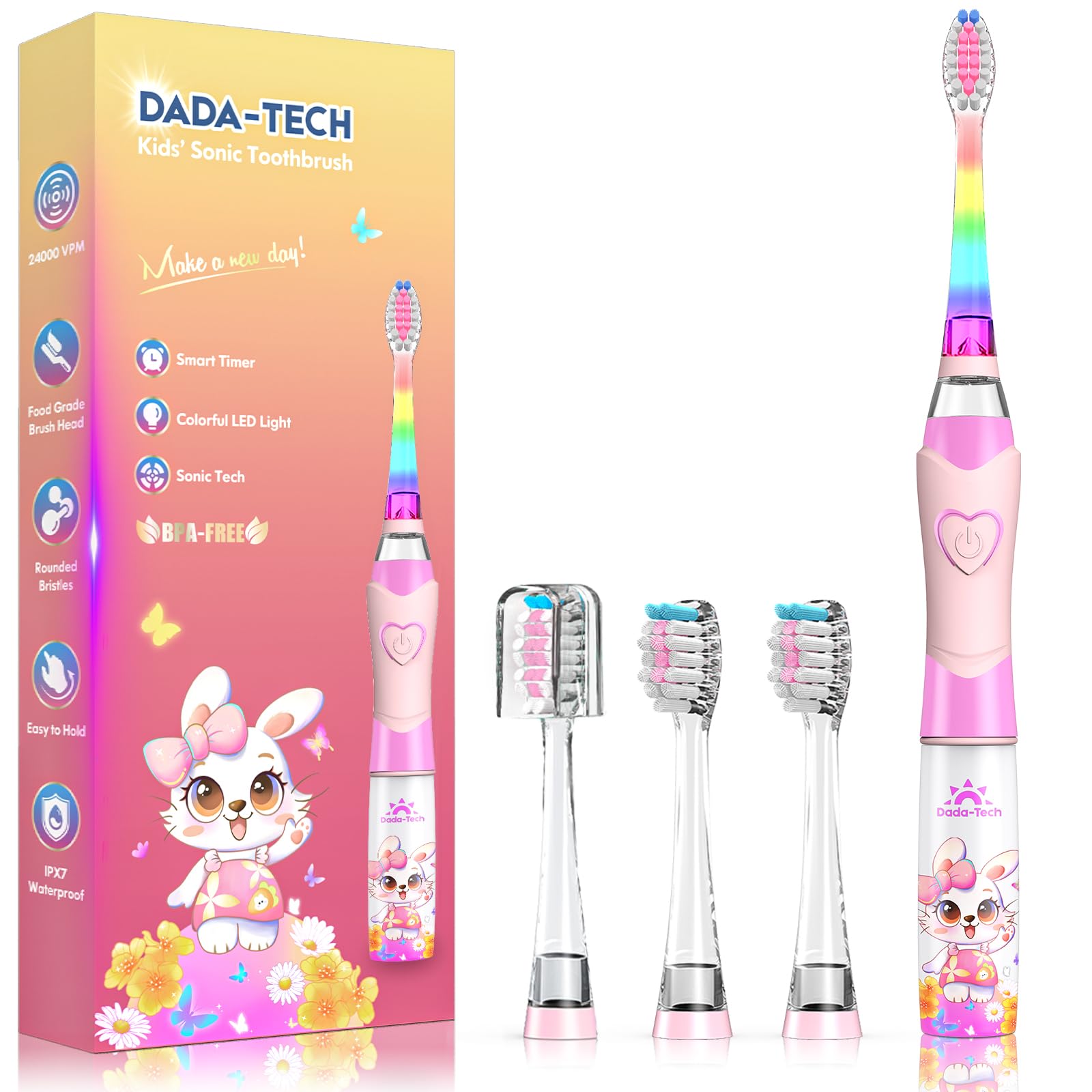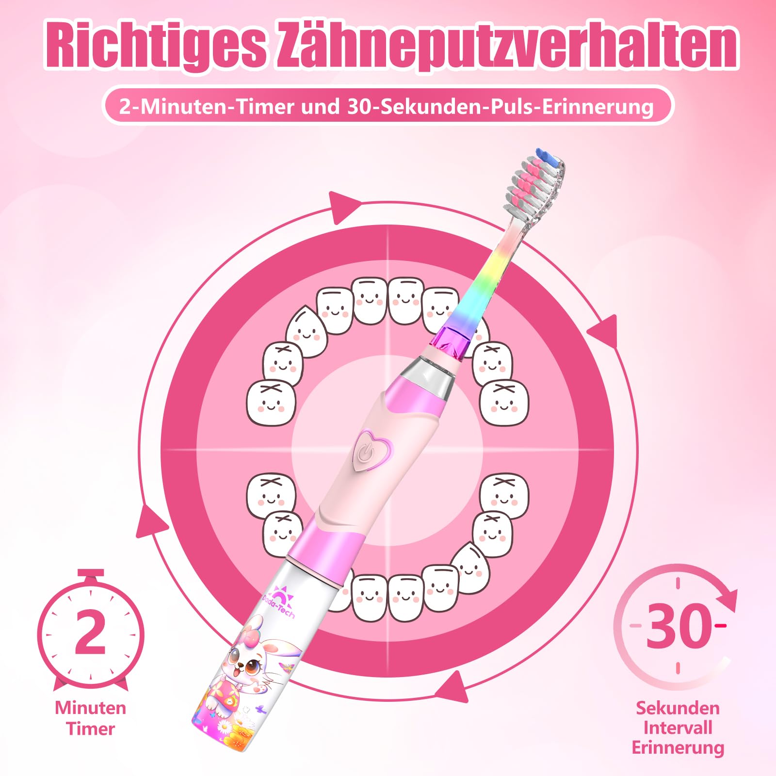 Elektrische Zahnbürste Kinder ab 3-6-8-12 Jahre mit buntem Regenbogen-LED-Licht Integrierter Timer 90% abgerundeten Borsten Schallzahnbürste für Kleinkind (Kind Rosa Kaninchen)