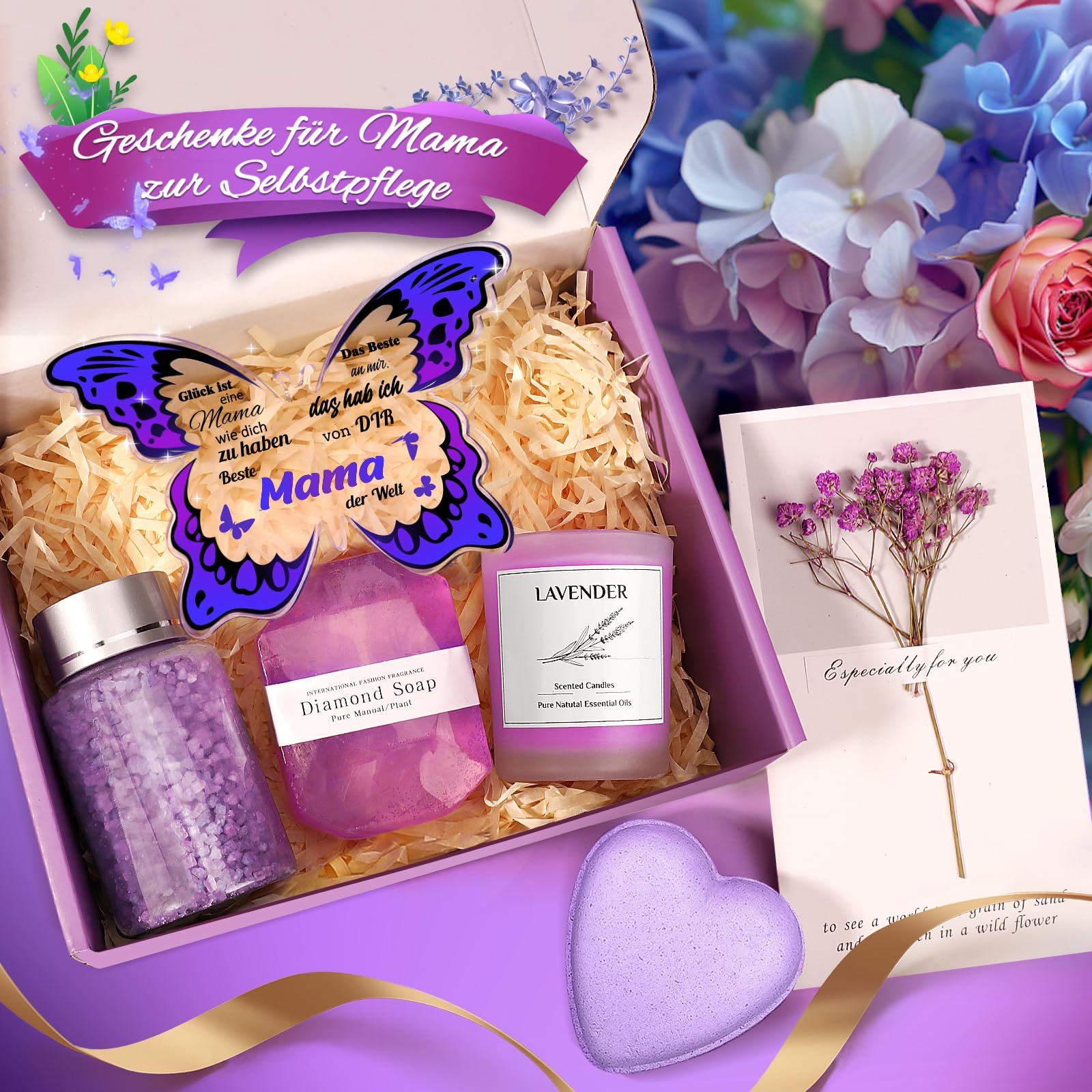 • Geburtstagsgeschenk für Mama: Ganz gleich, ob sie einen langen Tag hinter sich hat oder einen Moment für sich allein sein möchte, dieses Geburtstagsgeschenk für Mama wird ihr helfen, Spannungen und Stress abzubauen. Dieses Geschenkset enthält ein dekoratives Schmetterlingsschild aus Acryl, eine Duftkerze mit Lavendel, eine Badebombe und Seife, eine Grusskarte und Badesalz. Alles ist sehr durchdacht und gibt ihr das Gefühl, an ihrem besonderen Tag luxuriös und geliebt zu sein.
