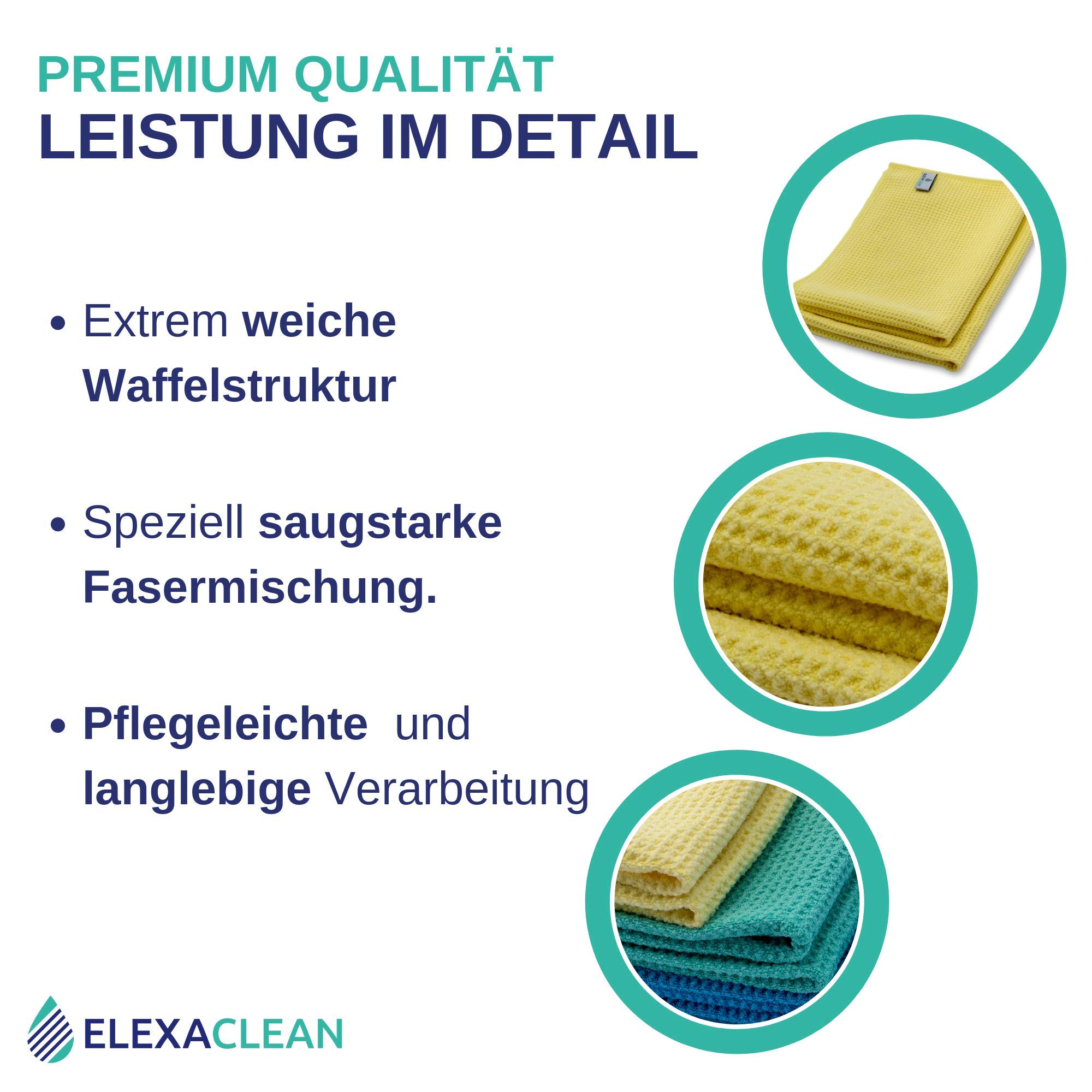 Pflege: Maschinenwäsche bis 60 Grad, für Trockner geeignet bei niedriger TemperaturEinsatzgebiete der TücherReinigen, Trocknen, PolierenAutopflege: Fahrzeuglack und AutofensterHaushalt: Fensterreinigung, Möbel, Spiegel, GlasreinigungKüche: Küchentuch, Küchentücher, Geschirrhandtuch, Geschirrhandtücher, Küchenhandtuch, KüchenhandtücherGewerbe: Aufbereiter, Fensterputzer, Raumpflege ...Ihre Vorteile:fusselfrei, streifenfreiohne Baumwolle, keine BambustücherWabentuch, Saugtuch, Wassermagnet