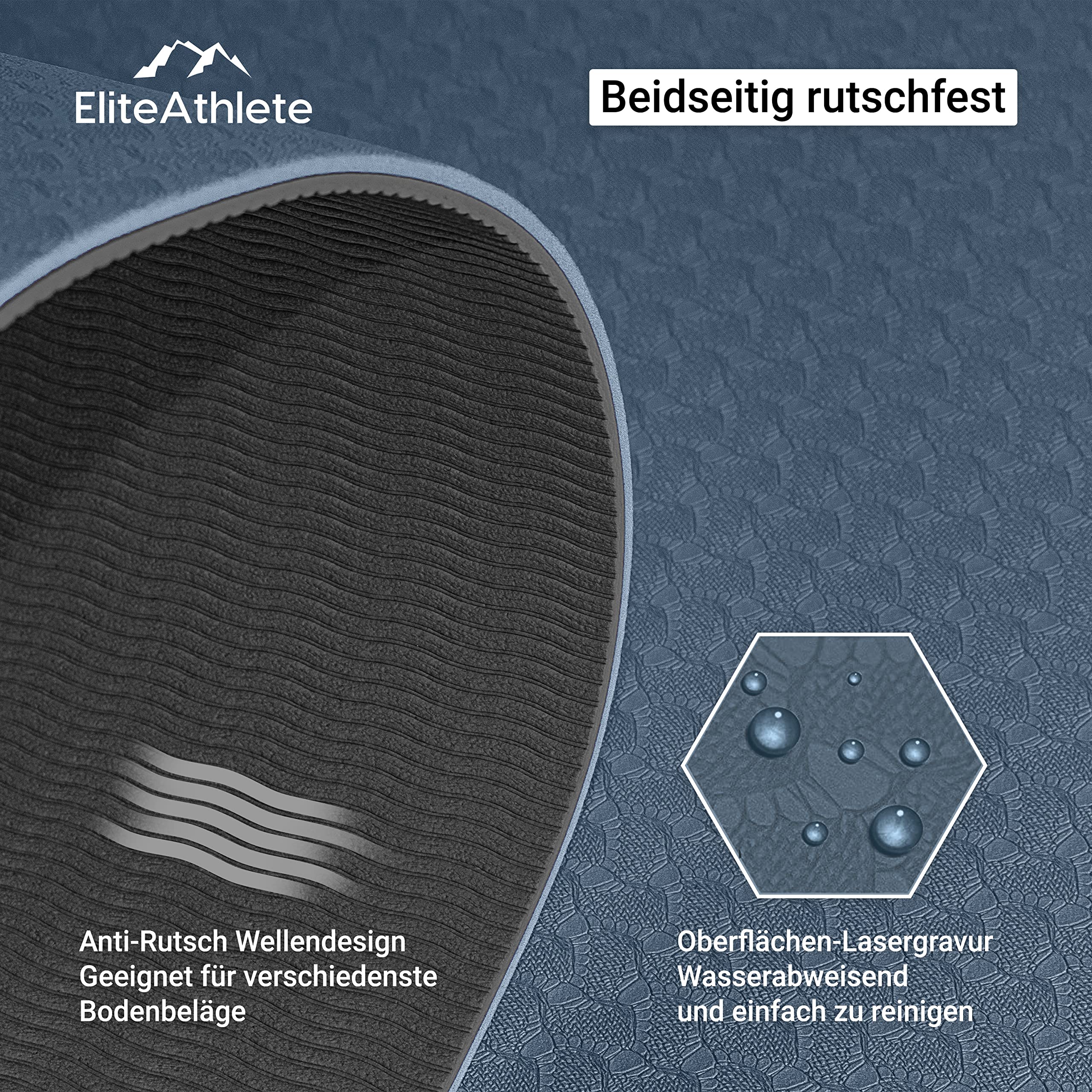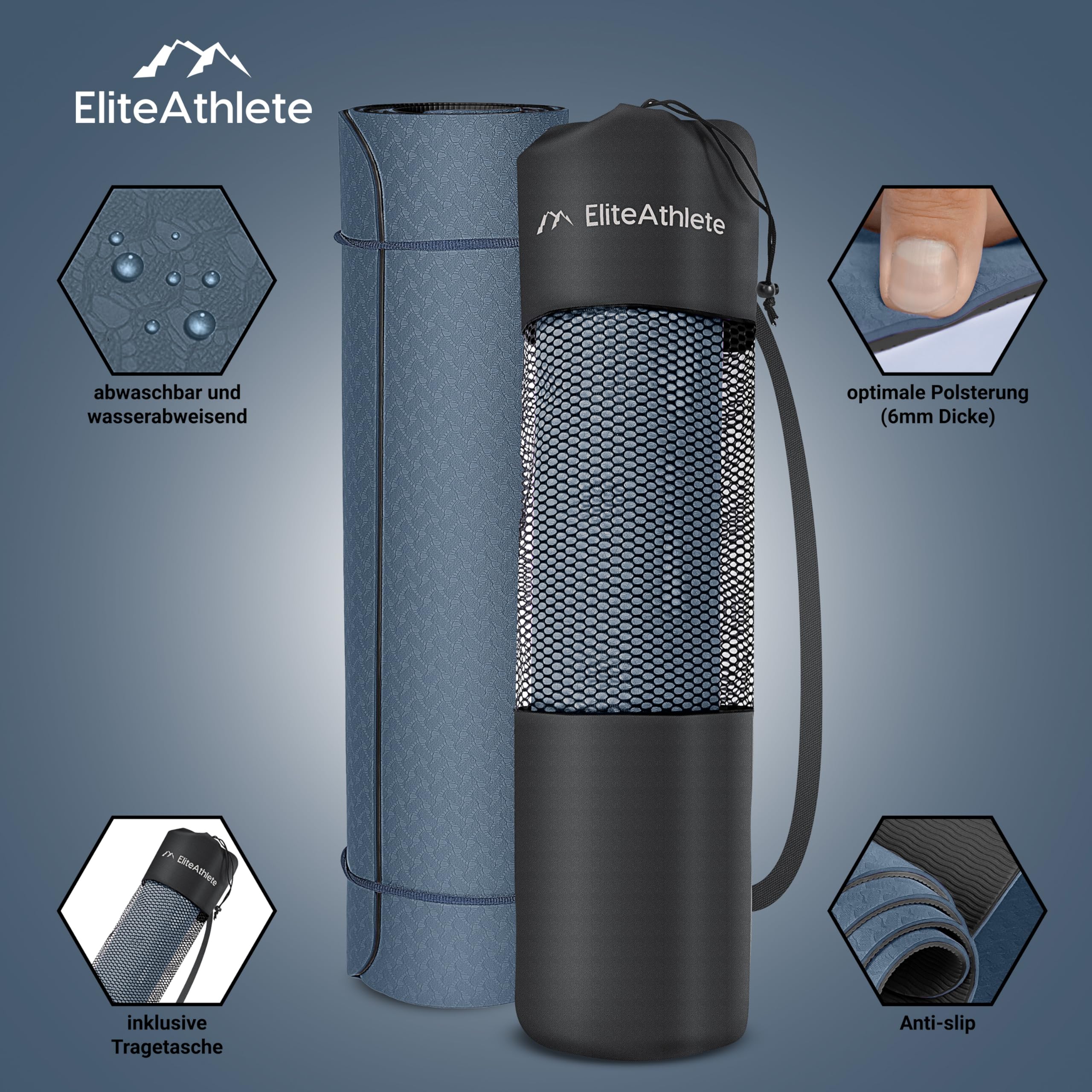 Die EliteAthlete Fitnessmatte ist dein perfekter Begleiter. Egal ob Fitness, Yoga, Pilates, Gymnastik, Rehabilitation, Krafttraining, Home Work out usw. Die Yoga Matte ist ein echter Allrounder! Ziel von uns war es, eine Yogamatte zu entwickeln, die alle Anforderungen für ein anspruchsvolles Training erfüllt. Gleichzeitig soll die Matte dabei auch noch unverwechselbar gut aussehen. Aus diesem Grund haben wir Funktionalität & Design vereint. Trainiere wie die Profis mit deiner unverwechselbaren EliteAthlete Yogamatte. Unsere Yogamatte hat Idealmasse. 183 cm lang 61 cm breit & 6mm dick. Im Lieferumfang ist zusätzlich noch ein Tragegurt enthalten. Unsere Gymnastikmatte bestehen übrigens aus Thermoplastischen Elastomeren, sogenannte TPE. Diese Material ist hochwertig, hypoallergen, hautfreundlich und pflegeleicht.