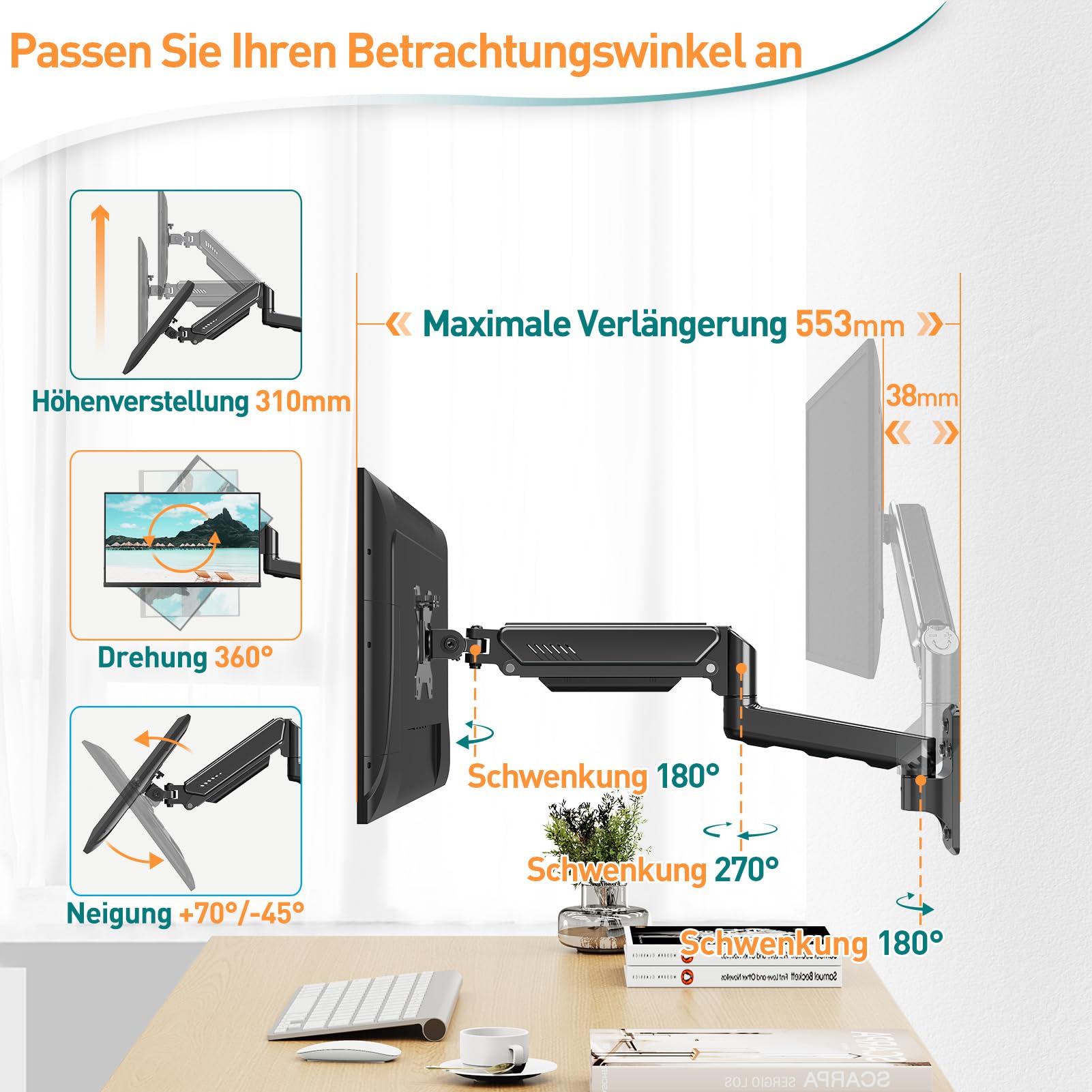 Achten Sie darauf, den Arm während der Einstellung in horizontaler Position zu halten. Andernfalls ist es schwierig, die Halterung einzustellen oder gibt es Möglichkeit, die Halterung zu beschädigen.