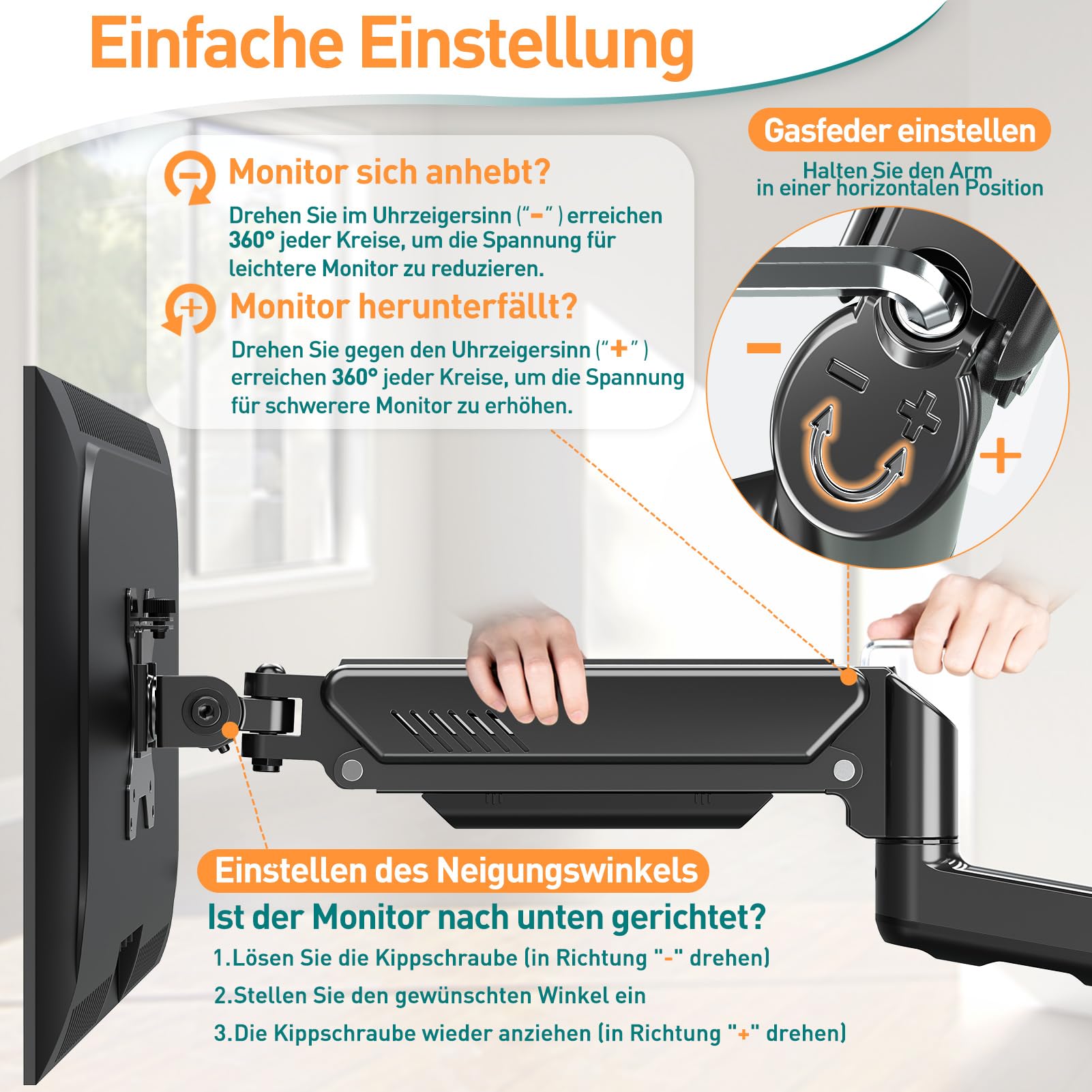 Nach dem Anbringen am Arm hebt sich der Monitor und kann nicht von selbst auf der gewünschten Höhe bleiben. Drehen Sie im Uhrzeigersinn („-“), um die Spannung der Gasfeder zu verringern.