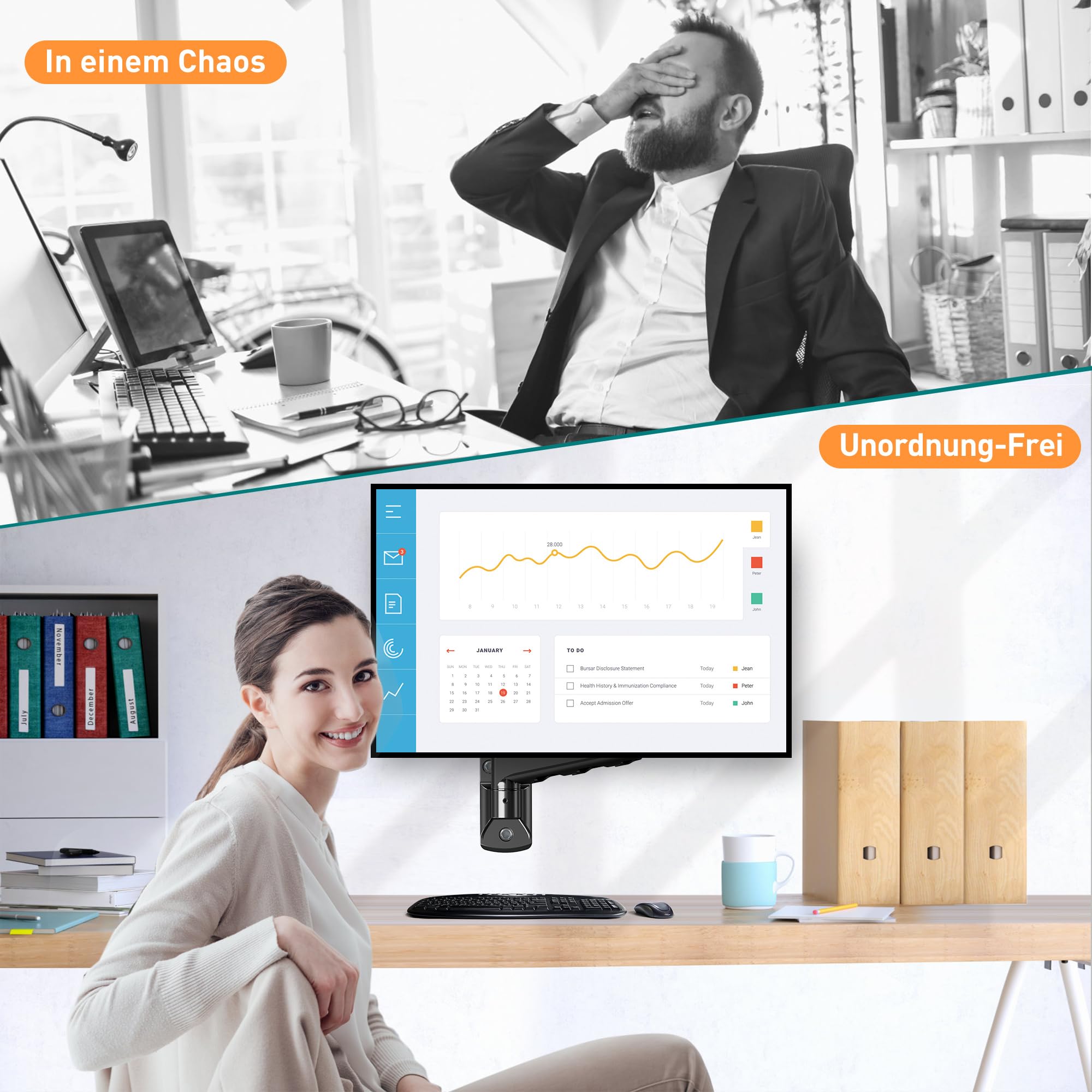 Einfache Montage mit ordentlicher Anleitung auf 5 Sprachen (EN / DE / FR / ES / IT). Sie können diese Monitorarm mit ordentlicher Anleitung durch 4 einfache Schritten installieren. Das gesamte mitgelieferte Zubehör befindet sich in etikettierten Beuteln.