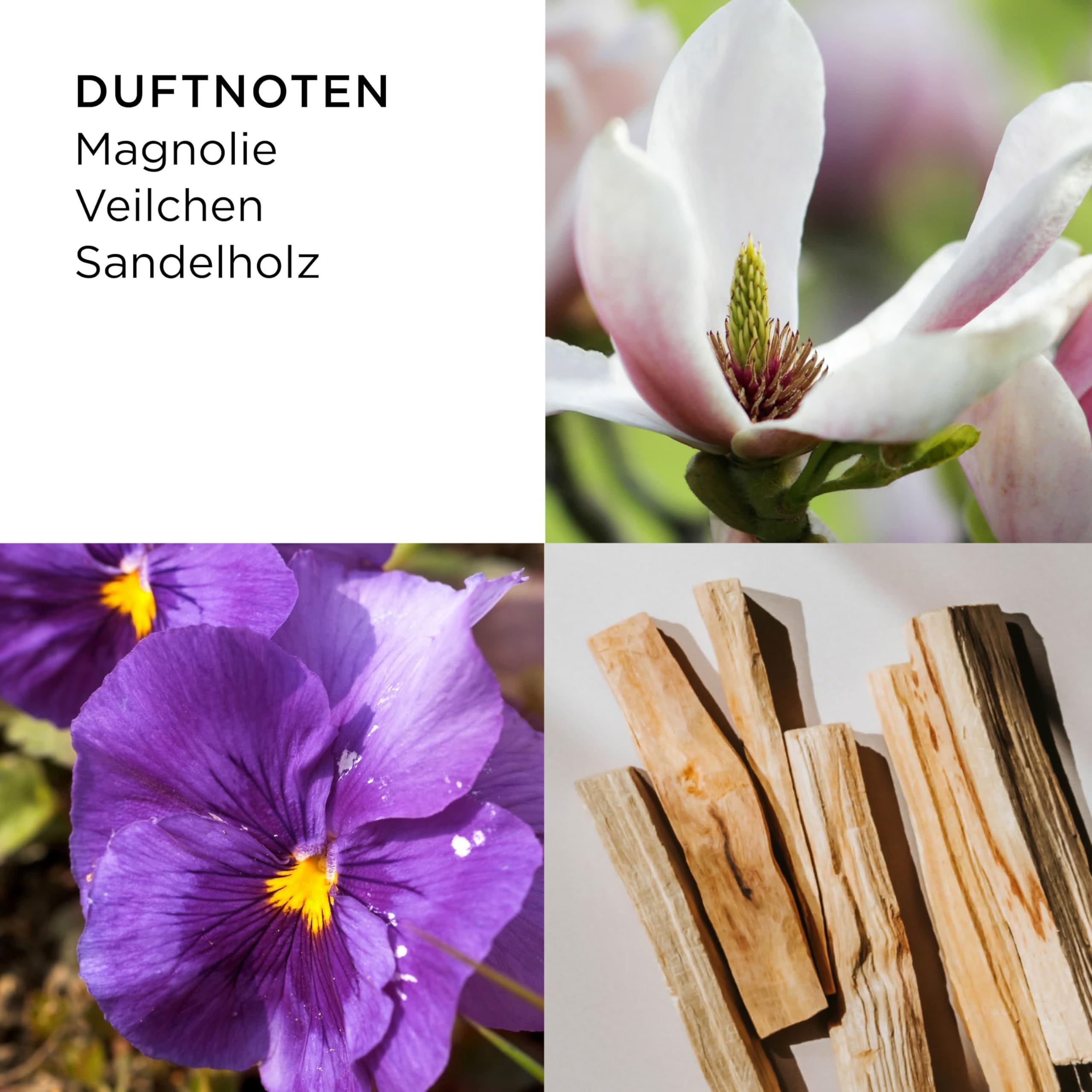 • BLUMIGE UND FRUCHTIGE NOTEN Rosa Magnolie, Flieder und Pfirsich in der Kopfnote sorgen für Frische und Eleganz, die durch sanfte und erfrischende Zitrusnuancen ergänzt werden; Veilchen, Rose, Jasmin und Ylang-Ylang in der Herznote verleihen Wärme und ein Gefühl von Nostalgie; Bernstein und Sandelholz bilden die Basisnote und wirken wie ein natürliches Bindeglied, das die anderen Noten in Harmonie hält und die Haltbarkeit des Parfüms verlängert