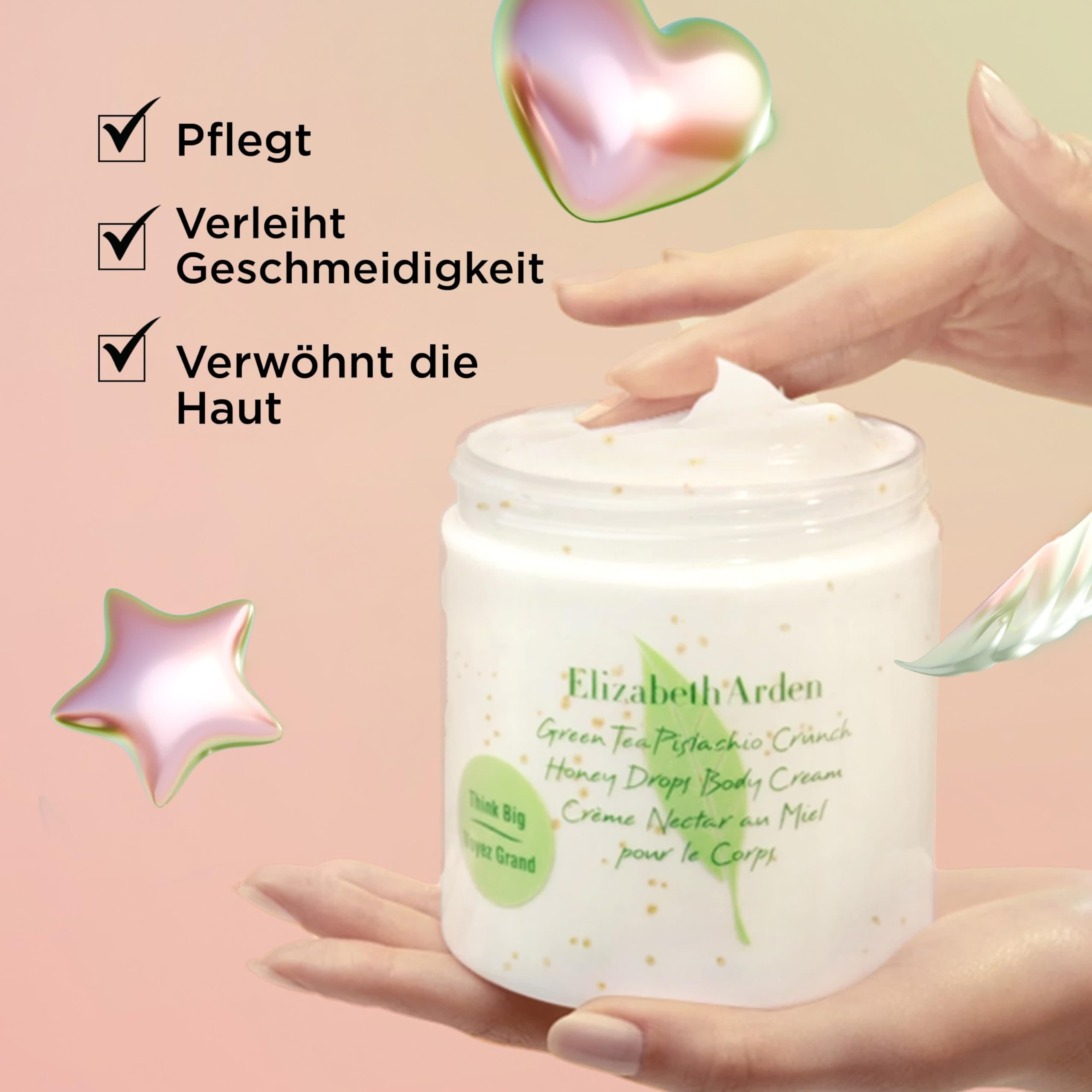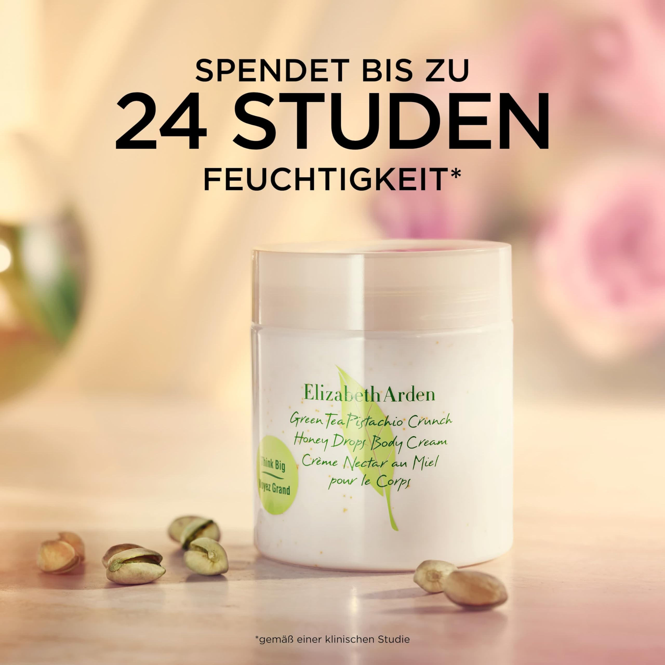Erleben Sie mit der NEUEN Pistachio Crunch Honey Drops Body Cream von Green Tea ein intensives Pflege- und Dufterlebnis für den ganzen Körper. Die ultraleichte, dennoch reichhaltige Formel spendet bis zu 24 Stunden lang Feuchtigkeit* und verwöhnt die Haut, ohne zu fetten. Ihre trockene oder normale Haut wird weich, geschmeidig und zart – für ein rundum gepflegtes Hautgefühl.
