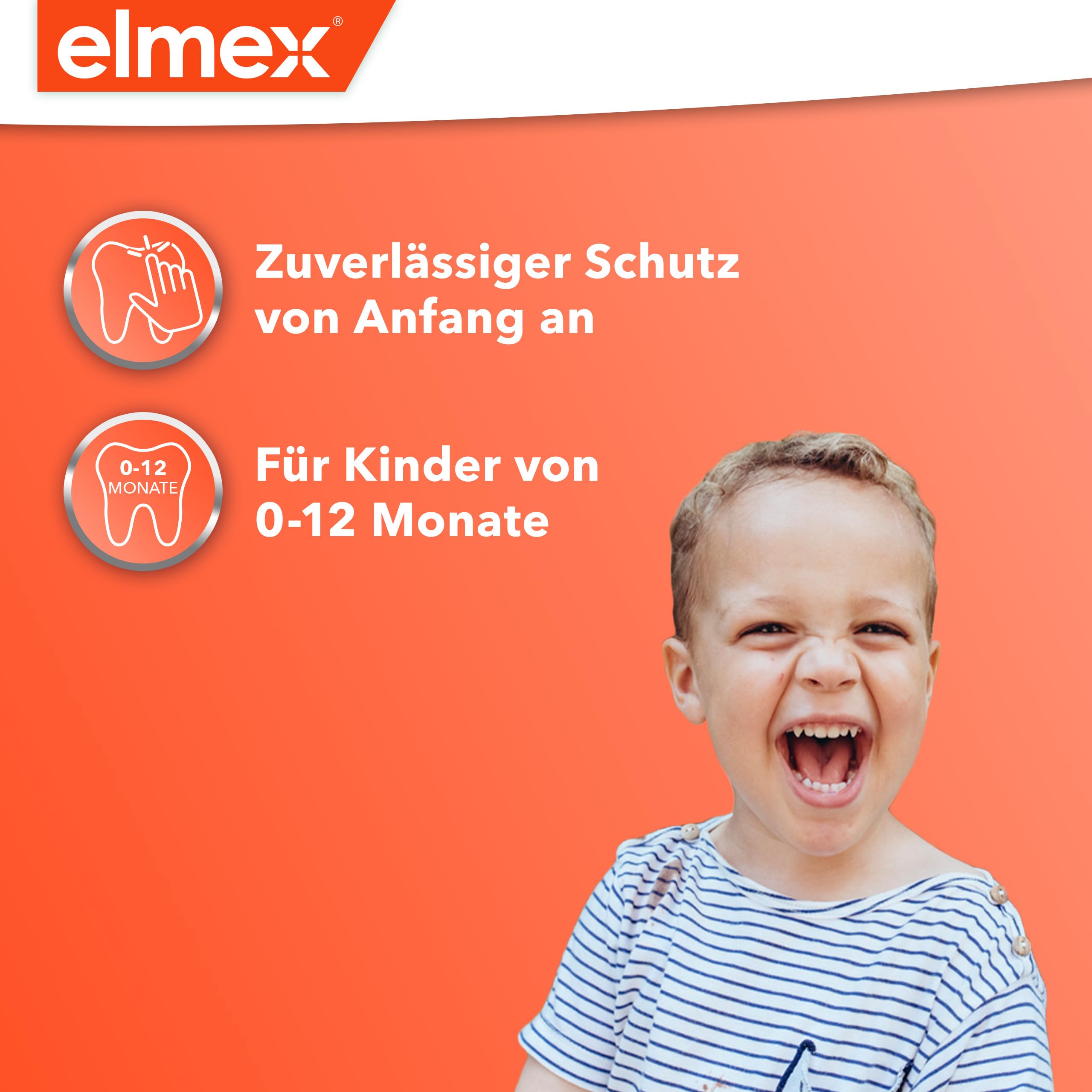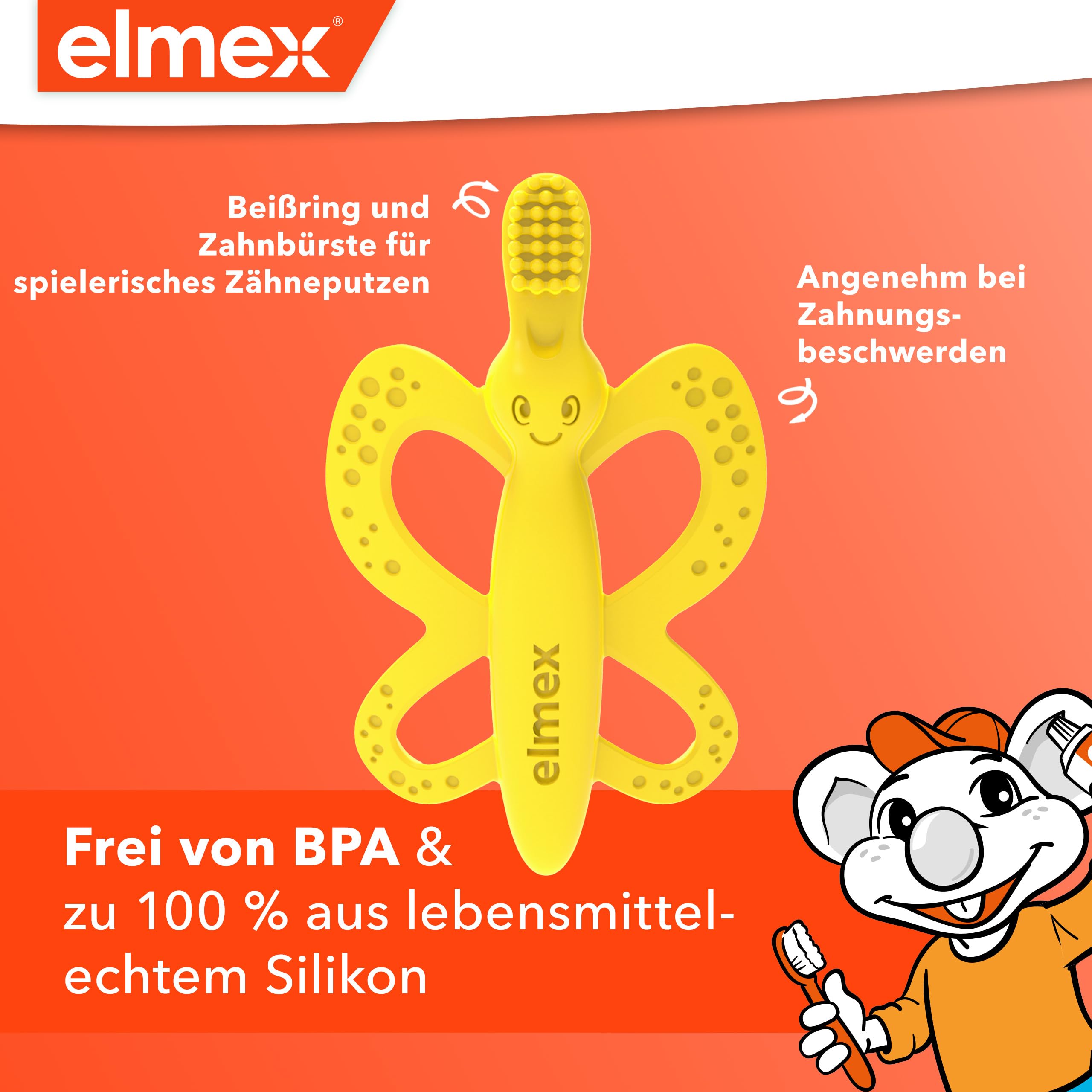 elmex 2-in-1 Baby Zahnbürste und Beissring – gewöhnt Babys ans ZähneputzenDie Pflege von Kinderzähnen beginnt schon im Babyalter. Speziell von Experten entwickelt und gestestet, hilft die elmex Baby Zahnbürste und Beissring Kombination, Babys im Alter von 0-12 Monaten spielerisch an das Zähneputzen zu gewöhnen.Zuvor im Kühlschrank gekühlt oder einfach so, hilft die elmex 2-in-1 Zahnbürste mit Beissring auch bei Zahnungsbeschwerden und ist dank des BPA-freien und 100 % lebensmittelechten Silikons gesundheitlich unbedenklich. Die flexiblen Borsten reinigen die ersten Zähnchen besonders schonend und mit dem flexiblen Griff kann die 2-in-1 Zahnbürste und Beissring von kleinen Händen einfach gehalten werden.Für eine gesunde Entwicklung der Zähne und zum spielerischen Erlernen einer Zahnputzroutine empfehlen wir die elmex Babyzahnpasta und die elmex Lern-Zahnbürste.Hinweis: Zahnbürste dem Kind nicht umhängen, da sonst Strangulierungsgefahr besteht. Wir empfehlen die Verwendung nur unter Aufsicht eines Erwachsenen. Kein Spielzeug. Vor jeder Anwendung reinigen. Bei ersten Verschleisserscheinungen auswechseln.Die Produktvorteile im Detail:elmex 2-in-1 Babyzahnbürste und BeissringFür Babys im Alter von 0-12 MonatenGewöhnt spielerisch an das ZähneputzenAngenehm bei ZahnungsbeschwerdenBPA-frei, aus 100 % lebensmittelechtem SilikonFlexible Borsten und flexibler GriffKühlschrank und kochendes Wasser getestetInhalt: 1 Stück
