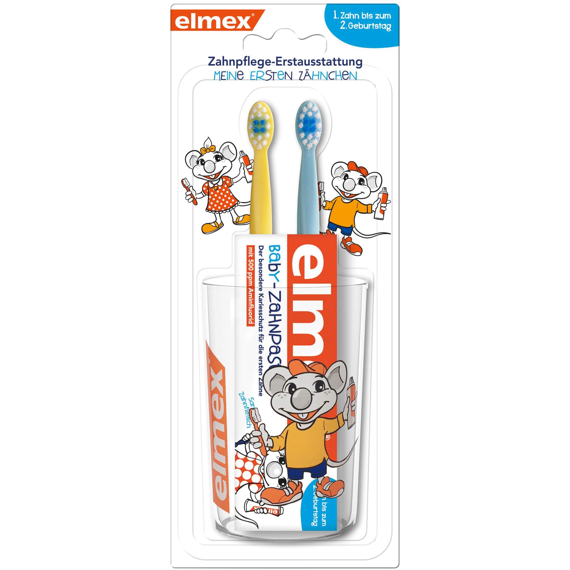 elmex Baby Zahnpflege-Erstausstattung Set 0-2 Jahre – Kariesschutz für die ersten Zähne Als Platzhalter für die bleibenden Zähne sind gesunde Milchzähne eine wichtige Voraussetzung für langfristige Mundgesundheit. Mit dem elmex Baby Zahnpasta Set erhalten sie den Schutz und die Pflege, die sie verdienen. Zwei elmex Lern Zahnbürsten, eine elmex Baby Zahnpasta sowie ein praktischer Zahnputzbecher vervollständigen die erste Zahnpflege-Ausstattung für Kleinkinder im Alter von 0 bis 2 Jahren. Mit dem Aufbau einer Kalziumfluoridschicht auf dem Zahnschmelz und Aminfluorid macht die Kinder Zahnpasta mit dem besonderen Dreifach-Schutzmechanismus die Milchzähne widerstandsfähig gegen Karies, kariesbedingten Mineralverlust und hilft, Mineralien zu ersetzen, die bereits durch Karies gelöst wurden. Die elmex Lern Zahnbürste mit weich ummanteltem Bürstenkopf sowie weichen, abgerundeten Borsten ist speziell auf die motorischen Fähigkeiten von Kleinkindern angepasst. Sie hilft spielerisch beim Erlernen der Zahnpflege und reinigt gründlich und schonend die Zähne, ohne dabei das Zahnfleisch zu beschädigen. Zusammen sorgt das Duo für die Aufnahme eines altersgerechten Fluoridgehalts: Die Zahnpasta enthält die empfohlene Konzentration an Fluorid, während die Zahnbürste mit dem blauen Bürstenfeld für eine richtige Dosierung der Zahnpasta sorgt. So werden die Kinderzähne von Anfang an mit wissenschaftlich getesteten Produkten versorgt – für ein gesundes Lächeln ab dem 1. Zahn. Hinweis: Zur Vermeidung übermässigen Verschluckens Zähneputzen nur unter Aufsicht. Bei zusätzlicher Aufnahme von Fluorid den Zahnarzt oder Arzt befragen. Die Zähne zweimal täglich mit einer erbsengrossen Menge Zahnpasta putzen, sobald der erste Milchzahn durchbricht. Das zahnärztliche Praxisteam empfiehlt, die Zahnbürste alle drei Monate, nach infektionskrankheiten sowie nach Abnutzung auszuwechseln. Die Produktvorteile im Detail: elmex Baby Zahnpflege-Erstausstattung Set Für Kinder ab 0 bis 2 Jahren Für das spielerische Heranführen an das Zähneputzen Reinigt gründlich und sanft Milde Zahnpasta mit Kalziumfluorid und Aminfluorid Zahnbürste mit weichem Bürstenkopf, weichen Borsten und ergonomischem Griff Für die tägliche Anwendung geeignet Klinisch bestätigt Inhalt: 2 x Lern-Zahnbürsten, 1 x 50 ml Baby Zahnpasta, 1 x Zahnputzbecher
