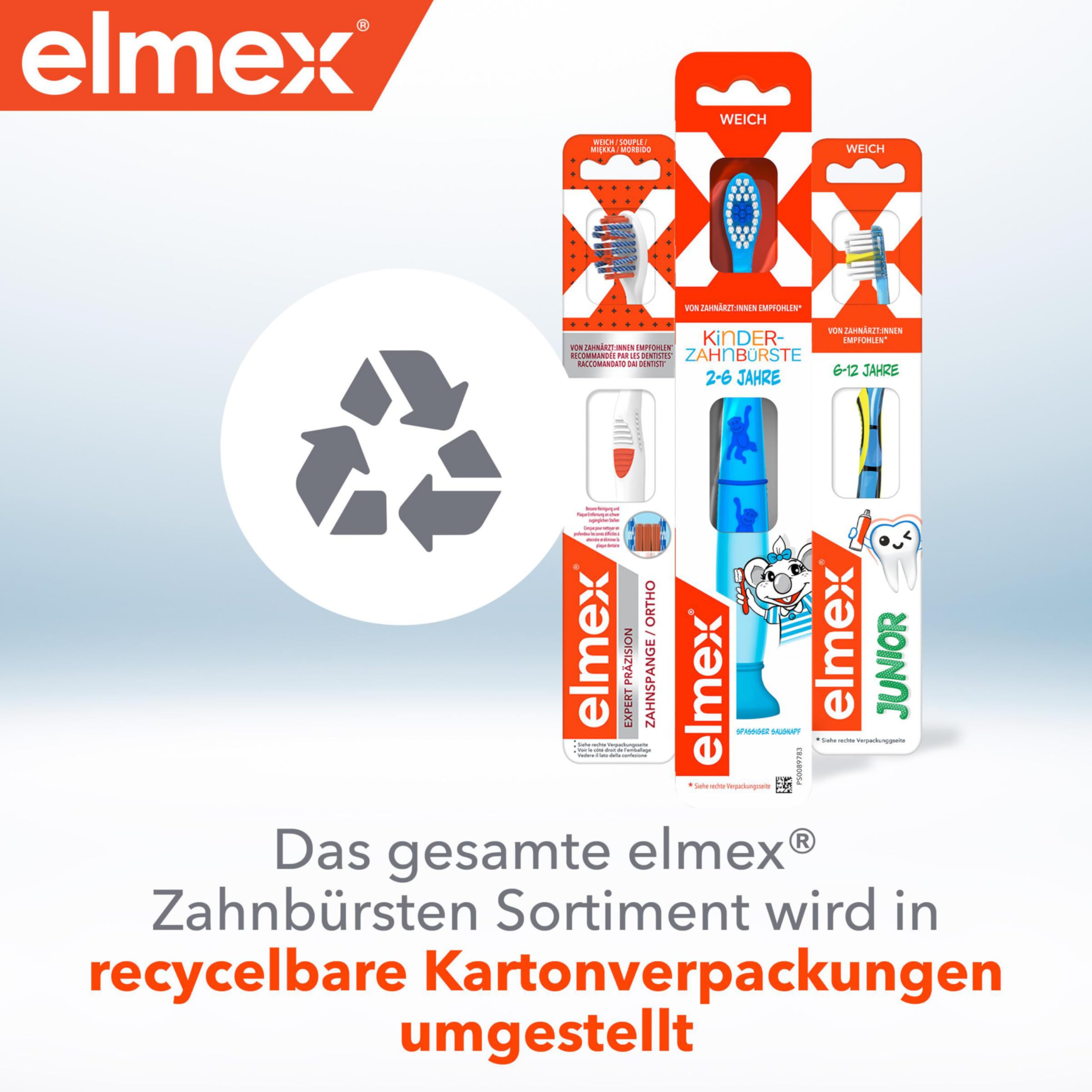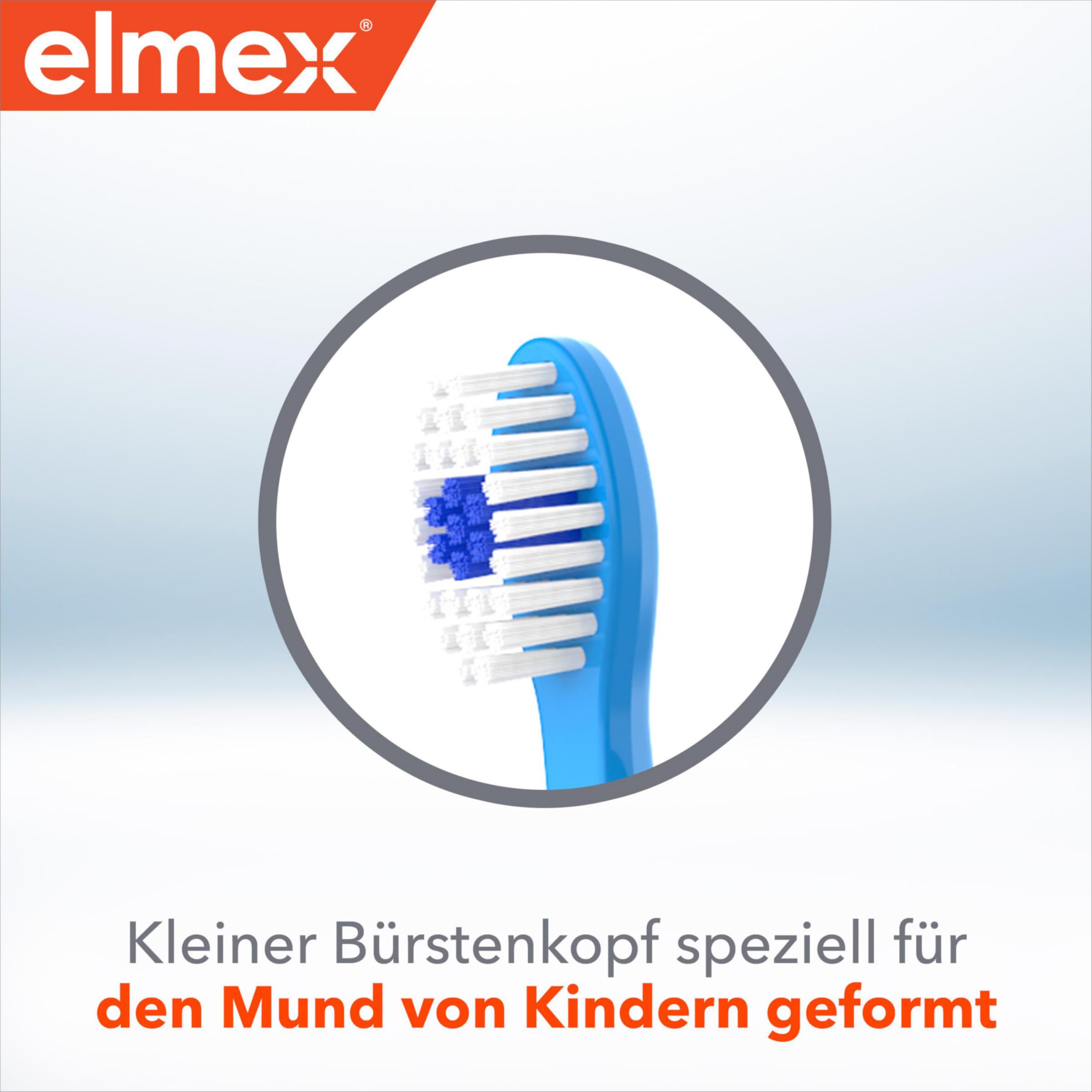 elmex Kinder Zahnbürste 2-6 Jahre – reinigt schonend & effektiv MilchzähneEine gründliche und konsequente Reinigung der Milchzähne ist besonders wichtig, da sich diese sowohl auf die Ausbildung der Sprache als auch auf die Stellung der folgenden, bleibenden Zähne auswirken. Es zahlt sich daher aus, Kinder von Anfang an spielerisch und mit Freude an das Zähneputzen heranzuführen.Die elmex Kinder Zahnbürste mit weichen, abgerundeten Borsten ist speziell auf die motorischen Fähigkeiten von Kindern zwischen 2 und 6 Jahren angepasst. Sie hilft spielerisch beim Erlernen der Zahnpflege und reinigt gründlich und schonend die Zähne, ohne dabei das Zahnfleisch zu beschädigen. Mit dem blauen Borstenfeld ist die richtige Dosierung der Zahnpasta kinderleicht und der Saugnapf sorgt für eine spassige, aufrechte Aufbewahrung. Der ergonomisch geformte Griff mit Führungslinien liegt für alle Griffarten rutschfest in der Kinderhand und mit dem kleinen Bürstenkopf können alle Milchzähne leicht erreicht und geputzt werden. Passend zu der Kinderzahnbürste ab 2 Jahren ist die elmex Kinderzahnpasta, um die Kinderzähne von Anfang an mit wissenschaftlich getesteten Produkten zu reinigen.Für optimale Ergebnisse bei der Pflege von Milchzähnen empfehlen wir die zusätzliche Nutzung der elmex Kinder Zahnpasta 2-6.Hinweis: Zahnmedizinisches Fachpersonal empfiehlt die Zahnbürste alle 3 Monate und nach Infektionserkrankungen sowie nach der Abnutzung auszuwechseln. ACHTUNG: Nicht für Kinder unter 2 Jahren geeignet. Kinder unter 8 Jahren nur unter Aufsicht verwenden. NICHT KAUEN ODER BEISSEN. Nur zum Zähneputzen verwenden. Nicht als Spielzeug verwenden.Die Produktvorteile im Detail:elmex KinderzahnbürsteKleiner Bürstenkopf für Kinder ab 2 bis 6 JahrenReinigt schonend mit weichen, abgerundeten BorstenErgonomisch geformter Griff mit Führungslinien für alle GriffartenBlaues Borstenfeld als DosierhilfeSaugnapf für aufrechte AufbewahrungZur täglichen Anwendung geeignetInhalt: 6 Stück, Variante kann variieren und ist nicht frei wählbar