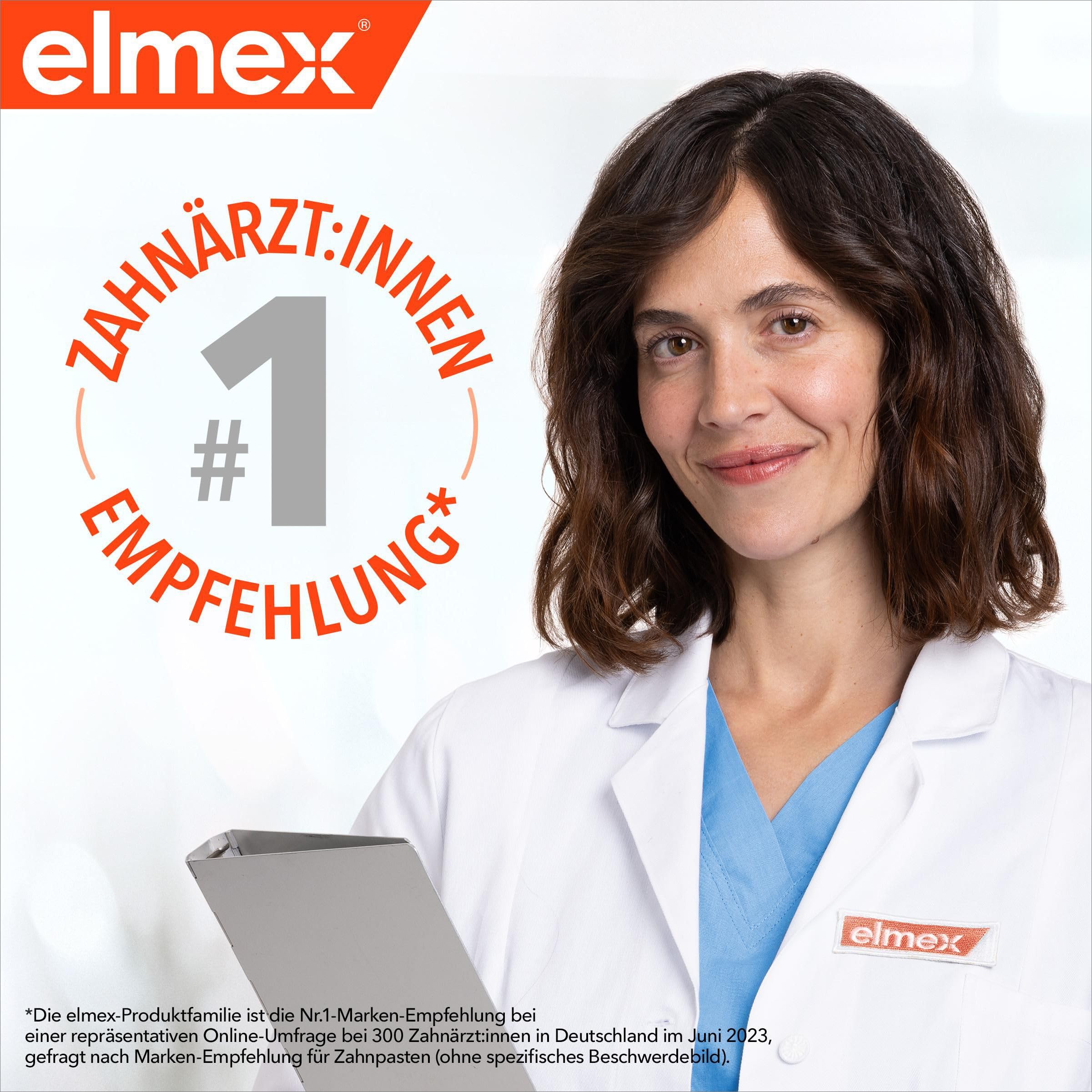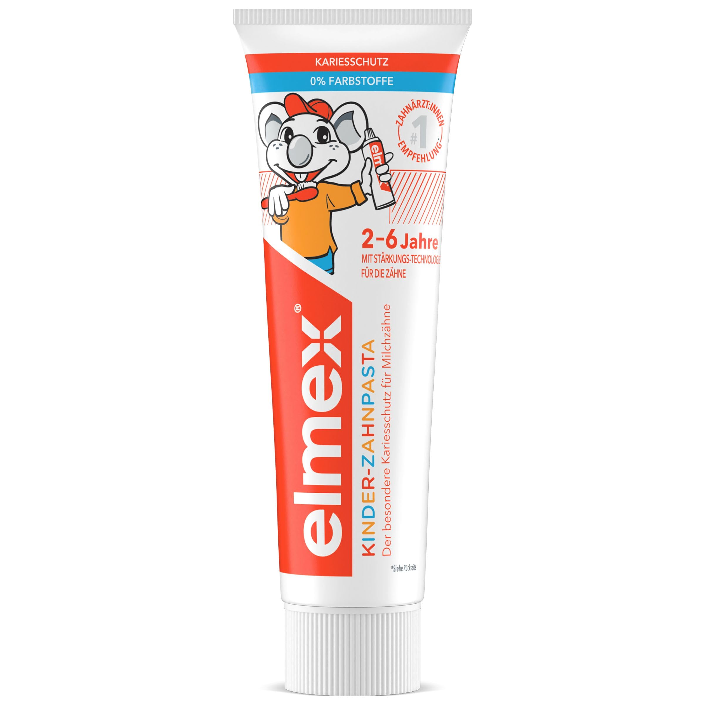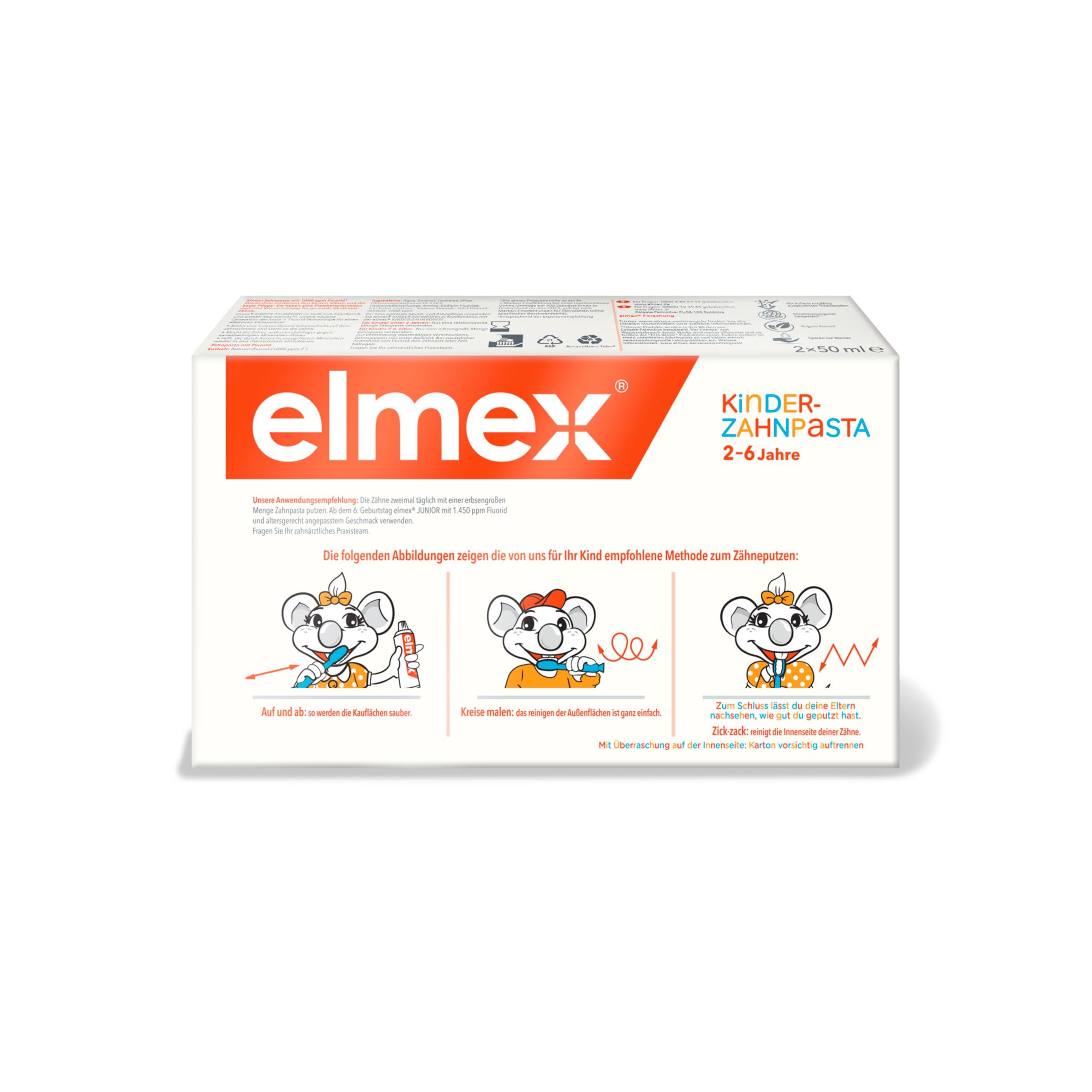 elmex Kinder Zahnpasta 2-6 Jahre – mineralisiert & schützt Milchzähne vor KariesEine gründliche und konsequente Reinigung der Milchzähne ist besonders wichtig, da sich diese sowohl auf die Ausbildung der Sprache als auch auf die Stellung der folgenden, bleibenden Zähne auswirken. Es zahlt sich daher aus, Kinder von Anfang an spielerisch und mit Freude an das Zähneputzen heranzuführen. Die elmex Kinderzahnpasta ist speziell für Kinder zwischen 2 und 6 Jahren entwickelt worden, um die Milchzähne gründlich zu reinigen. Das Aminfluorid mit altersgerechter Fluoridkonzentration* bildet einen dreifachen Schutzmechanismus gegen Karies und ist dabei schonend zum Zahnfleisch. Der Zahnschmelz wird dank der Kalziumfluoridschicht vor kariesbedingtem Mineralien-Abbau geschützt und bereits herausgelöste Mineralien werden wieder eingebaut. So sind die Milchzähne widerstandsfähiger gegen Karies. Die Zahnpasta für Kinder mit mildem Geschmack und wissenschaftlich getesteter Formel ist für die tägliche Anwendung geeignet. Für optimale Ergebnisse bei der Pflege von Milchzähnen empfehlen wir die zusätzliche Nutzung der elmex Kinder Zahnbürste 2-6. Anwendung: Die Zähne zweimal täglich mit einer erbsengrossen Menge Zahnpasta putzen. Ab dem 6. Geburtstag elmex Junior Zahnpasta mit 1400 ppm Aminfluorid und angepassten Geschmack benutzen. Zur Vermeidung übermässigen Verschluckens Zähneputzen nur unter Aufsicht. Bei zusätzlicher Aufnahme von Fluorid den Zahnarzt oder Arzt befragen.Die Produktvorteile im Detail:elmex KinderzahnpastaFür Kinder ab 2 bis 6 JahrenHochwirksamer Kariesschutz für die MilchzähneMineralisiert und schützt den Zahnschmelz hochwirksam mit AminfluoridEnthält altersgerechte Fluoridkonzentration*Qualität garantiert durch elmex® ForschungInhalt: 2x50 ml Tube*Die Fluoridkonzentration von 1000 ppm entspricht der aktuellsten Expertenempfehlung der Deutschen Gesellschaft für Kinderzahnheilkunde und der Deutschen Gesellschaft für Präventive Zahnmedizin.