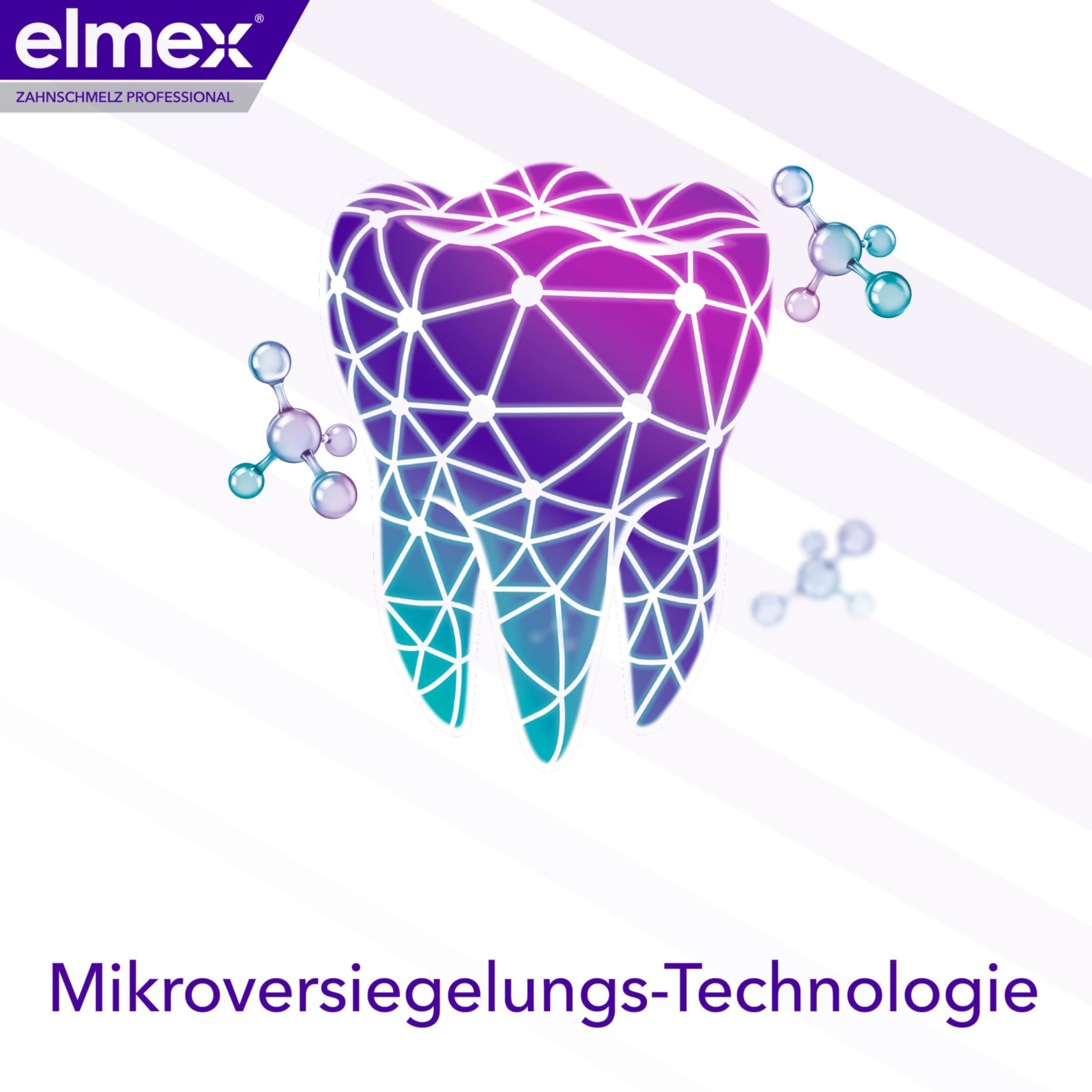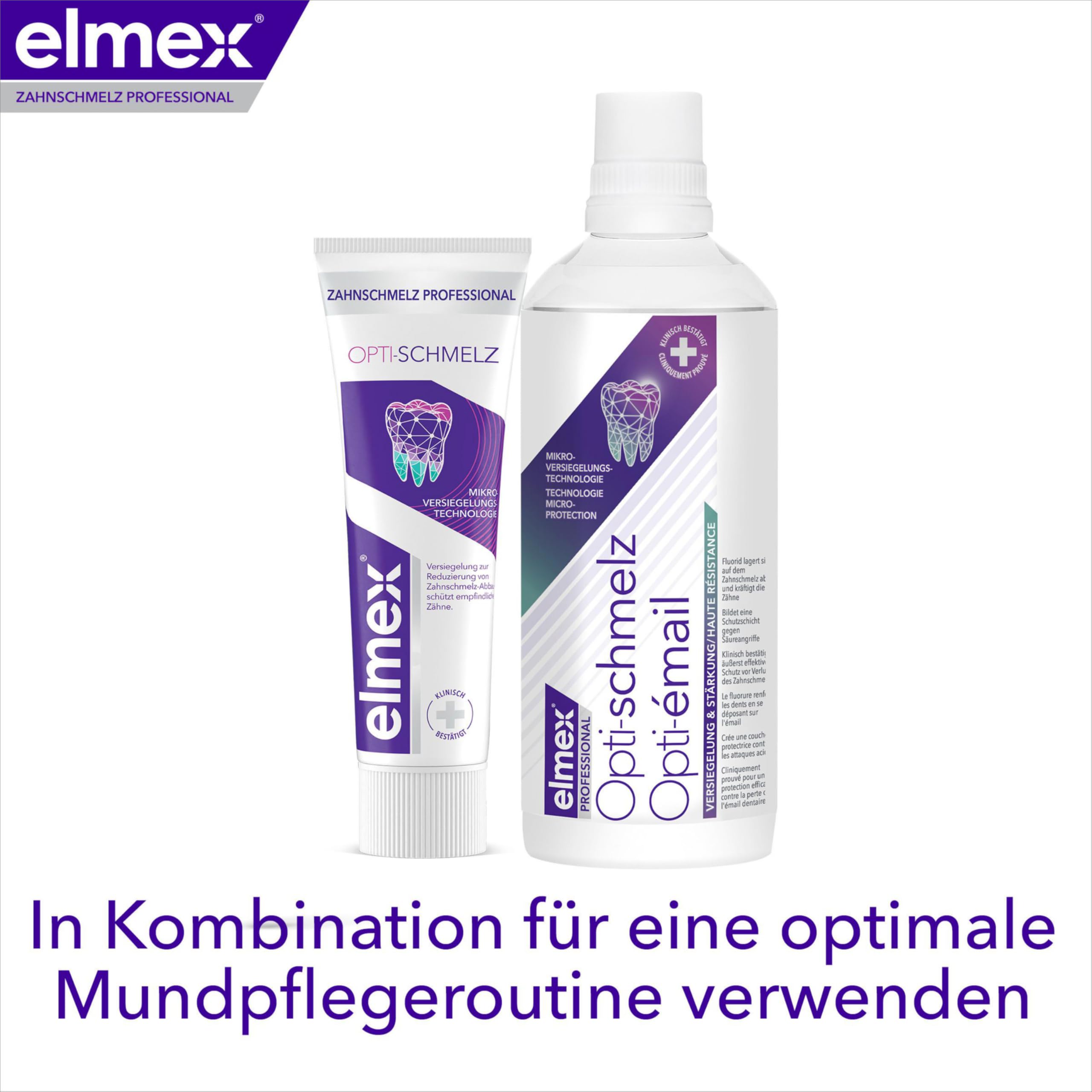elmex Professional Opti-schmelz Versiegelung & Stärkung Zahnpasta – schützt vor Zahnschmelz-Verlust Für langanhaltend starke und gesunde Zähne muss eine Reduzierung des Zahnschmelzes aufgrund etwaiger Säureangriffe durch Speisen und Getränke verhindert werden.Die elmex Professional Opti-schmelz Versiegelung & Stärkung Zahnschmelz Zahnpasta schützt die Zähne hochwirksam vor Zahnschmelzverlust. Die Mikroversiegelungs-Technologie der Zahnpasta legt eine Schutzschicht über die Zahnoberfläche gegen Säureangriffe und reduziert gleichzeitig den Zahnschmelzverlust um bis zu 34 %*. Das enthaltene Fluorid mineralisiert und stärkt die Zähne gegen Karies. Für einen präventiven Zahnschutz verhindert die elmex Zahnpasta mit klinisch betätigter Formel die Auflösung und den Abbau von Zahnschmelz und ist für die tägliche Anwendung geeignet.Für optimale Ergebnisse bei der Pflege von geschwächtem, abbauendem Zahnschmelz empfehlen wir die zusätzliche Nutzung der elmex Optischmelz Zahnbürste und elmex Professional Optischmelz Versiegelung & Stärkung Mundspülung.Anwendung: Die Zähne mindestens zweimal täglich putzen oder den Empfehlungen des Zahnarztes folgen. Nicht für die Verwendung bei Kindern unter 7 Jahren geeignet.Die Produktvorteile im Detail:elmex Professional Opti-schmelz Versiegelung & Stärkung ZahnpastaSchutz zur Reduzierung des Zahnschmelzverlustes um bis zu 34 %*Beugt mit Mikroversiegelungs-Technologie kleinsten Zahnschmelzauflösungen vorMineralisiert und stärkt mit Fluorid die ZähneKlinisch bestätigtZur täglichen Anwendung geeignetInhalt: 1x75 ml Tube*Im Vergleich zu fluoridfreier Zahnpasta.