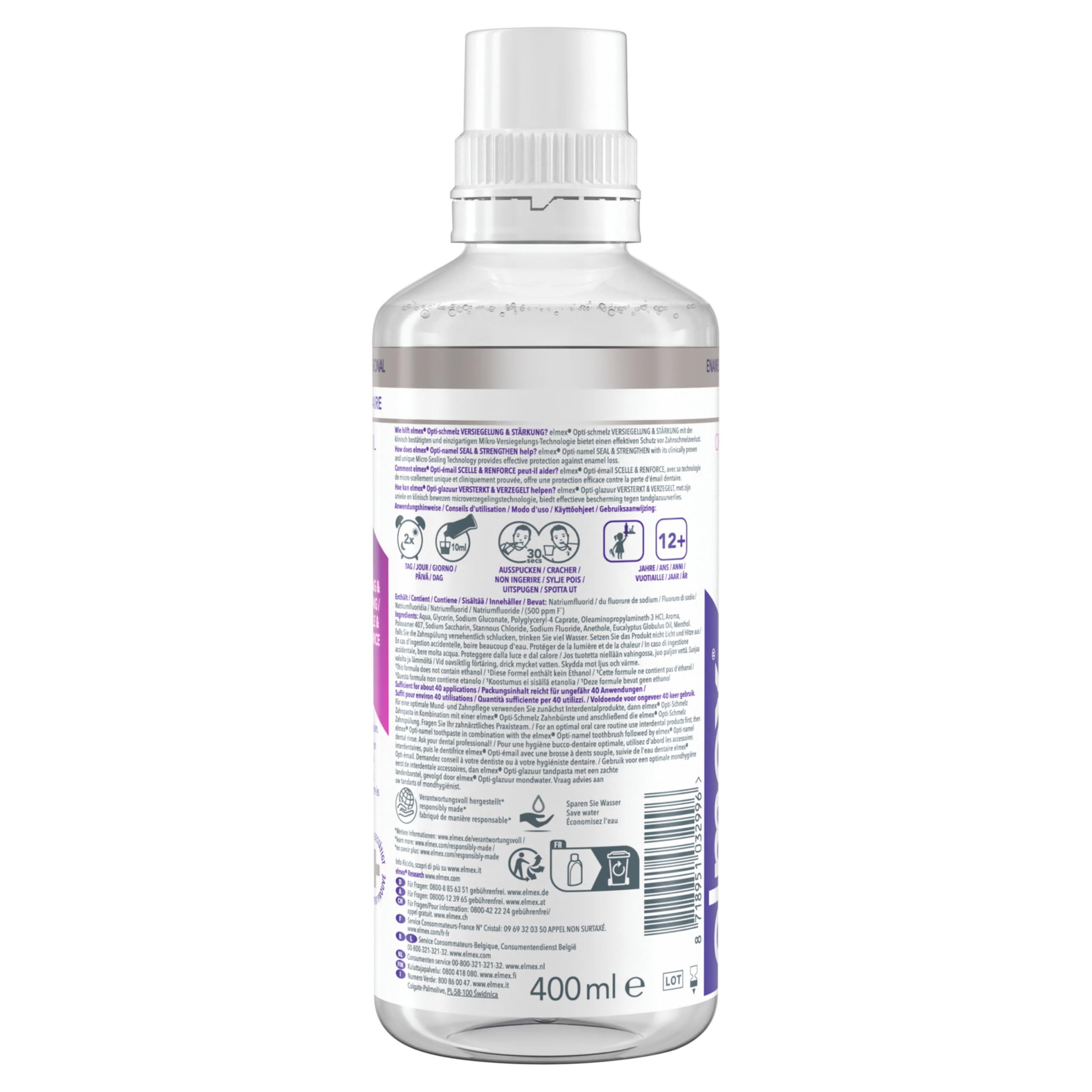 elmex Mundspülung Professional Opti-schmelz Versiegelung & Stärkung – schützt vor Zahnschmelz-VerlustFür langanhaltend starke und gesunde Zähne muss eine Reduzierung des Zahnschmelzes aufgrund etwaiger Säureangriffe durch Speisen und Getränke verhindert werden.Die elmex Professional Opti-schmelz Versiegelung & Stärkung Mundspülung schützt die Zähne hochwirksam vor Zahnschmelzverlust. Die Mikroversiegelungs-Technologie des Mundwassers legt eine Schutzschicht über die Zahnoberfläche gegen Säureangriffe und reduziert gleichzeitig den Zahnschmelzverlust um bis zu 67 %*. Das enthaltene Fluorid mineralisiert und stärkt die Zähne gegen Karies. Für einen präventiven Zahnschutz verhindert die alkohol- und farbstofffreie elmex Mundspülung mit klinisch bestätigter Formel die Auflösung und den Abbau von Zahnschmelz und ist für die tägliche Anwendung geeignet.Für optimale Ergebnisse bei der Pflege von geschwächtem, abbauendem Zahnschmelz empfehlen wir die zusätzliche Nutzung der elmex Professional Optischmelz Versiegelung & Stärkung Zahnpasta und elmex Optischmelz ZahnbürsteAnwendung: Den Mund zweimal täglich mit 10 ml für etwa 30 Sekunden, danach gurgeln und ausspucken. Verwendung der Dosierhilfe: Flasche langsam drücken, um die richtige Menge (10ml) zu erhalten – überschüssige Menge fliesst zurück in die Flasche. Nicht schlucken. Nicht mit Wasser nachspülen. In Ergänzung zum täglichen Zähneputzen, nicht öfter als 3 x täglich. Nicht für die Verwendung bei Kindern unter 12 Jahren geeignet.Die Produktvorteile im Detail: elmex Professional Opti-schmelz Versiegelung & Stärkung MundwasserSchutz zur Reduzierung des Zahnschmelzverlustes um bis zu 67 %*Beugt mit Mikroversiegelungs-Technologie kleinste Zahnschmelzauflösungen vorStärkt mit Fluorid die ZähneKlinisch bestätigtZur täglichen Anwendung geeignetInhalt: 1x400 ml Flasche*Im Vergleich zu Placebo (kein Zinn, kein Fluorid).