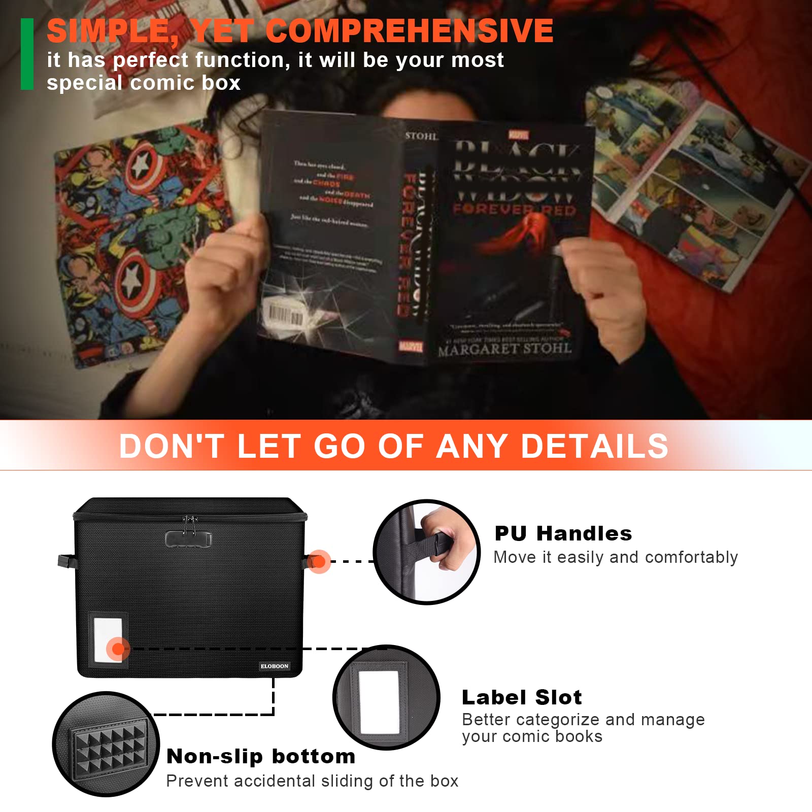 - 【Geeignete Grösse】Innenmasse 38,6 x 18,0 x 27,9 cm. Aussenmasse 39.6 cm x 19.1 cm x 29.0 cm Die robuste, grosse Comic-Buchbox von ELOBOON bietet eine hervorragende Lösung für Organisation und Aufbewahrung. Es ist perfekt für Ihre Bagged und Boarded Comics. Die Comic-Buchbox hat PU-Griffe, die Ihnen helfen können, sich leicht in jede Position zu bewegen, und hat einen Etikettenschlitz, der Ihnen helfen kann, Comic-Bücher besser zu kategorisieren. Es wird ein guter Begleiter für Ihre Comic-Bücher sein.