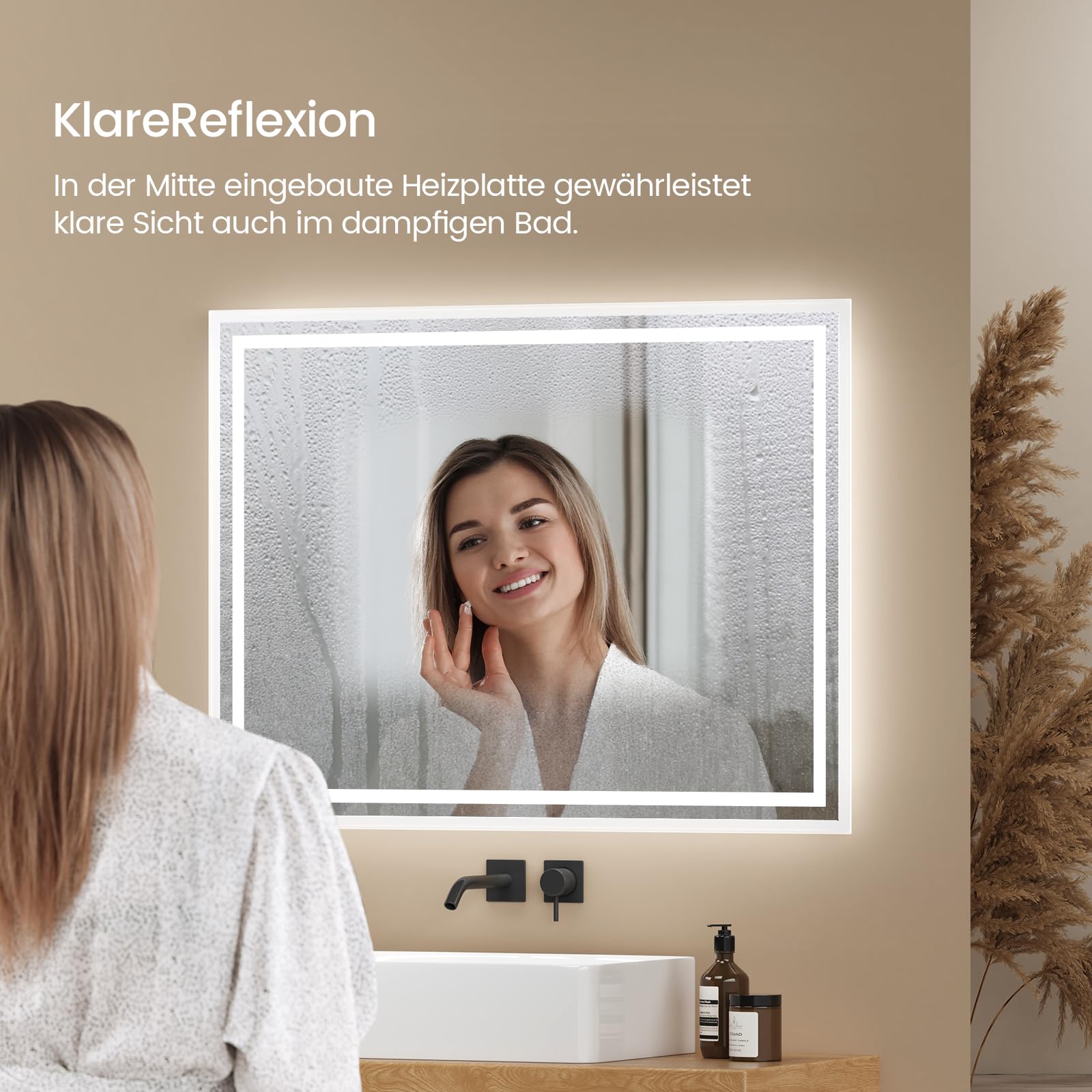 EMKE Badspiegel mit Beleuchtung 80x60 cm, 2 Lichtfarben (Warmweiss/Kaltweiss), beschlagfrei, Tastschalter, IP44, energiesparend, horizontal und vertikal montierbar – moderner Badezimmerspiegel