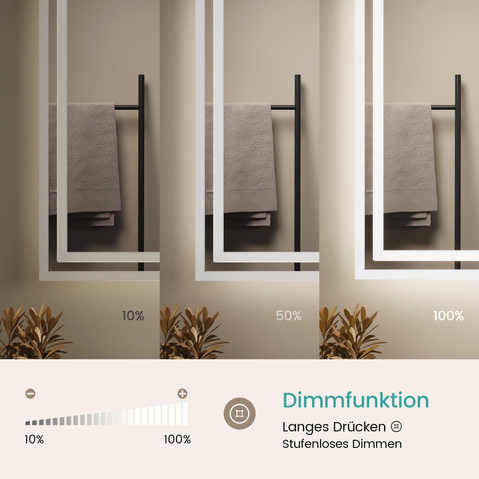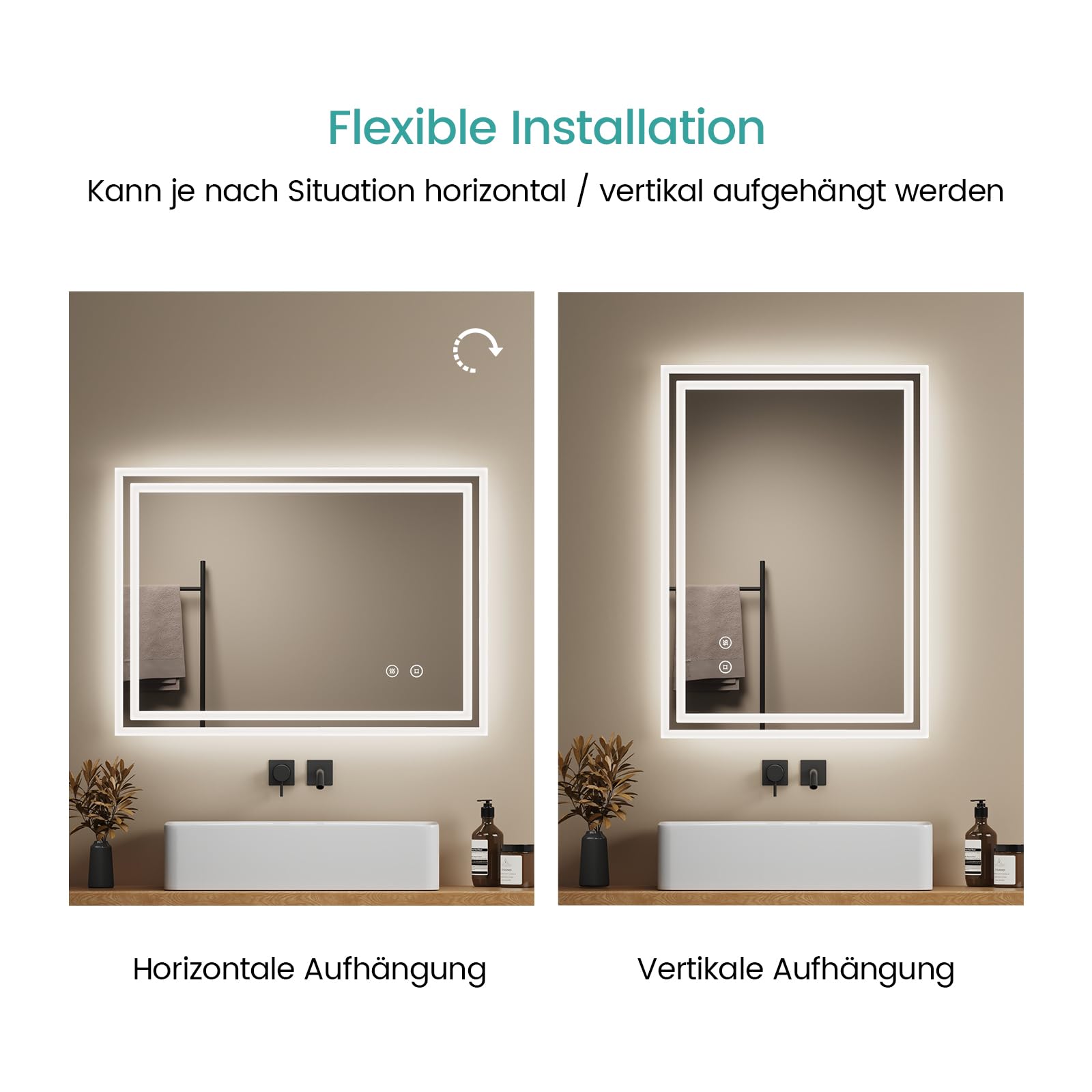 EMKE Badspiegel mit Beleuchtung 70x50 cm, kaltweiss dimmbar, beschlagfrei, Touch, Speicherfunktion, 3-Stunden-Autoabschaltung, IP44, energiesparender Badezimmerspiegel