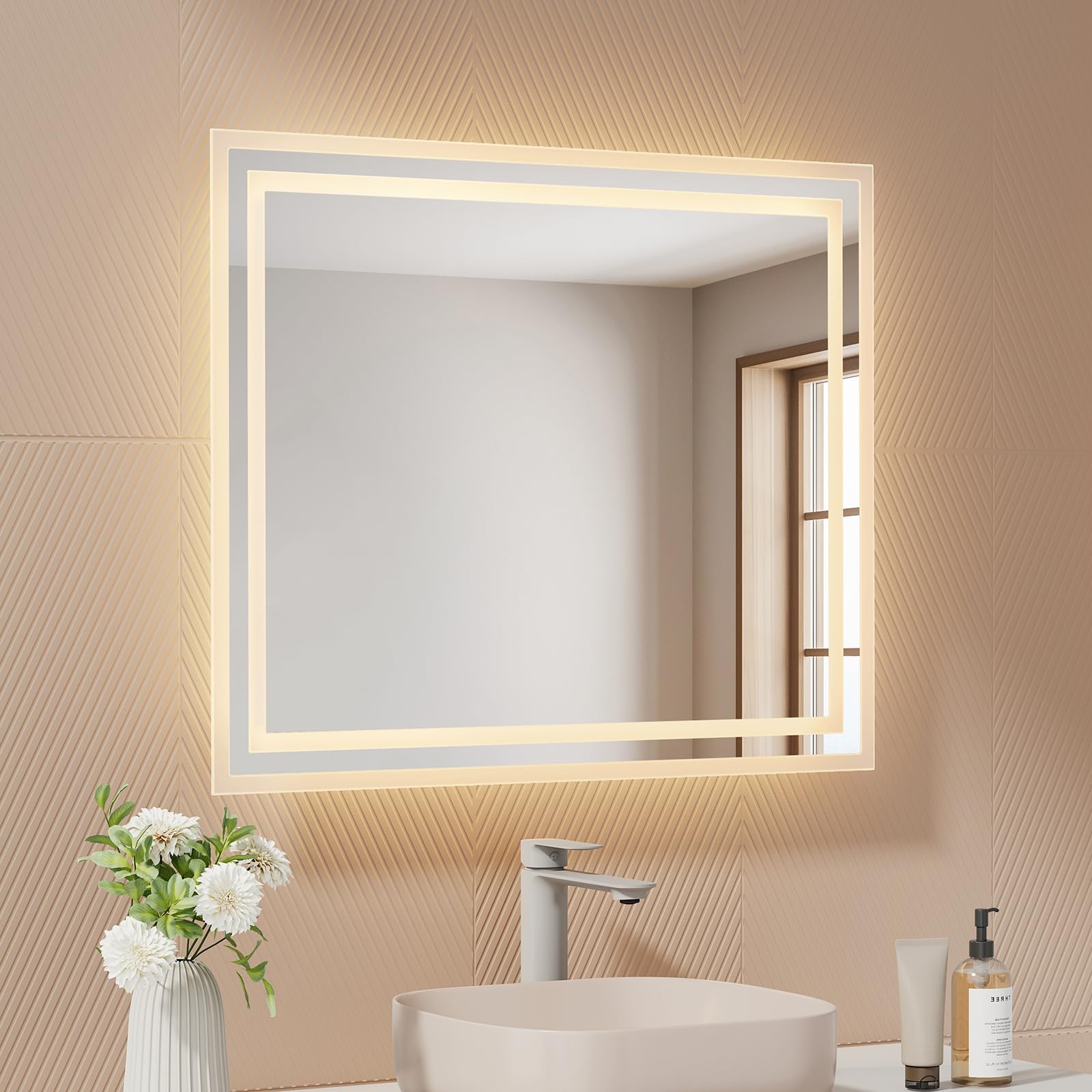 EMKE Badspiegel mit Beleuchtung 60x50 cm, 2 Lichtfarben (Warmweiss/Kaltweiss), beschlagfrei, Tastschalter, IP44, energiesparend, horizontal und vertikal montierbar – moderner Badezimmerspiegel