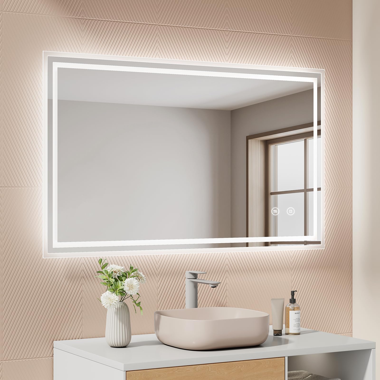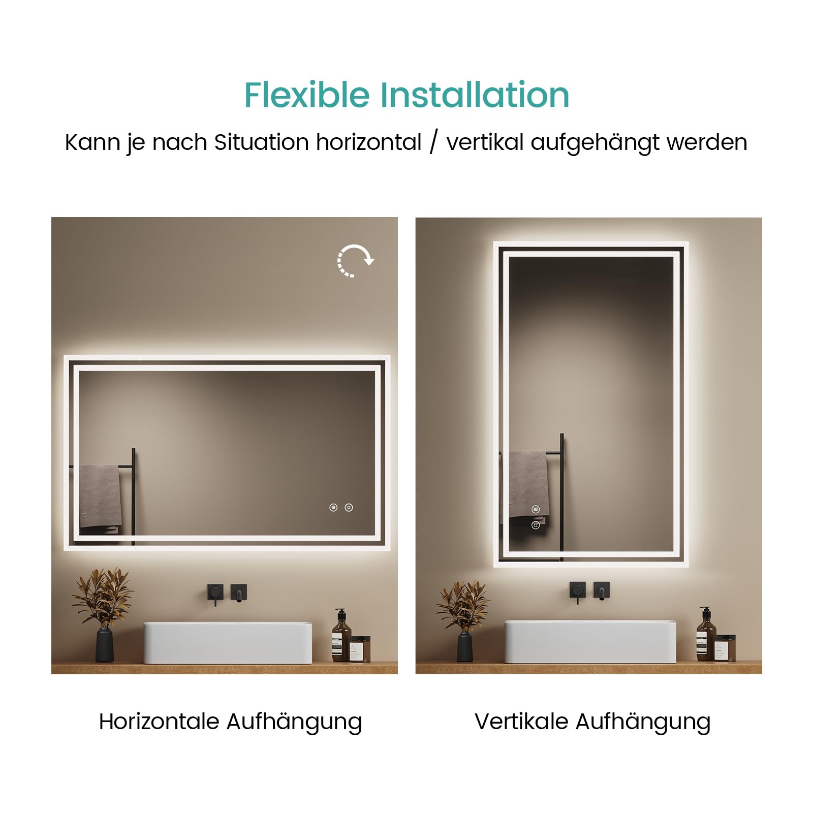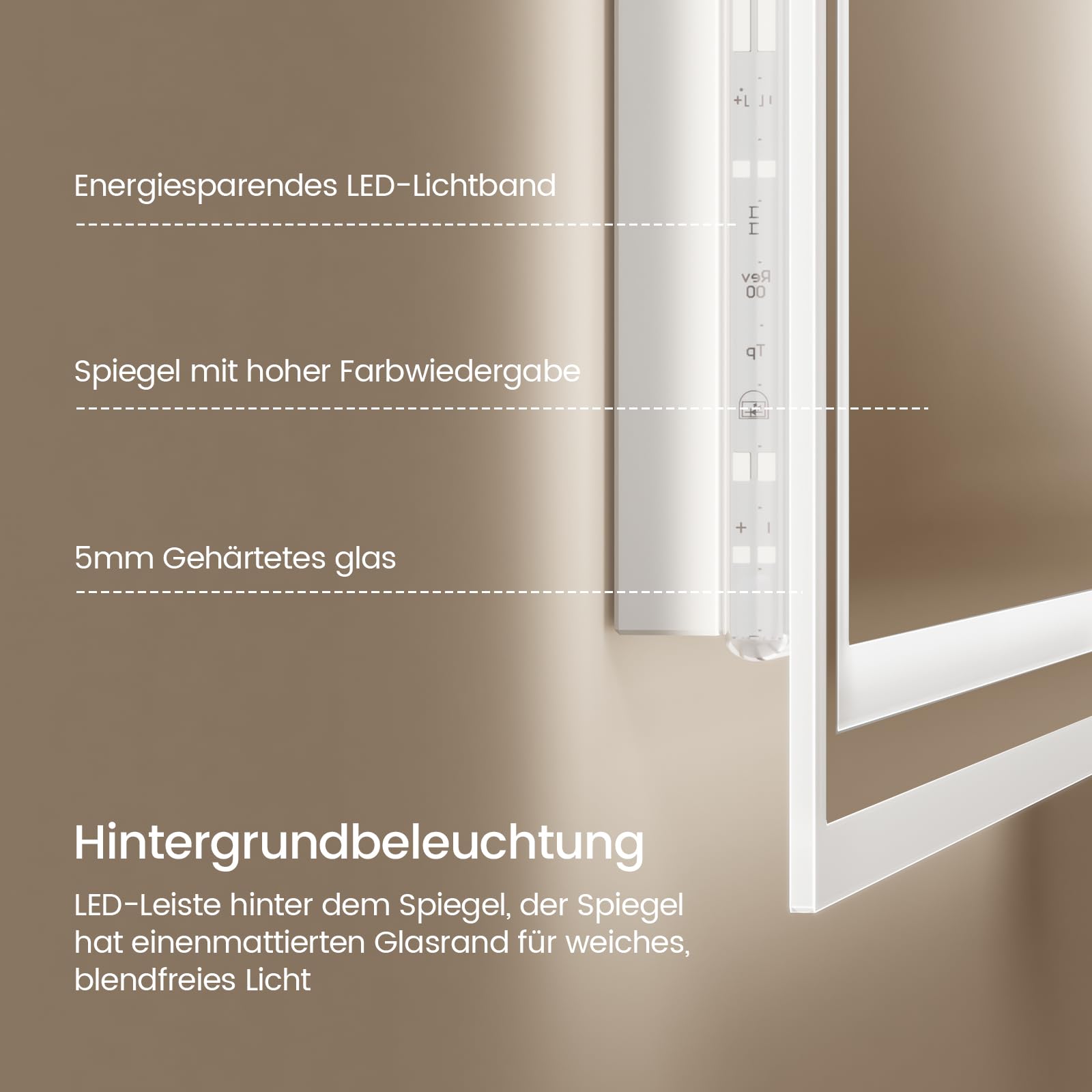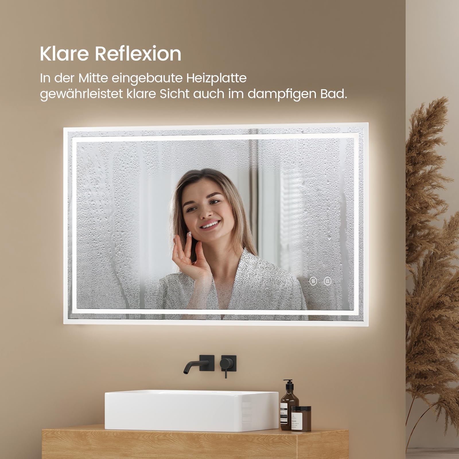 Entdecken Sie unseren brandneuen EMKE Badspiegel mit Beleuchtung, der Ihr Badezimmer in eine wahre Luxusoase verwandelt. Mit einer Vielzahl innovativer Funktionen, die sowohl für Komfort als auch für Ästhetik sorgen, ist dieser Badezimmerspiegel ein absolutes Must-have für Ihr Zuhause. Grösse: 100x60 cm Hochwertige Verpackung: 35 mm Schaumstoff + Polsterschicht + Folie + Eckenschutz LED Badspiegel-Funktionen: Touch, Kaltweiss Licht dimmbar, Anti-Beschlag, Memory-Funktion, 3 Stunden Auto-Abschaltung Einstellbare Helligkeit: Durch langes Drücken der Touch-Taste können Sie verschiedene Lichtintensitäten auswählen, um für jede Gelegenheit die perfekte Atmosphäre zu schaffen. Der Badspiegel mit Beleuchtung von EMKE verfügt über eine Speicherfunktion, die Ihre zuletzt eingestellte Helligkeit beibehält. Separate Antibeschlag-Funktion: Durch Drücken der Antibeschlag-Taste können Sie diese Funktion aktivieren und sicherstellen, dass der Badspiegel selbst während des Duschens oder Badens immer klar bleibt. Keine störenden Nebelflecken mehr in der Mitte des Badezimmerspiegels! Touchschalter: Dies ermöglicht Ihnen eine einfache und bequeme Bedienung des Spiegels. Darüber hinaus kann unser Badezimmerspiegel mit licht auch über den vorhandenen Wandschalter in Ihrem Zuhause gesteuert werden (der Touchschalter muss dabei eingeschaltet sein). Das macht ihn noch praktischer und bequemer in der Anwendung. Erleben Sie die Zukunft der Badezimmerbeleuchtung mit unserem Badezimmerspiegel mit Beleuchtung. Seine intelligente Technologie und stilvolle Erscheinung machen ihn zur perfekten Ergänzung für Ihr Zuhause. Holen Sie sich noch heute Ihren eigenen Badspiegel und geniessen Sie ein Badezimmererlebnis wie nie zuvor!