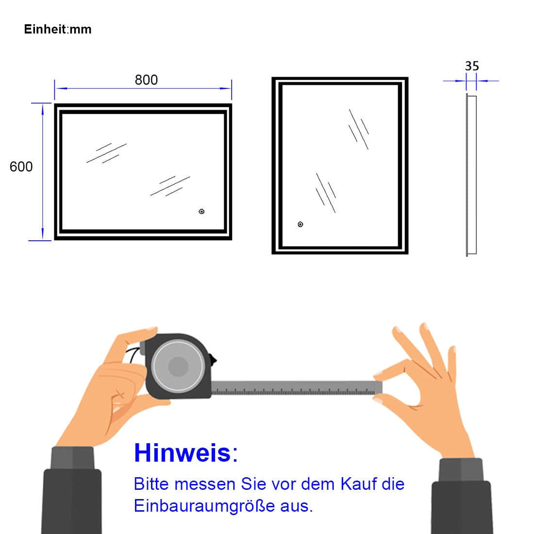 Eine sichere und unbeschädigte Lieferung hat Priorität für uns. Die LED-spiegel sind sicher eingepackt. Jeder Spiegel ist in einem verstärkten Karton von hoher Qualität verpackt. Das beeinflusst die Zustellung im unbeschädigten Zustand.