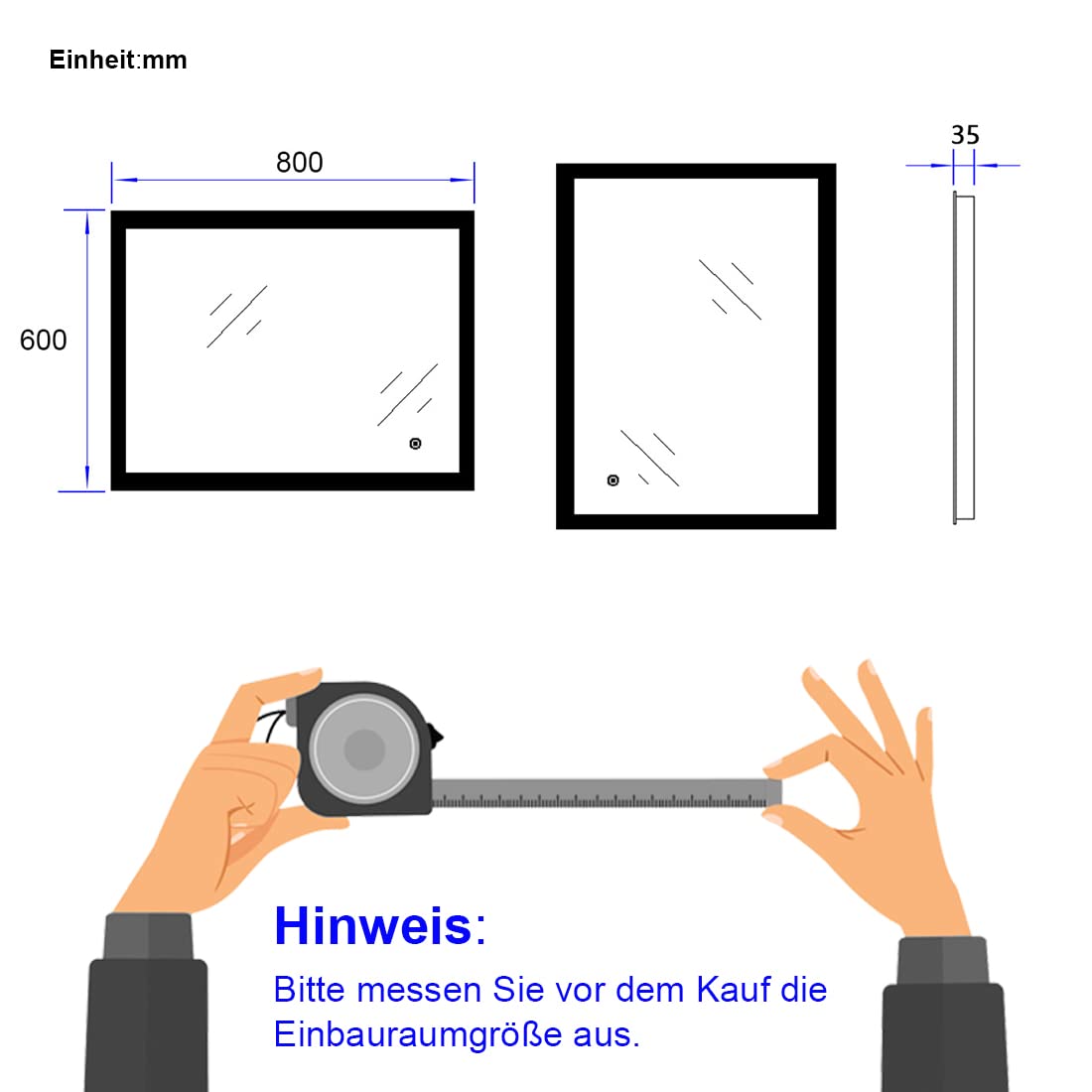 EIGENSCHAFTEN:Die Taste leuchtet milchig-weiss im eingeschalteten - und dezent-blau im ausgeschalteten ZustandDer Spiegel wird geschliffen und poliert, alle Kanten sind bestens verarbeitet und die Form ist in einem zeitgemässem Design. Das hochwertige Material und die professionelle Bearbeitung gewährleisten eine Sicherheitsgarantie bei der Spiegelmontage. Das Polieren der Spiegelfläche wird durchgeführt, um die erwünschte Glätte und den Glanz der Spiegel zu bekommen.Eine sichere und unbeschädigte Lieferung hat Priorität für uns. Die LED-spiegel sind sicher eingepackt. Jeder Spiegel ist in einem verstärkten Karton von hoher Qualität verpackt. Das beeinflusst die Zustellung im unbeschädigten Zustand.