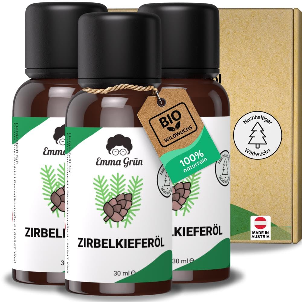 Emma Grün® Bio Zirbenöl [100% NATURREIN] - Echtes Zirbelkiefer Öl 3x 30ml aus Alpen Wildwuchs - WILDE ERNTE - Naturreines Ätherisches Öl - Waldiges Zirbenöl für Diffusor, Zirbenspäne & Sauna