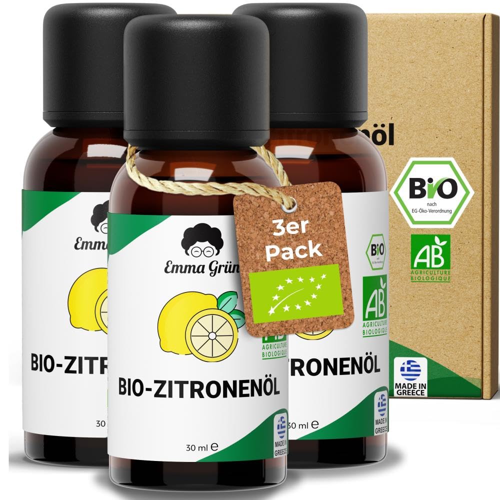 Emma Grün® Bio Zitronenöl Ätherisches Öl [100% Naturrein] - Zitronen Öl 3x 30ml - Ätherisches Öl Zitrone - Ätherische Öle Bio Naturrein - LEBENSMITTELQUALITÄT - Essential Oil Made in Greece