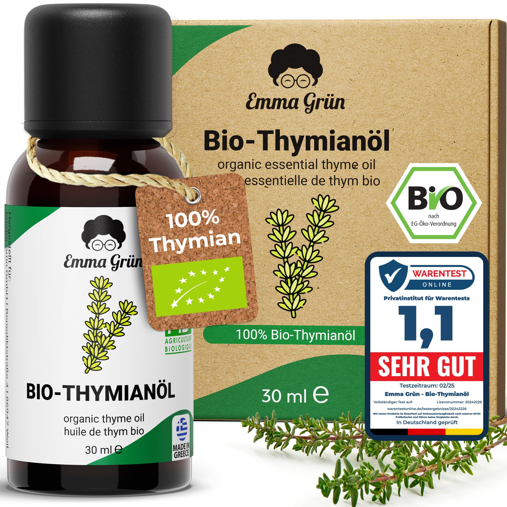 Emma Grün® Bio Thymianöl [100% Naturrein] - Ätherisches Öl 30ml - Würzig-Frisches Thymian Öl zum Einnehmen - Ätherische Öle aus Bio Thymian in LEBENSMITTELQUALITÄT - Essential Oils Aus Griechenland