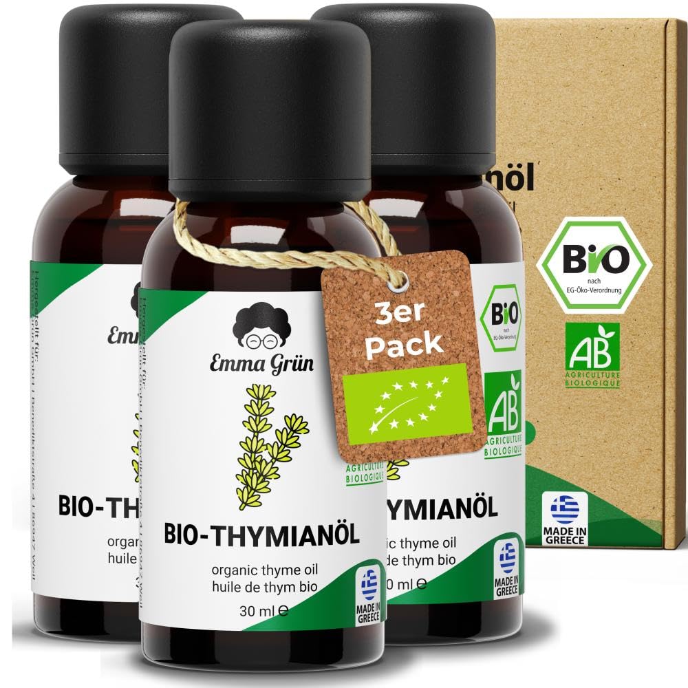 Emma Grün® Bio Thymianöl [100% Naturrein] - Ätherisches Öl 3x 30ml - Würzig-Frisches Thymian Öl zum Einnehmen - Ätherische Öle aus Bio Thymian in LEBENSMITTELQUALITÄT - Essential Oils Aus Griechenland