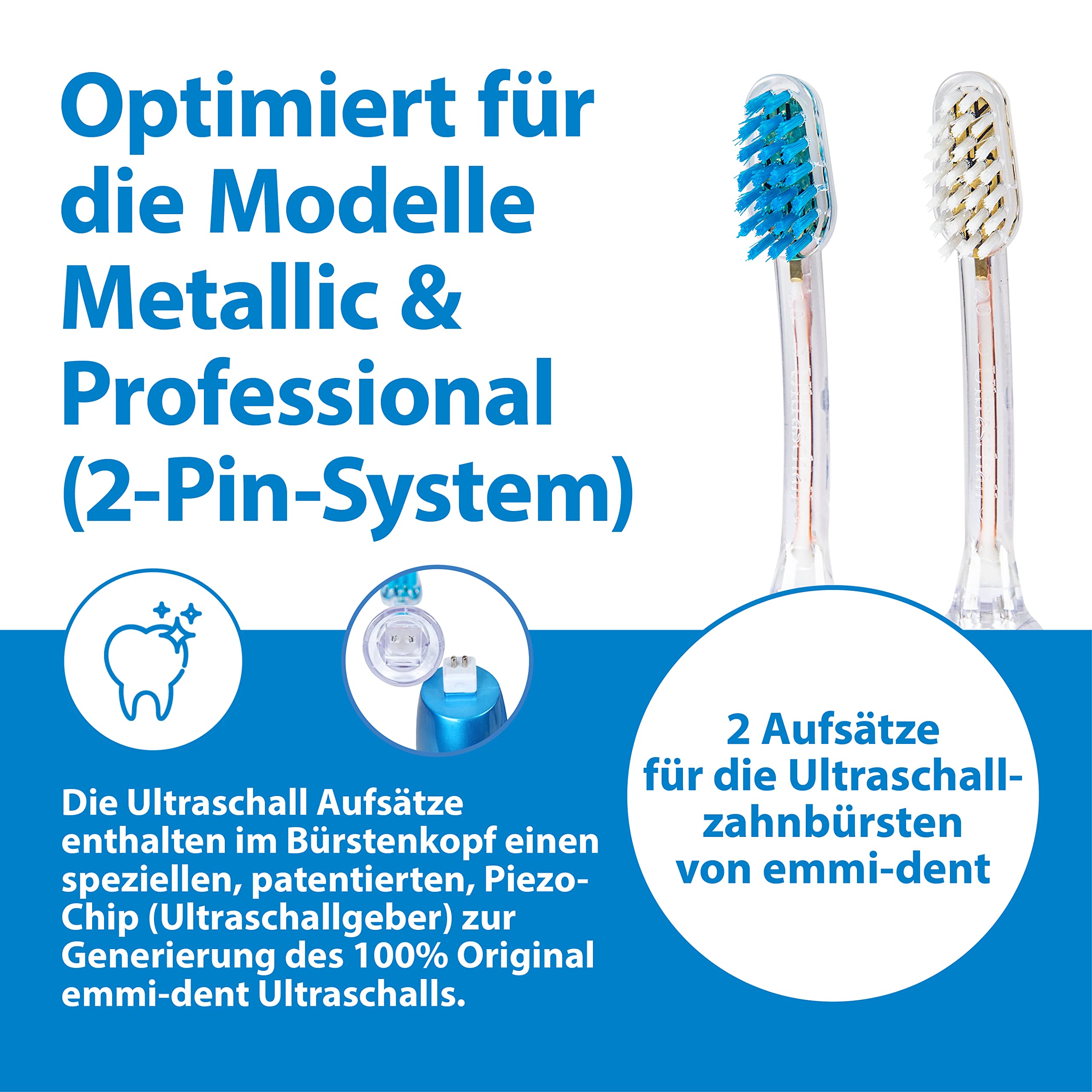 emmi-dent 2x Zahnbürstenaufsatz E2 (1x Blau+1x Weiss) I Ersatzbürsten in Standardform (ausgewogener Härtegrad, geraden Borsten) für emmi-dent Ultraschallzahnbürsten der Metallic- & Professional-Serie
