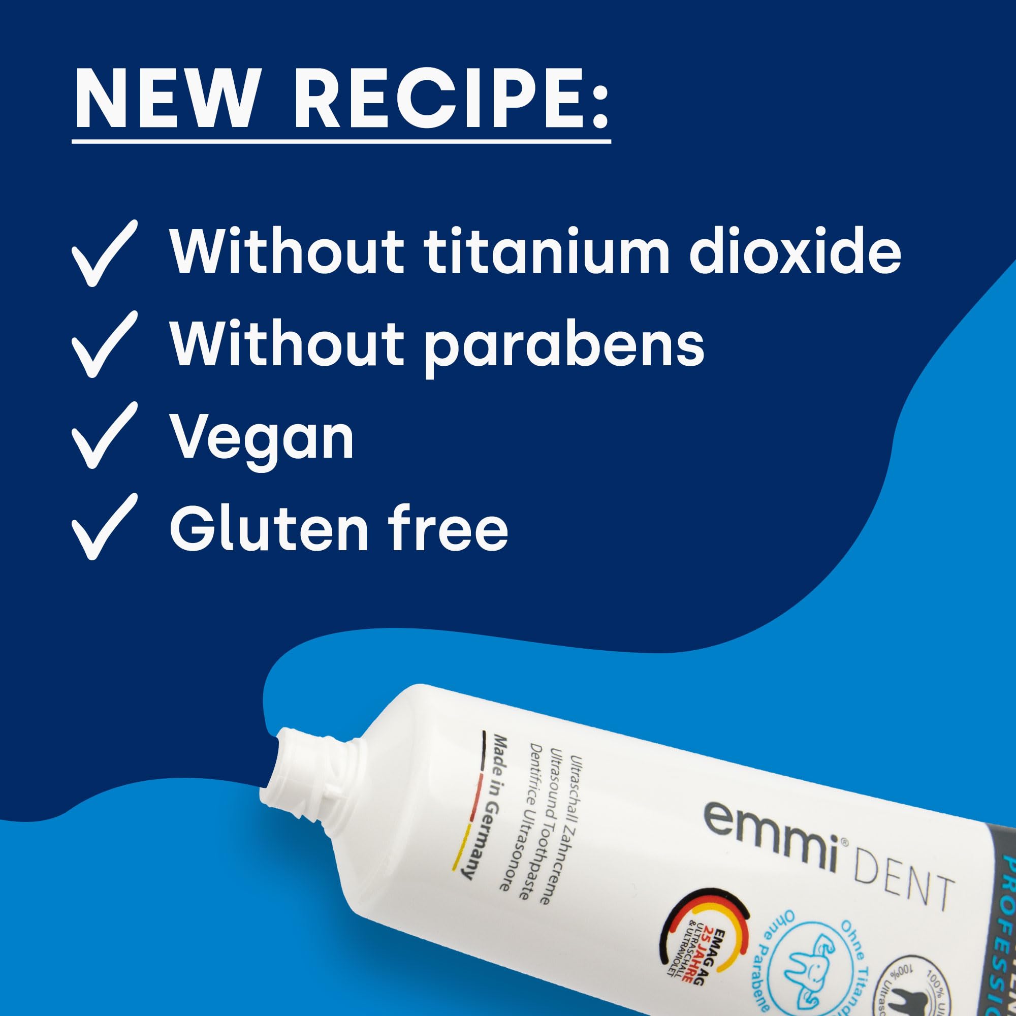emmi-dent Zahncreme – DIE Zahncreme für UltraschallzahnbürstenMit der innovativen emmi-dent Ultraschall-Zahncreme reinigen Sie Ihre Zähne, ohne zu bürsten. Halten Sie einfach eine Ultraschallzahnbürste (wie z. B. die emmi-dent Metallic) knapp über die Zähne und die patentierte Funktionsweise erledigt den Rest. Wie funktioniert es?Die Zahnpasta ist mit Millionen von Mikrobläschen angereichert, welche sind rund hundertfach kleiner sind als ein Plaque-Bakterium (Bestätigung der Goethe Universität Frankfurt a. Main). Diese Bläschen implodieren, sobald sie dem Ultraschall ausgesetzt sind. Durch die Sogwirkung der Implosion werden Plaque, Zahnstein, Bakterien, Zahnbelag und selbst feinste Biofilme auf den Zähnen, in den Zwischenräumen sowie Zahnfleischtaschen gelöst.Damit kann die Zahnpasta sogar die Stellen erreichen, welche normale Borsten niemals erreichen können. Sie können die Zähne reinigen, ohne schrubben zu müssen. Insbesondere ideal für Menschen mit empfindlichem, entzündetem oder schmerzhaftem Zahnfleisch.Die Art der Reinigung ist selbstverständlich völlig ungefährlich für den Menschen, Zahnfleisch sowie Zahnschmelz, es werden lediglich mikroskopisch grosse Bakterien und Zahnbeläge „angegriffen“.emmi-dent "whitening" enthält kein Gluten, Nanomaterialien oder Mikroplastik.