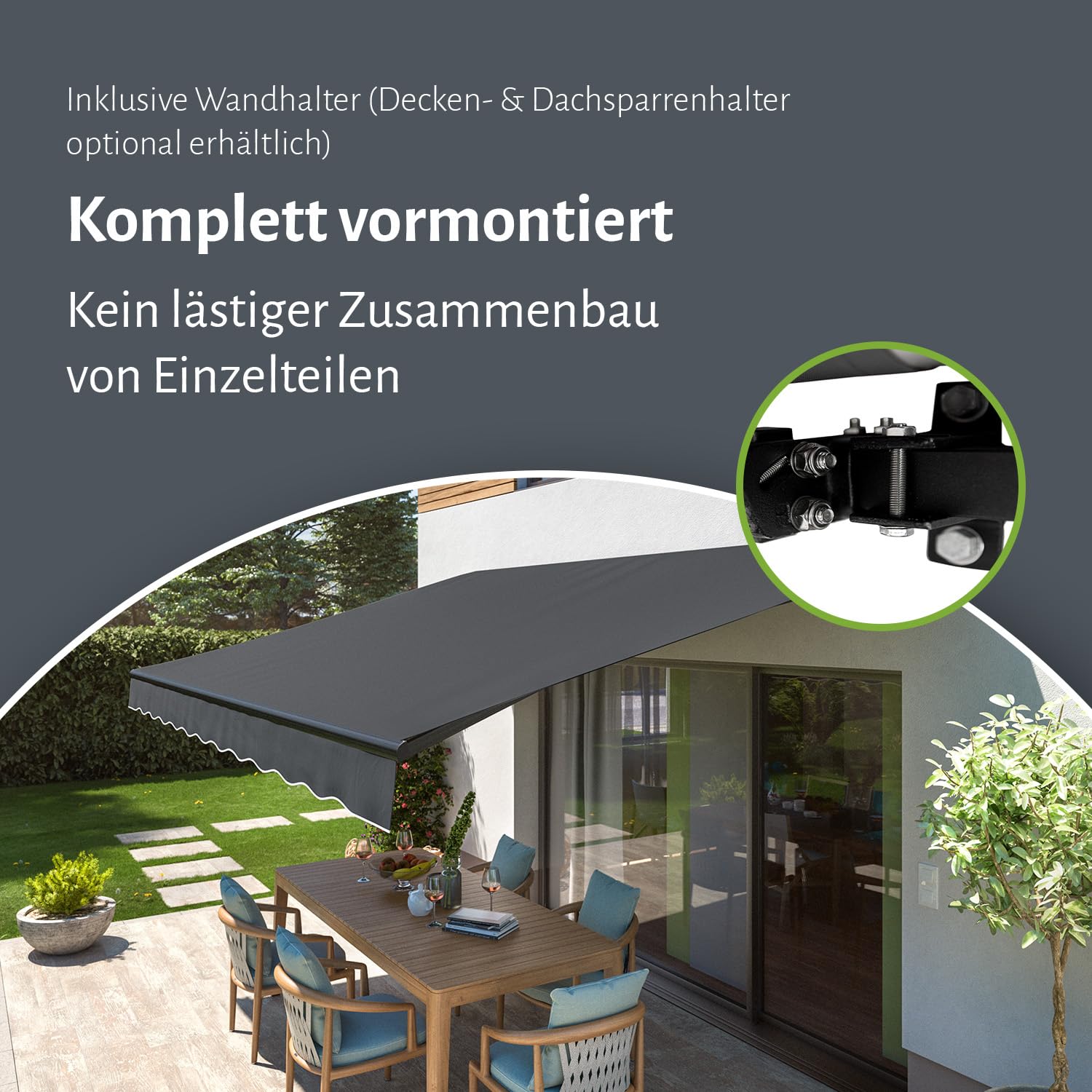 Unsere Gelenkarmmarkise steht Ihnen in zahlreichen Grössen und Farben zur Verfügung und überzeugt mit stabilem Rahmen und einer simplen Bedienung per Fernbedienung. Ob Terrasse oder Balkon - dank der modernen Optik wird Ihre Markise zum echten Hingucker! Für den Fall eines Stromausfalls wird eine Handkurbel für den manuellen Betrieb gleich mitgeliefert. Jedoch ist der manuelle Betrieb nicht für den täglichen Betrieb geeignet. Durch den stufenlos einstellbaren Neigungswinkel können Sie zu jeder Tageszeit im Schatten sitzen. Montiert wird die Markise mithilfe der mitgelieferten Wandhalter standardgemäss an der Wand. Alternativ können Sie sich aber eine Deckenhalterung für eine Montage an der Decke bestellen. Produktdetails: - verschiedene Farben & Grössen - elektrische Steuerung per Fernbedienung - eingebaute Wasserwaage - integrierter Neigungswinkel (5-45 Grad) - Alu-Rahmen in anthrazit/schwarz metallic ähnlich RAL 790-M - wasserabweisender Polyester Stoff - Stoffstärke 280g/m² (getestet nach EN 14500 und EN 14501) - Tuchwelle: ø 70 mm - UV-Schutz UPF 50+ - inkl. 2 Wandhalter (ohne Schrauben und Dübel) - inkl. Handkurbel - inkl. Fernbedienung und weissem Wandhalter - inkl. Einstellstab für Feinjustierung - optional mit Wind-Sonnen-Sensor ausstattbar - Seite Motor & Notkurbelaufnahme: rechts (Blick auf Markise) - Kabellänge: 1,5 m - WEEE-Nr.: DE 98877696 Hinweis Mietwohnung / Miethaus: Das Anbringen einer Markise ist eine bauliche und optische Veränderung einer Wohnanlage. Daher muss die Montage oder möglicherweise auch die Markisenfarbe mit Vermieter oder Eigentümergemeinschaft geklärt werden.