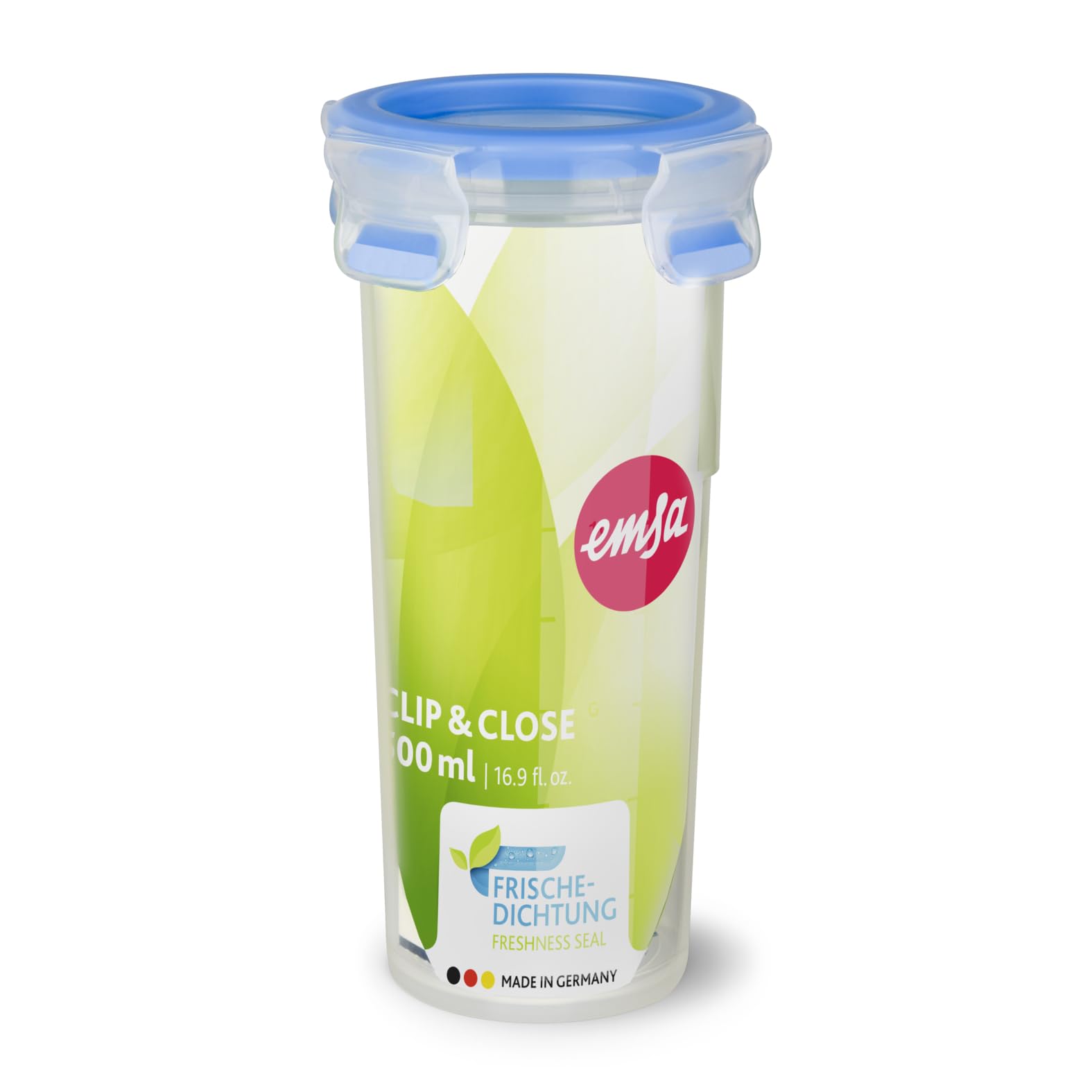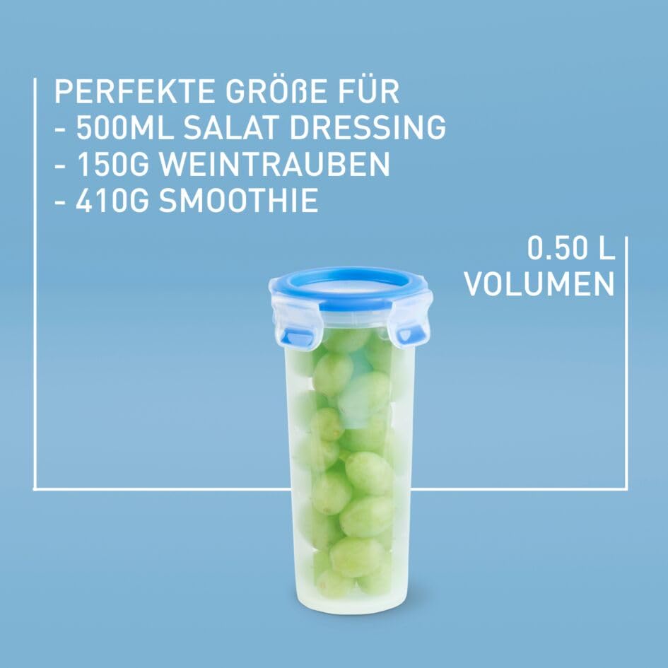 EMSA Clip & Close Trinkbecher, rund, 0,5 L, mit Deckel, Aufbewahrungsbox, 100 Prozent dicht, spülmaschinen-, gefrier-, mikrowellenfest, Transparent, Blau, Made in Germany, 508554