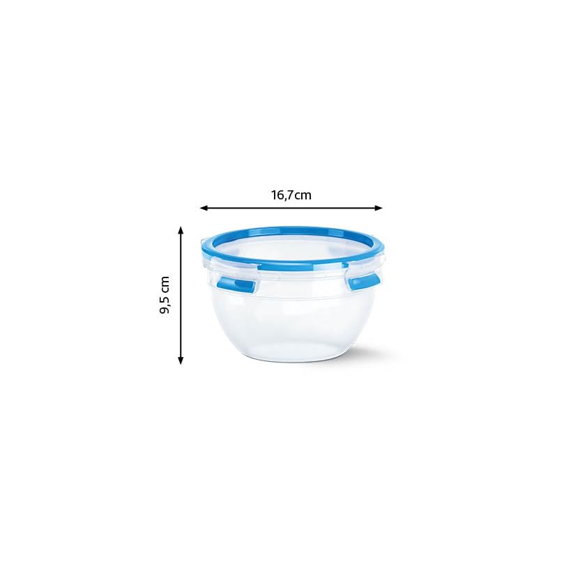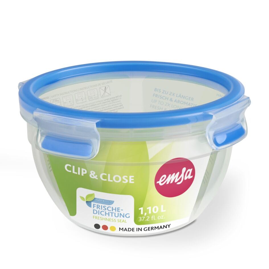 EMSA Clip & Close Frischhaltedose, rund, 1,1 L, mit Deckel, Aufbewahrungsbox, 100 Prozent dicht, spülmaschinen-, gefrier-, mikrowellenfest, Transparent, Blau, Made in Germany, 518096