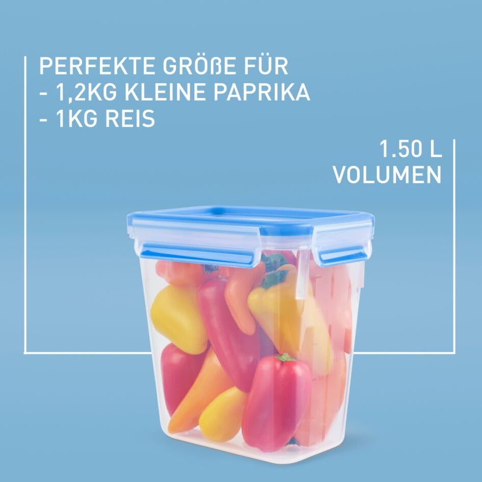 EMSA Clip & Close Frischhaltedose, rechteckig, 1,5 L, mit Deckel, Aufbewahrungsbox, 100 Prozent dicht, spülmaschinen-, gefrier-, mikrowellenfest, Transparent, Blau, Made in Germany, 508543