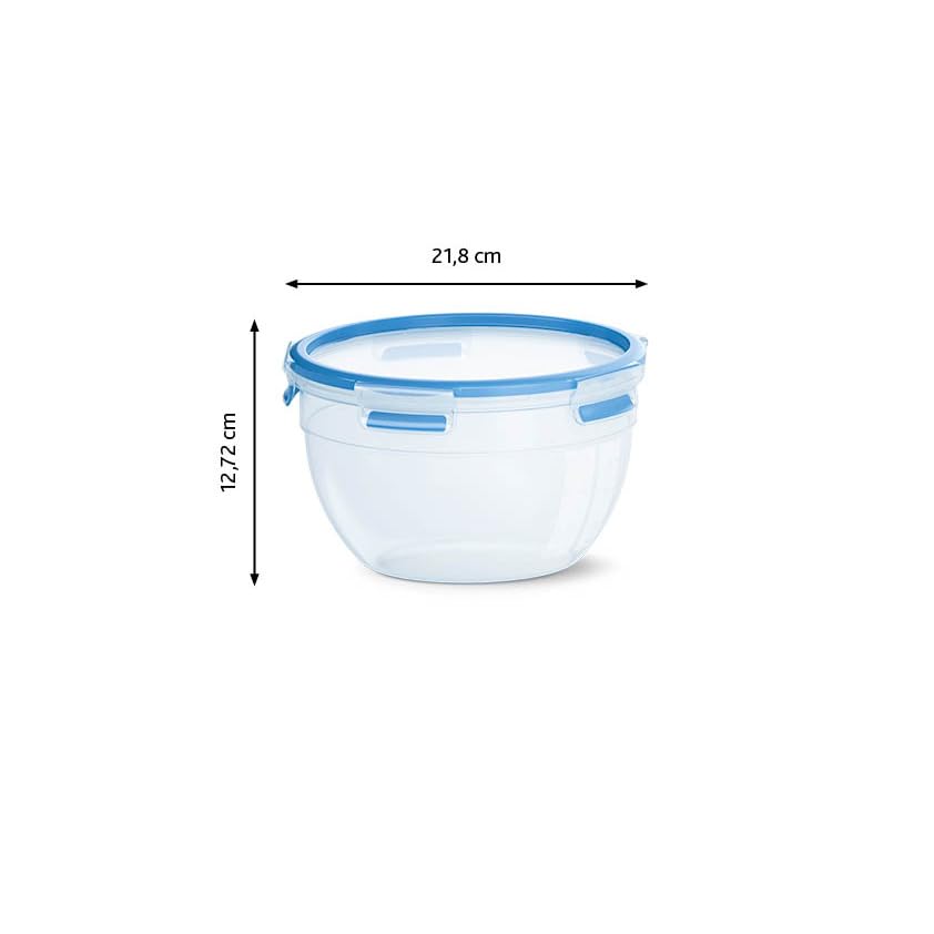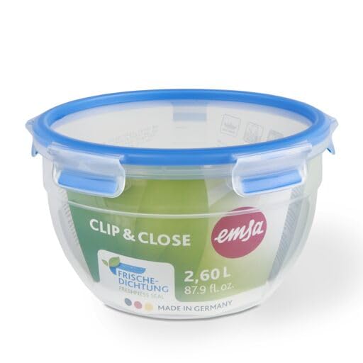 EMSA Clip & Close Frischhaltedose, rund, 2,6 L, Aufbewahrungsbox, 100 Prozent dicht, spülmaschinen-, gefrier-, mikrowellenfest, Transparent, Blau, Made in Germany, N10114