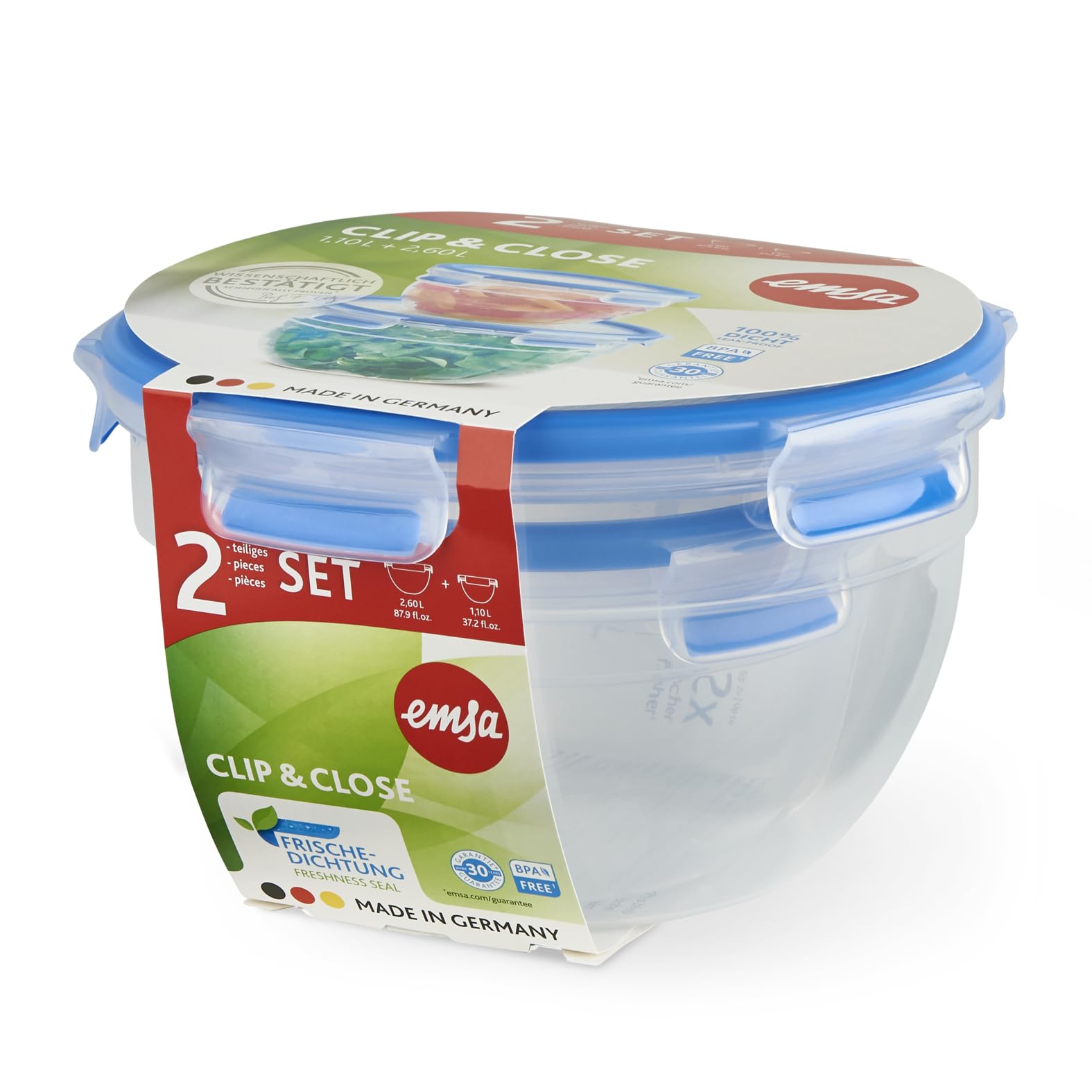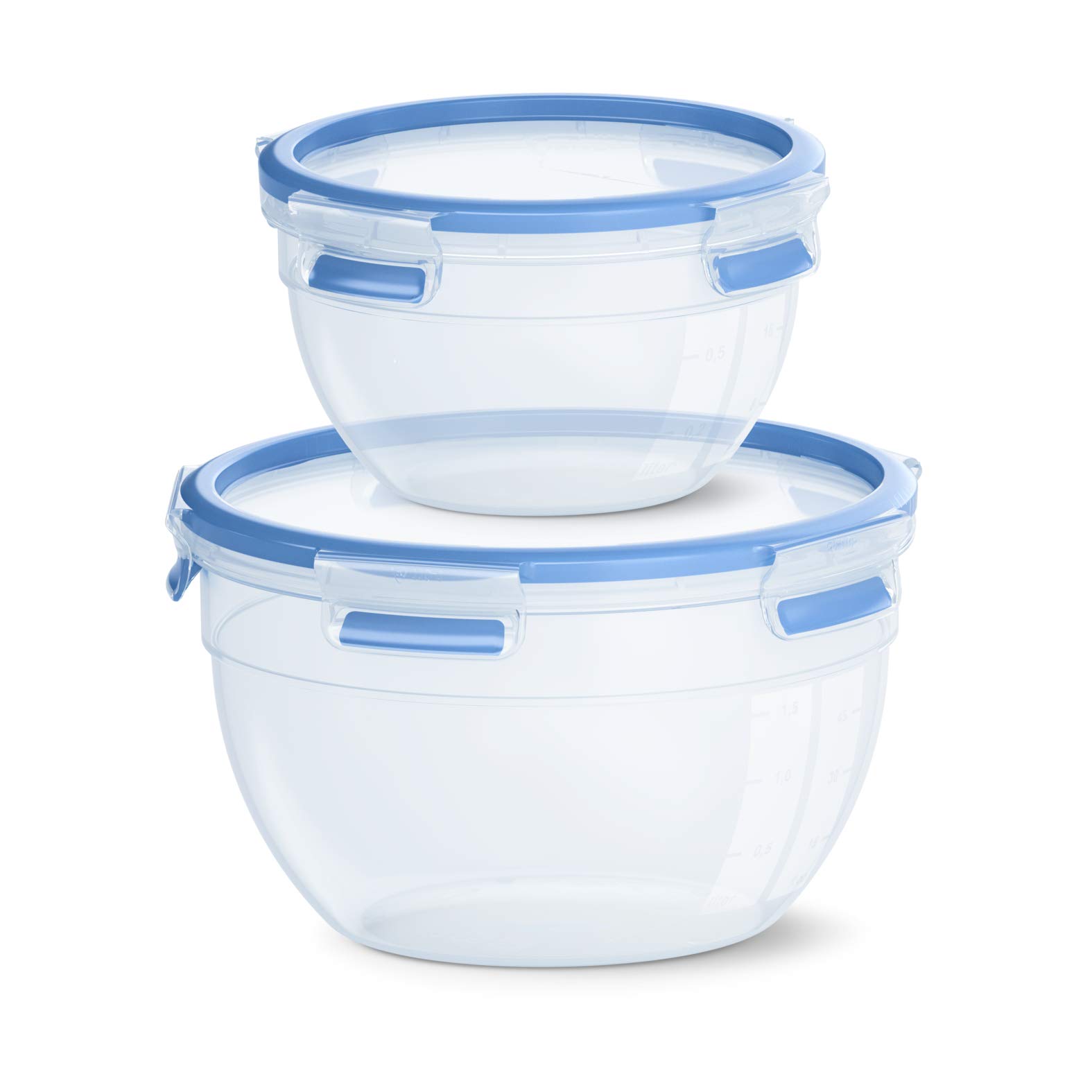 EMSA Clip & Close Frischhaltedosen-Set, rund, 1,1 L+ 2,6 L, Aufbewahrungsboxen, 100 Prozent dicht, spülmaschinen-, gefrier-, mikrowellenfest, Transparent, Blau, Made in Germany, N10116