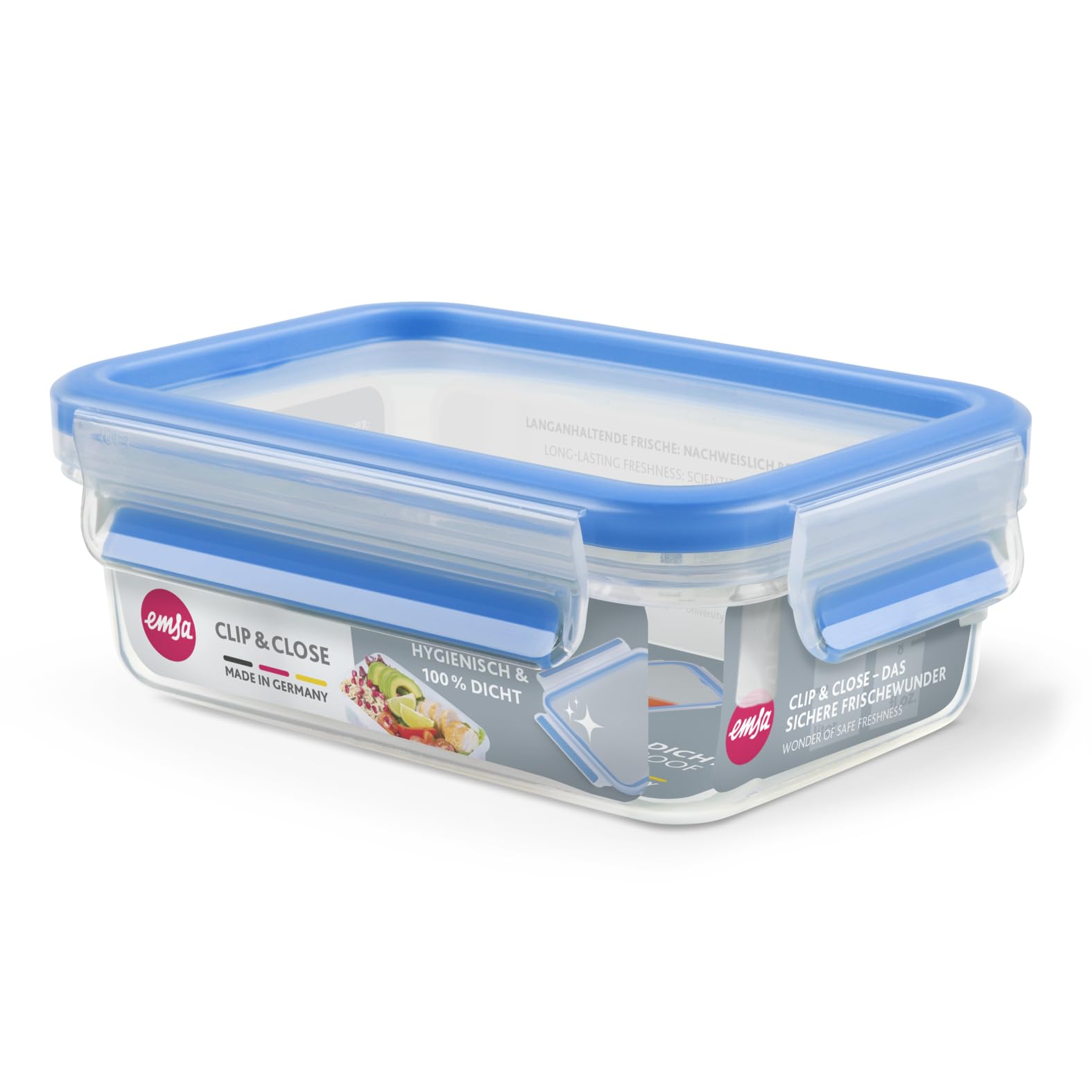 EMSA Clip & Close Frischhaltedose, rechteckig, 0,55 L, Aufbewahrungsbox, 100 Prozent dicht, spülmaschinen-, gefrier-, mikrowellenfest, Transparent, Blau, Made in Germany, 508538