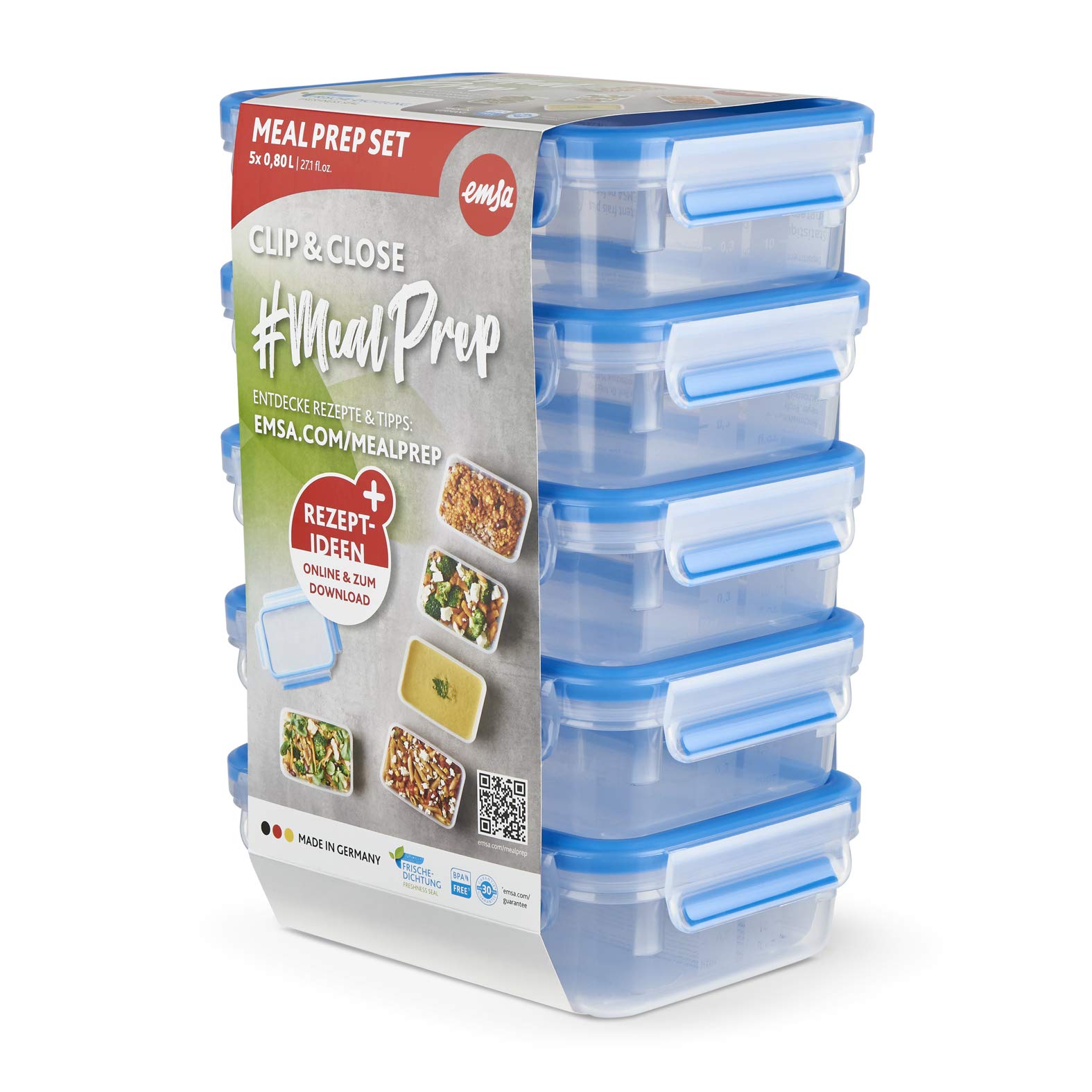 Perfekte Frischhaltung, transportsicher und hygienisch. Das Clip & Close Frischhaltedosen-Set von Emsa ist die optimale Vorratslösung für all Ihre Lebensmittel. 5 Teile für 5 Tage, eine Box für jeden Tag. Innovatives Verschlusssystem mit Clips für ein einfaches Öffnen und Schliessen. Ihre Lebensmittel bleiben sichtbar länger frisch. Dank der einzigartigen Frische-Dichtung im Deckel sind die Behälter nicht nur 100 % auslaufsicher, sondern auch 100 % hygienisch, da sie keine Zwischenräume haben, in denen sich Keime ansiedeln könnten.