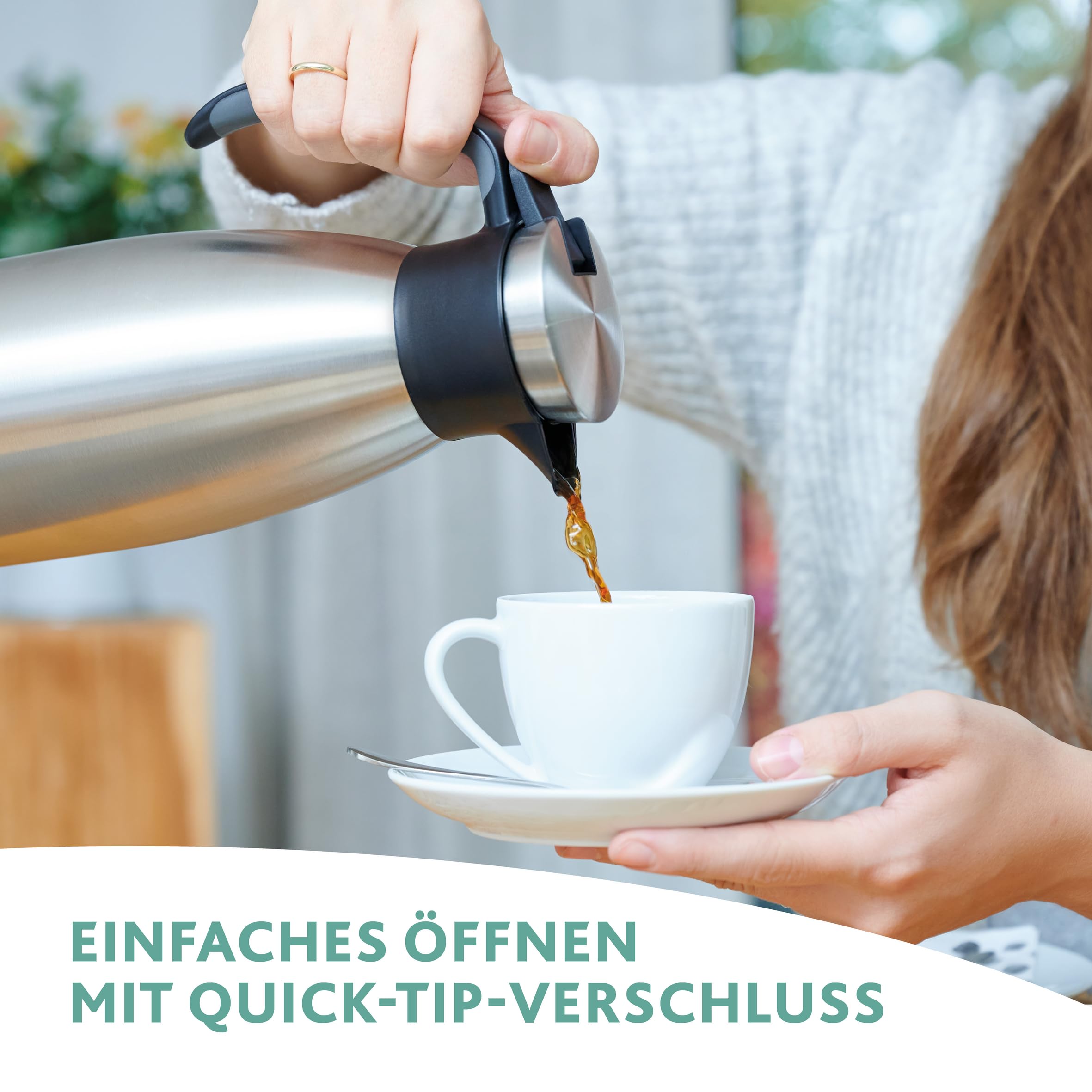 Die Soft Grip Edelstahlkanne pass dank der bunten Auwahl perfekt in Ihr Zuhause. Mit ihrer eleganten und schlanken Form eignet sich die Kanne für alle Gelegenheiten. Sie ist praktisch in der Handhabung, denn sie bietet einen angenehmen Halt und kann dank Quick-Tip-Verschluss mit nur einer Hand bedient werden. 100 % auslaufsicher. Soft Grip Isolierkanne aus Edelstahl, die perfekt in die Umgebung zuhause passt: in vier verschiedenen Farben erhältlich. Mit ihrer eleganten und schlanken Form eignet sich die Kanne für alle Gelegenheiten. Einfach zu bedienen durch angenehmen, rutschfesten Halt mit Einhandbedienung. 100 % auslaufsicher. Rutschfester und angenehmer Halt durch Soft Touch-Griff. Portionsgenaues Servieren. Einhandbedienung durch Quick Tip-Verschluss. 100 % dicht mit Tropfenfänger.