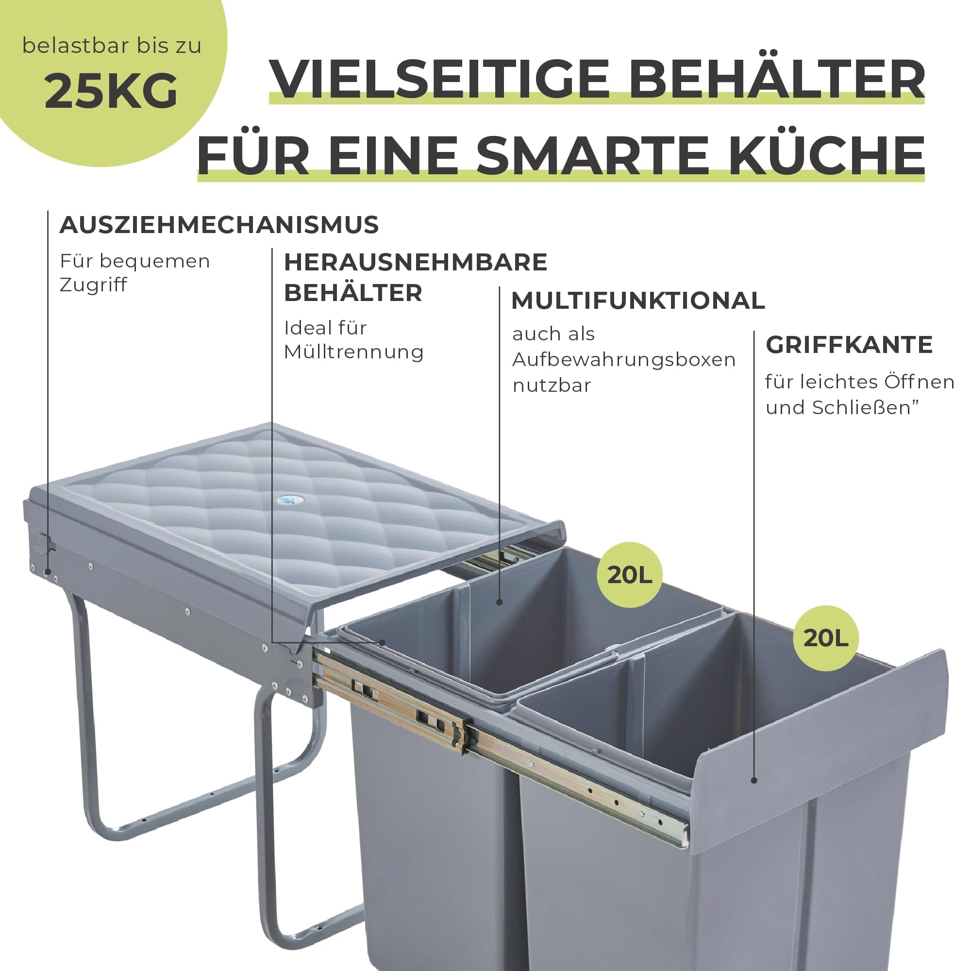 [en.casa] Einbaumülleimer Froland Mülleimer 2 Fächer Mülltrennsystem ausziehbar Abfalleimer Küche 2x20L herausnehmbare Behälter 48 x 34 x 42 cm Küchenmülleimer Grau