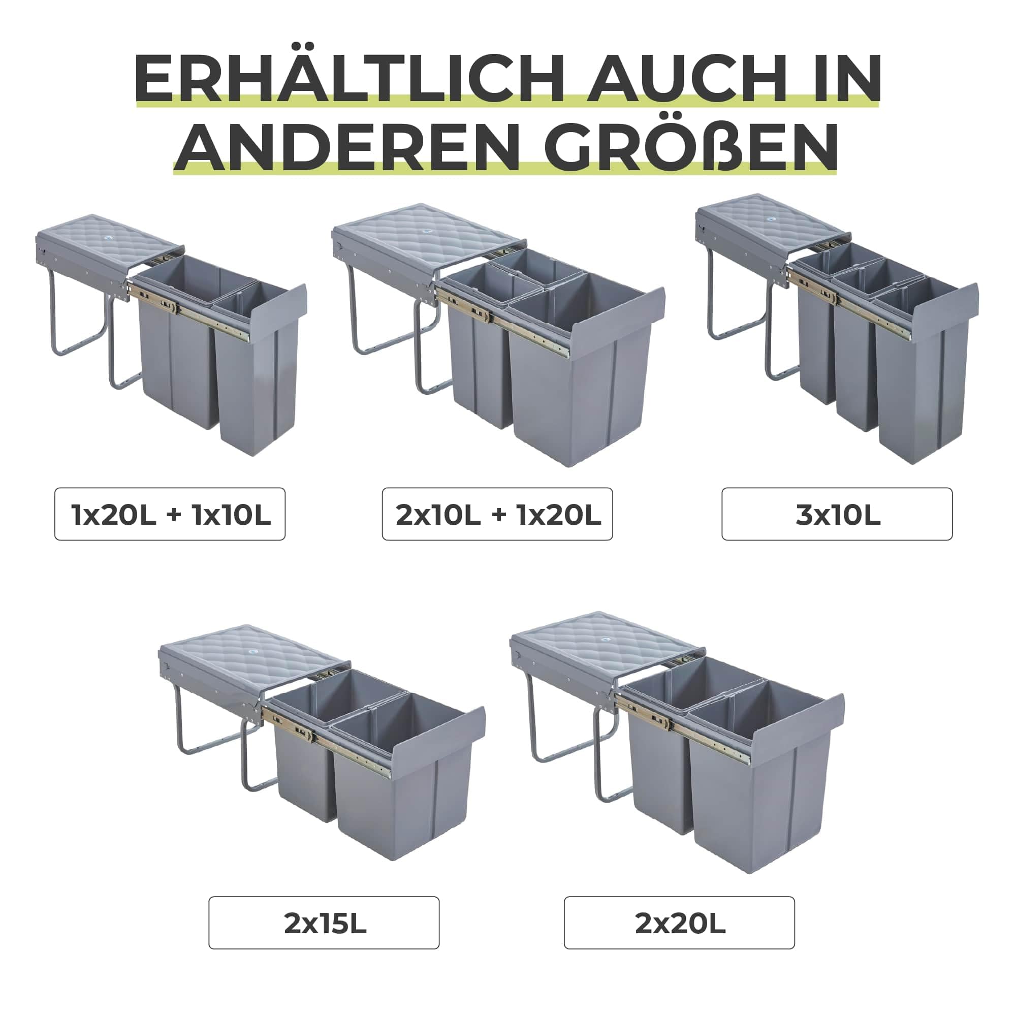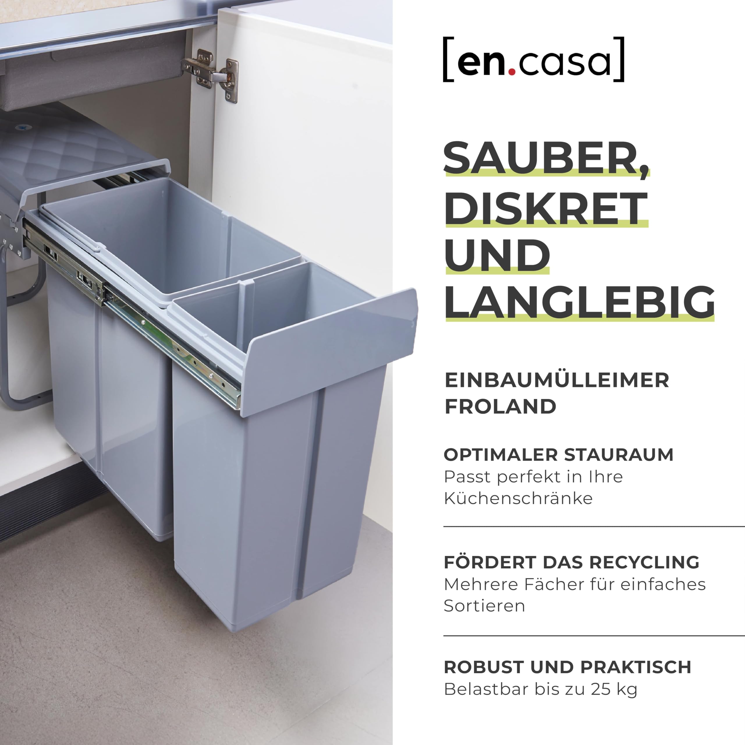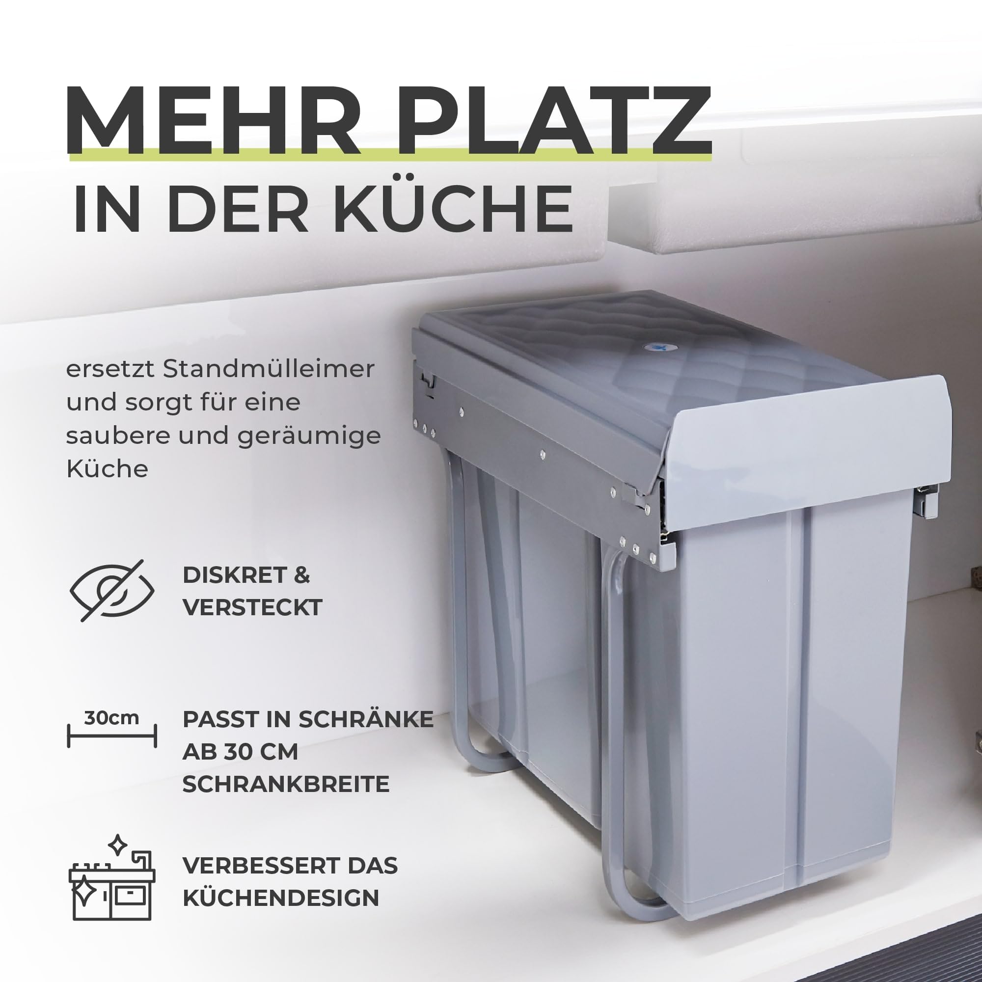 Der Einbau-Abfallsammler ist die perfekte Lösung, um Platz und Ordnung in Ihrer Küche zu schaffen. Er passt perfekt in Ihren Unterschrank und sorgt dafür, dass Ihre Küche aufgeräumt und frei von störenden Mülltonnen ist. Er maximiert den verfügbaren Platz und lässt Ihren Küchenbereich grösser und aufgeräumter wirken.