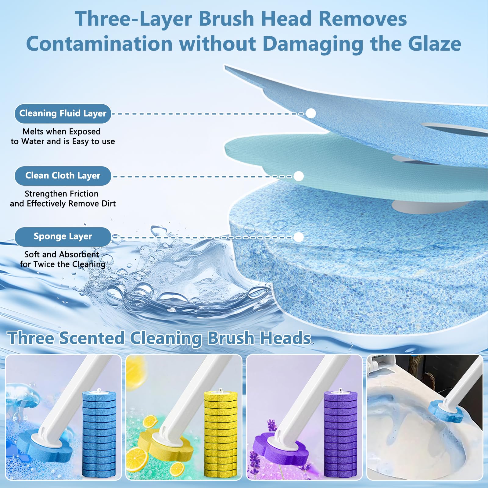• ????????EFFIZIENTES DEKONTAMINATIONS-MEHRFACHDUFTSET: Ausgestattet mit 36Einweg-Reinigungsbürstenköpfen, die nicht nur in ausreichender Menge vorhanden sind, sondern auch drei Düfte bieten: 12Ozean, 12Zitrone und 12Lavendel, um den Vorlieben verschiedener Benutzer gerecht zu werden . Der dreischichtig gestaltete Schwammkopf verstärkt die Reinigungswirkung und schützt gleichzeitig die Toilettenglasur vor Beschädigungen. das sich bei Wassereinwirkung auflöst, erleichtert die anschliessende Reinigung.