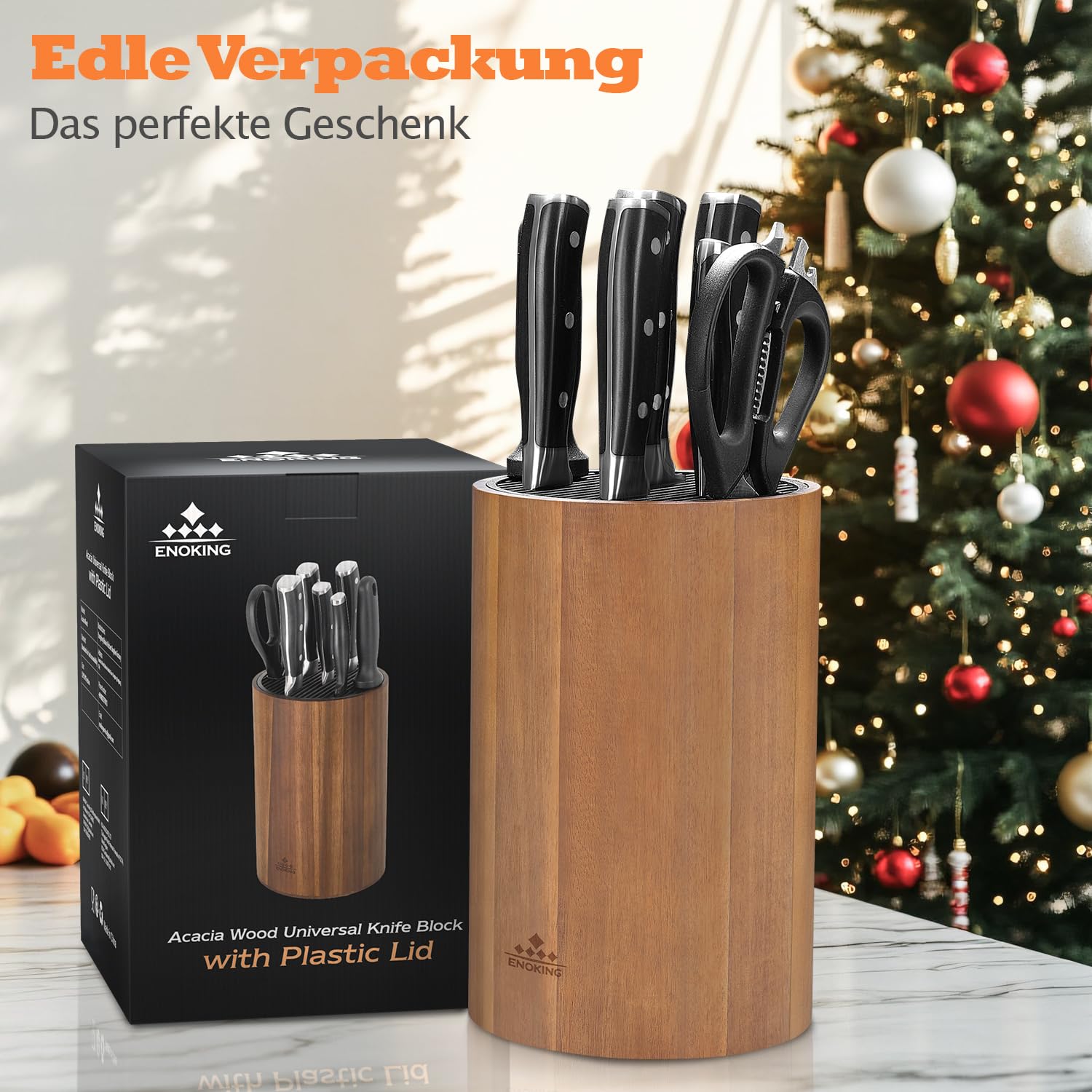 ENOKING Messerblock Ohne Messer, Universal Messerblock mit Schlitzen für Scheren und Schärfstab, Runder Messerhalter aus Akazienholz, Unbestückte Messerblöcke für Messeraufbewahrung