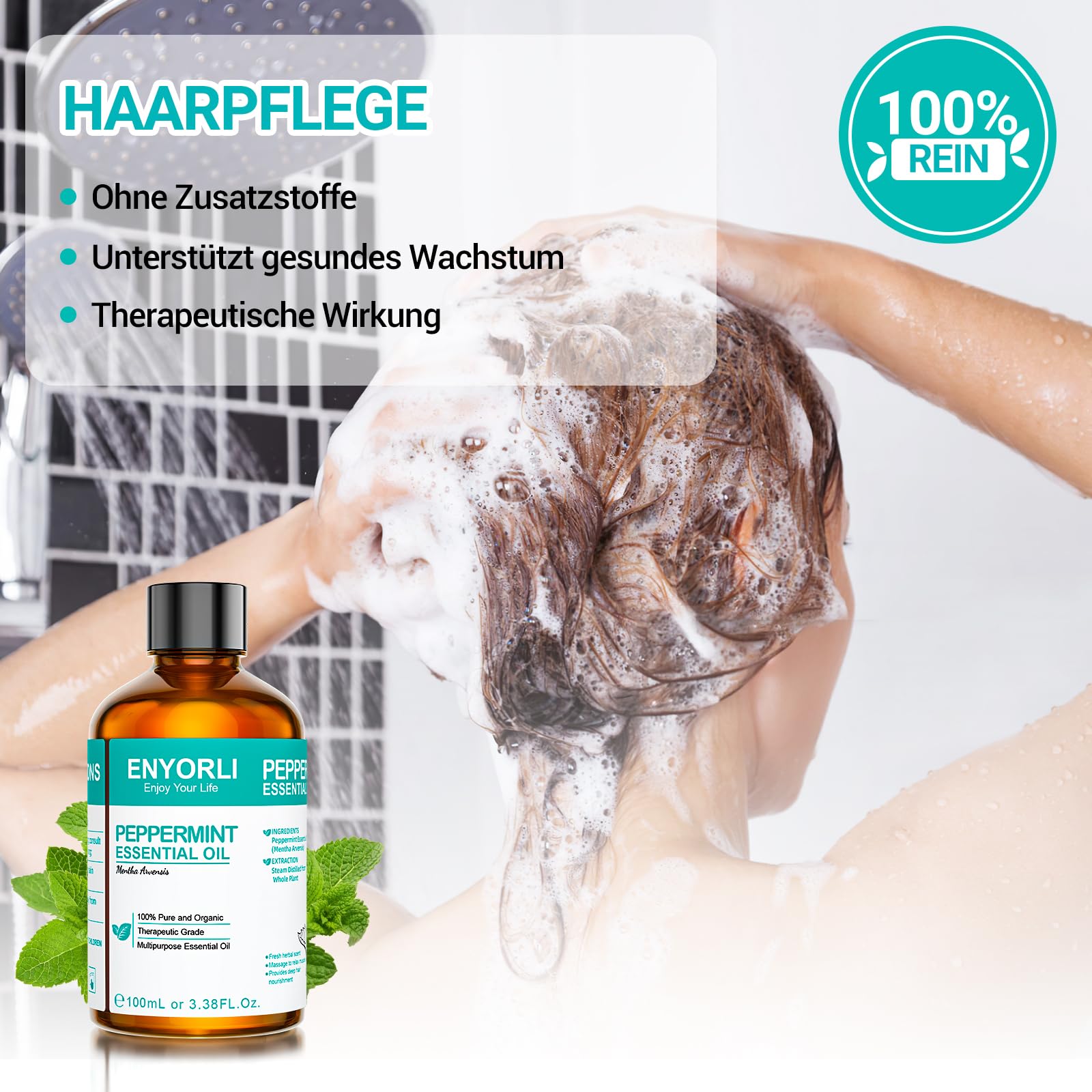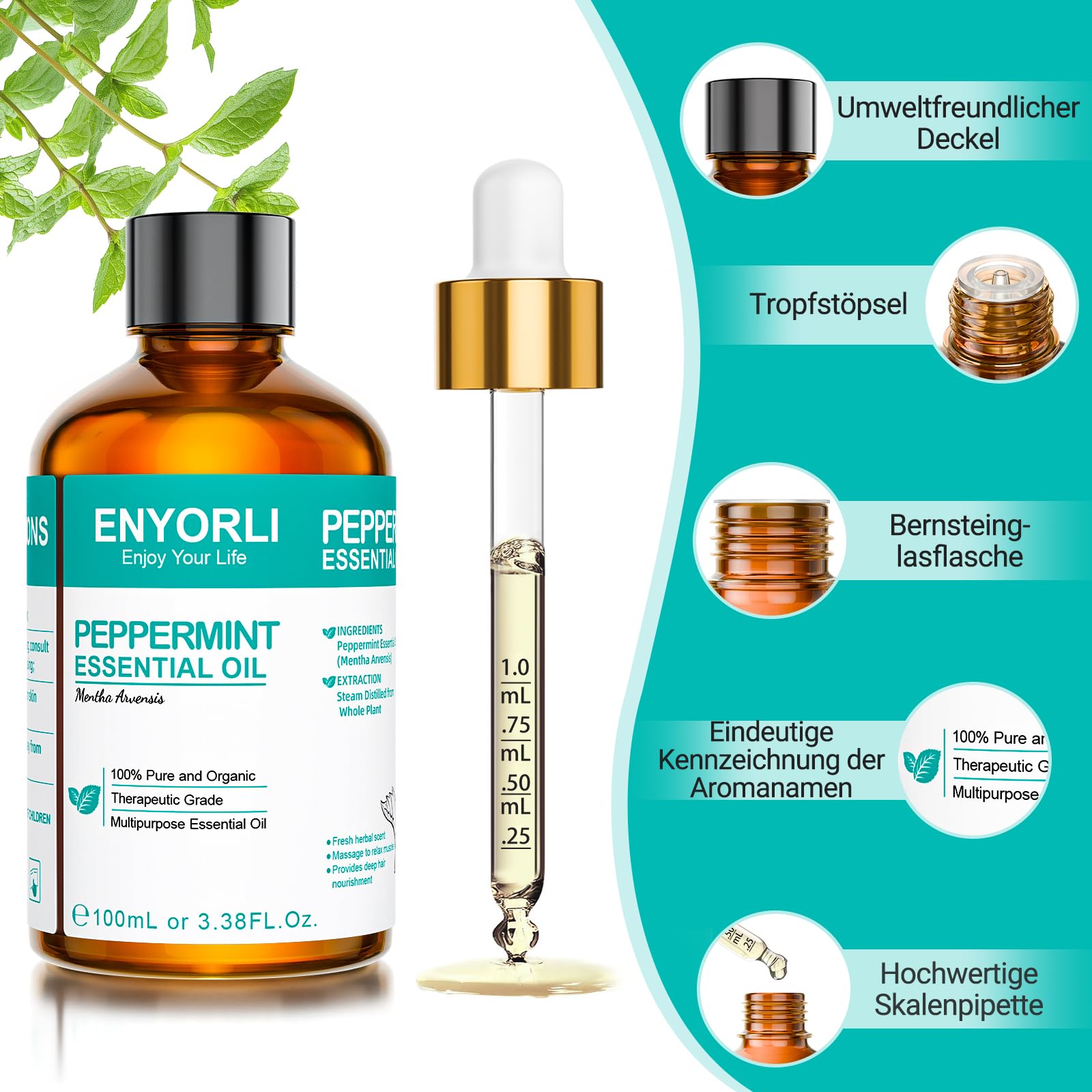 ENYORLI Ätherisches Pfefferminzöl 100ml Pfefferminzöl 100% Natürlich für Haut, Gesicht, Haare, Aromatherapie, Diffusoren, Kerzenherstellung, Massage, Hauspflege, äussere Anwendung mit Pipette
