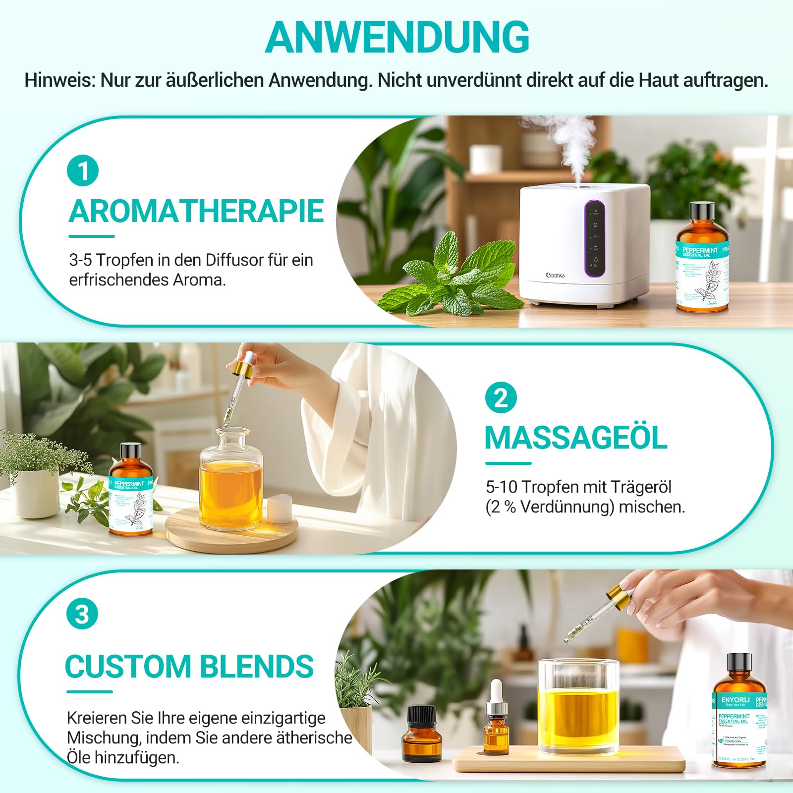 Bringen Sie mit ENYORLI Pfefferminzöl natürliche Frische und Energie in jeden Moment. Warum ENYORLI Pfefferminzöl?Für die Hautpflege: Dank seiner kühlenden und beruhigenden Eigenschaften kann Pfefferminzöl bei Hautirritationen helfen, Schwellungen lindern und eine wohltuende Erfrischung bieten. Perfekt geeignet für DIY-Lotionen, Cremes oder Badezusätze.Kopfschmerzen und Verspannungen: Ein paar Tropfen auf die Schläfen oder den Nacken aufgetragen, können Kopfschmerzen gelindert und Muskelverspannungen effektiv gelöst werden.Aromatherapie: Beim Vernebeln wirkt Pfefferminzöl stimmungsaufhellend, steigert die Konzentration und fördert mentale Klarheit, ideal für einen produktiven Arbeitstag oder eine meditative Auszeit.100 % rein & ohne Zusätze: Unser ätherisches Pfefferminzöl ist frei von künstlichen Stoffen, nur das Beste aus der Natur. Wie wird ENYORLI Pfefferminzöl verwendet?Zur Verdünnung: Mischen Sie es mit einem Trägeröl, um es direkt auf die Haut aufzutragen.Für Diffuser: Geben Sie 3-5 Tropfen in Ihren Diffuser und geniessen Sie den klaren, belebenden Duft.Als Massageöl: Verdünnt für eine entspannende Massage nach dem Sport.In DIY-Projekten: Kreieren Sie eigene Badezusätze, Kerzen oder Hautpflegeprodukte. Hinweise zur Anwendung:1. Nur zur äusserlichen Anwendung.2. Vor der Anwendung von ätherischem Pfefferminzöl auf einer grossen Hautfläche, nehmen Sie 1 Tropfen des Öls und tragen Sie eine kleine Menge auf eine kleine Hautfläche mit 10 ml Trägeröl für einen Patch-Test auf. Warten Sie 24 Stunden und achten Sie auf eventuelle unerwünschte Reaktionen. Bei Auftreten von Unwohlsein die Anwendung abbrechen.3. Von Haustieren und Kindern fernhalten.4. Den Kontakt mit Augen und Mund vermeiden.5. Vor der Anwendung durch schwangere Frauen einen Arzt konsultieren. Das