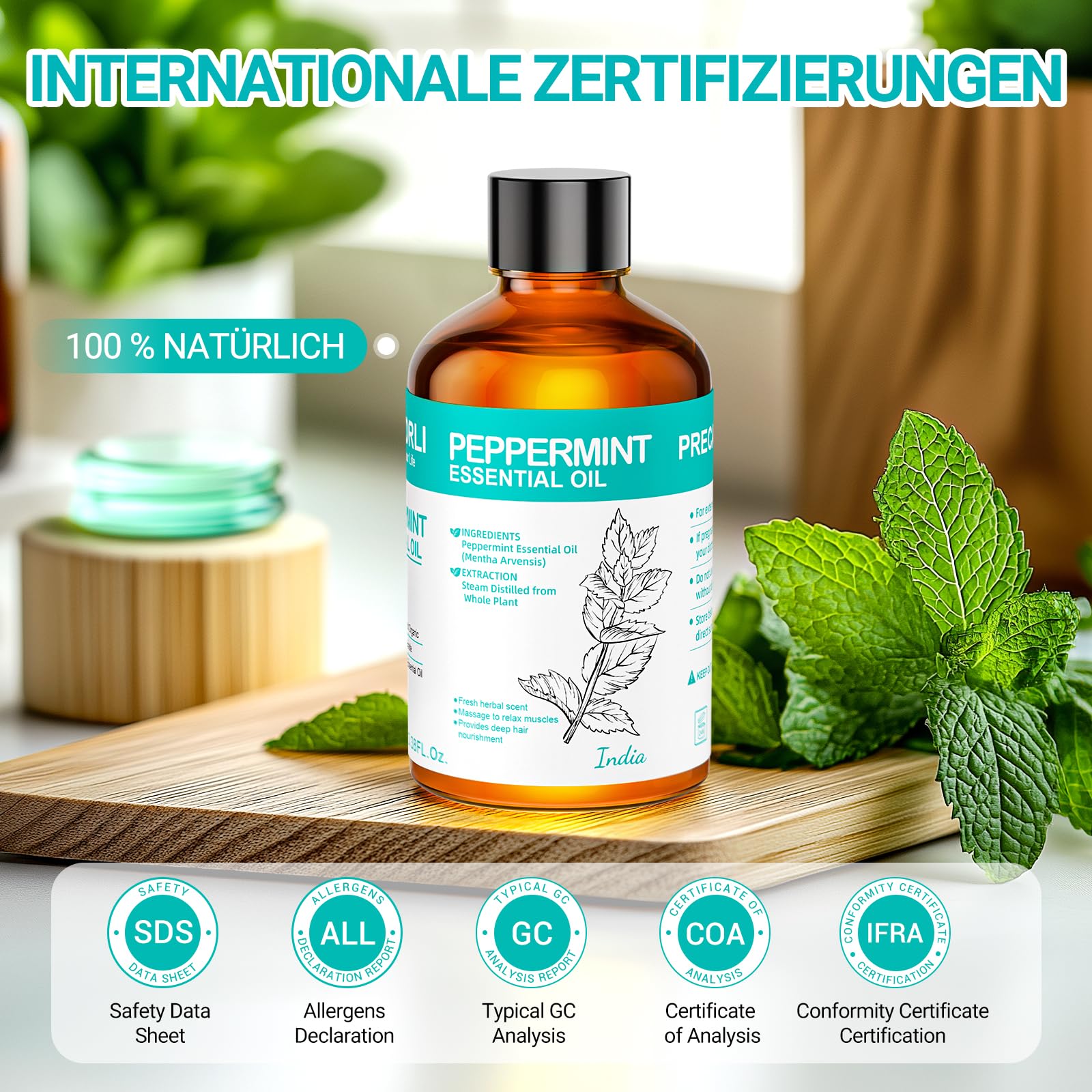 • Sicherheitshinweise: Ätherisches Pfefferminzöl nur zur äusseren Anwendung geeignet. Vor der Nutzung stets verdünnen und einen Hautverträglichkeitstest durchführen. Schwangere und stillende Frauen sollten vor der Anwendung einen Arzt konsultieren